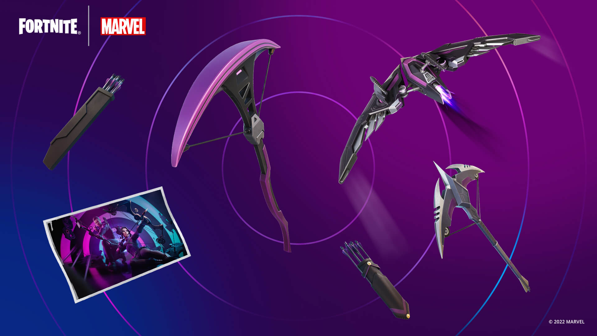 Former Avenger Hawkeye (a.k.a. Clint Barton) and his archer superfan Kate Bishop are setting their sights on the Fortnite Island. And these are just two of the items from the new Hawkeye Set! Players can purchase the Outfits (+ Back Blings), Pickaxes, and Glider individually or as part of the Hawkeye Bundle. This bundle additionally includes the Hawkeyes Loading Screen. The following accessories are available in the Item Shop as well:
