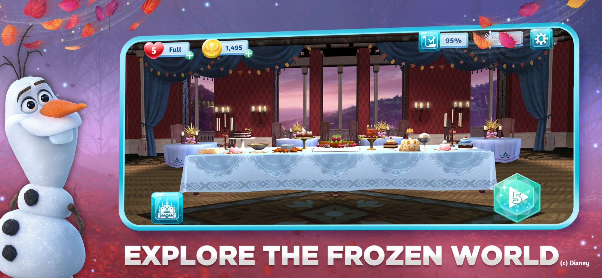 The epic world of Frozen comes to life in Frozen Adventures, a dynamic & captivating new puzzle matching adventure game inviting you to design and decorate Arendelle Castle. Players will join Elsa, Anna, Kristoff, Sven and Olaf as they explore the Kingdom, customize the castle, and immerse themselves in new and familiar locations throughout Arendelle and beyond.