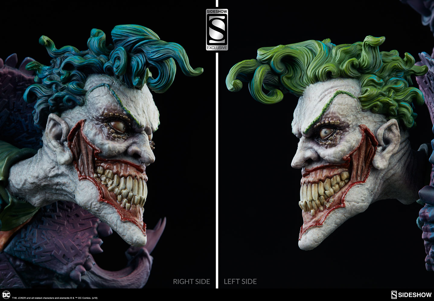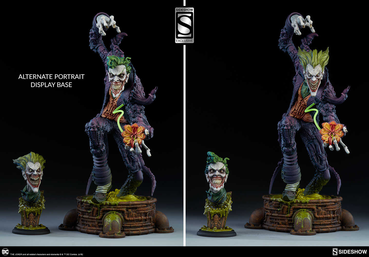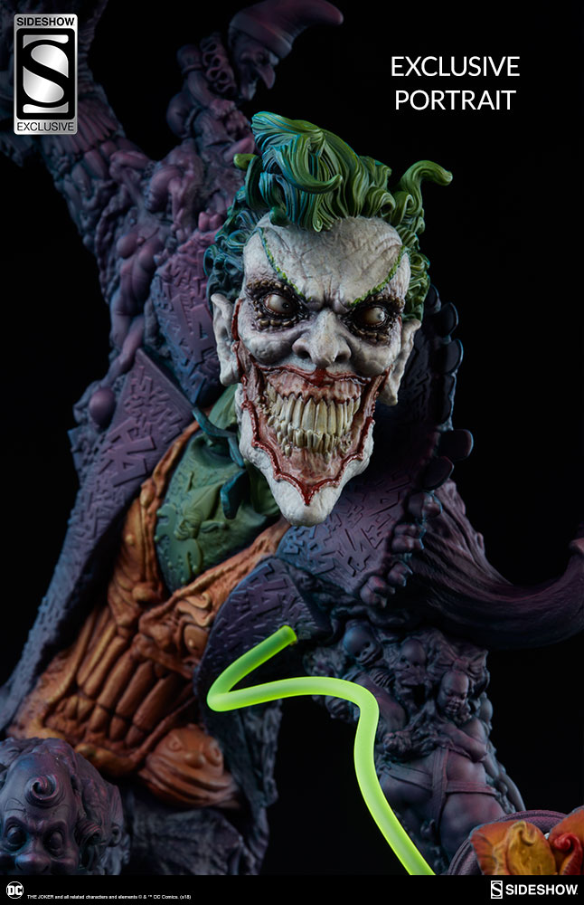 The Exclusive edition of The Joker comes with a swap-out portrait revealing another face of his nightmarish insanity, with a closed mouth and curled green hair. The Exclusive edition also includes a small pedestal for displaying the alternate portrait, a jack-in-the-box bubbling over with noxious chemicals.