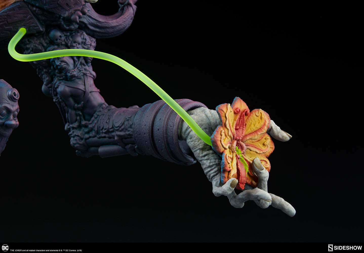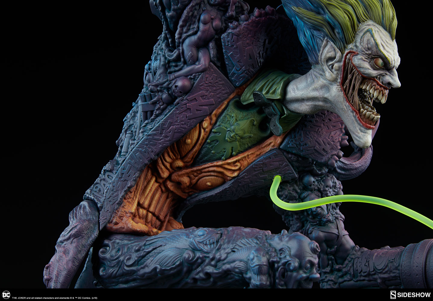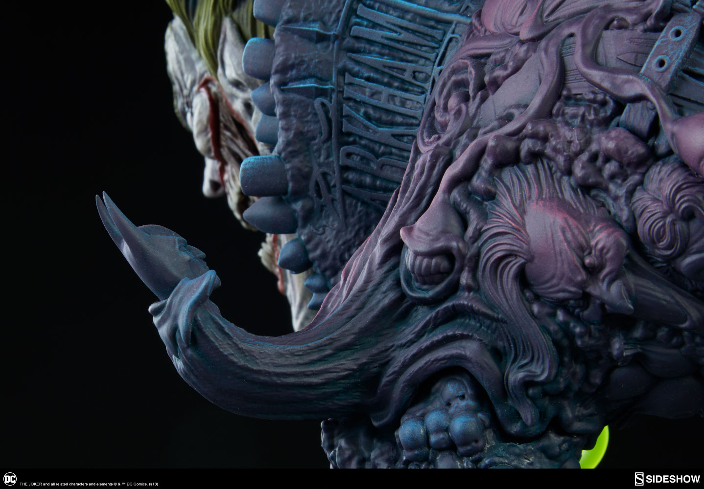 The Exclusive edition of The Joker comes with a swap-out portrait revealing another face of his nightmarish insanity, with a closed mouth and curled green hair. The Exclusive edition also includes a small pedestal for displaying the alternate portrait, a jack-in-the-box bubbling over with noxious chemicals.