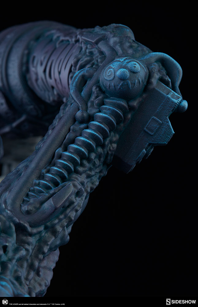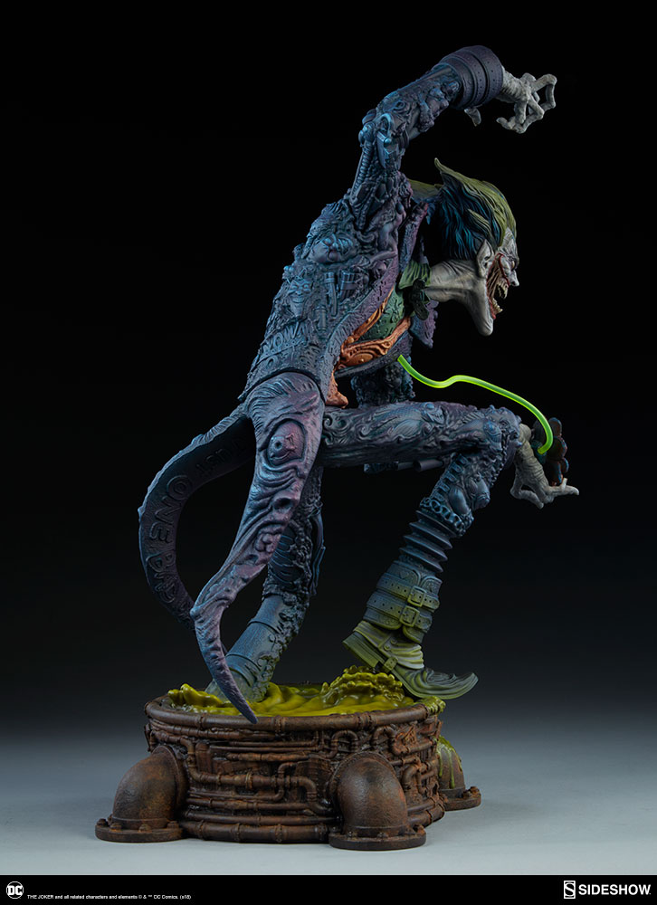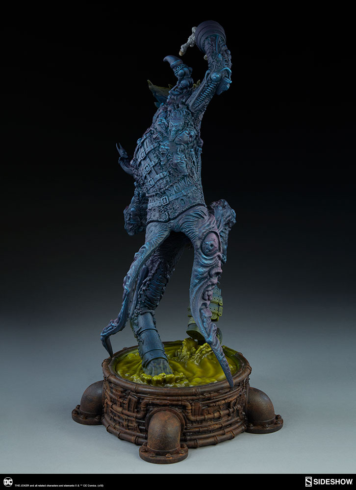 The Joker Statue measures 20" tall, emerging from a chemical vat filled with venomous green acid. Beneath copper-colored pipes, the architecture for Gotham City can be seen laying the groundwork for the rise of this nightmarish Clown Prince of Crime.