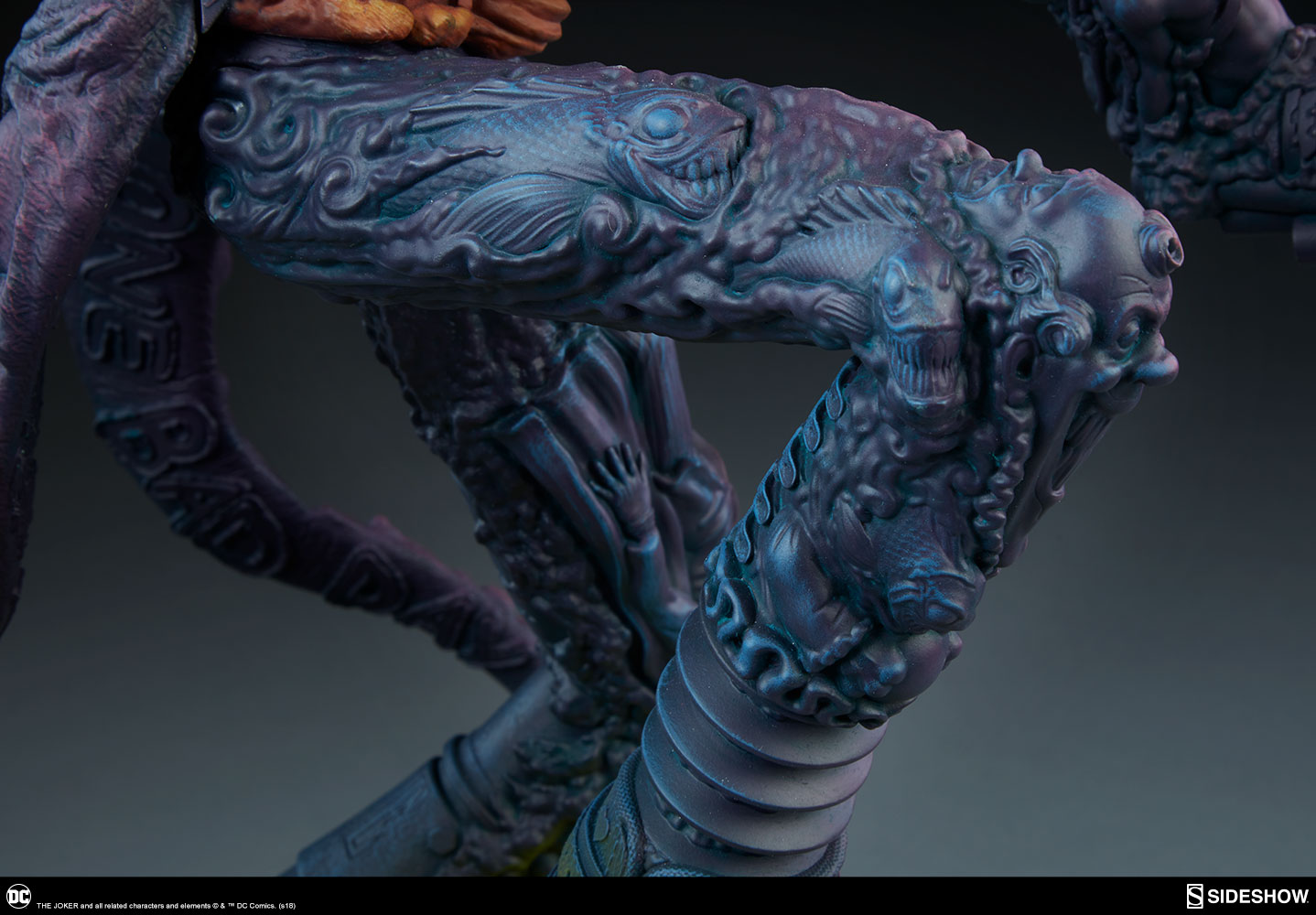 "We took the insanity of The Joker and made his entire makeup a tableaux of bas-relief Easter eggs of his entire existence," Creative Director Tom Gilliland explained.