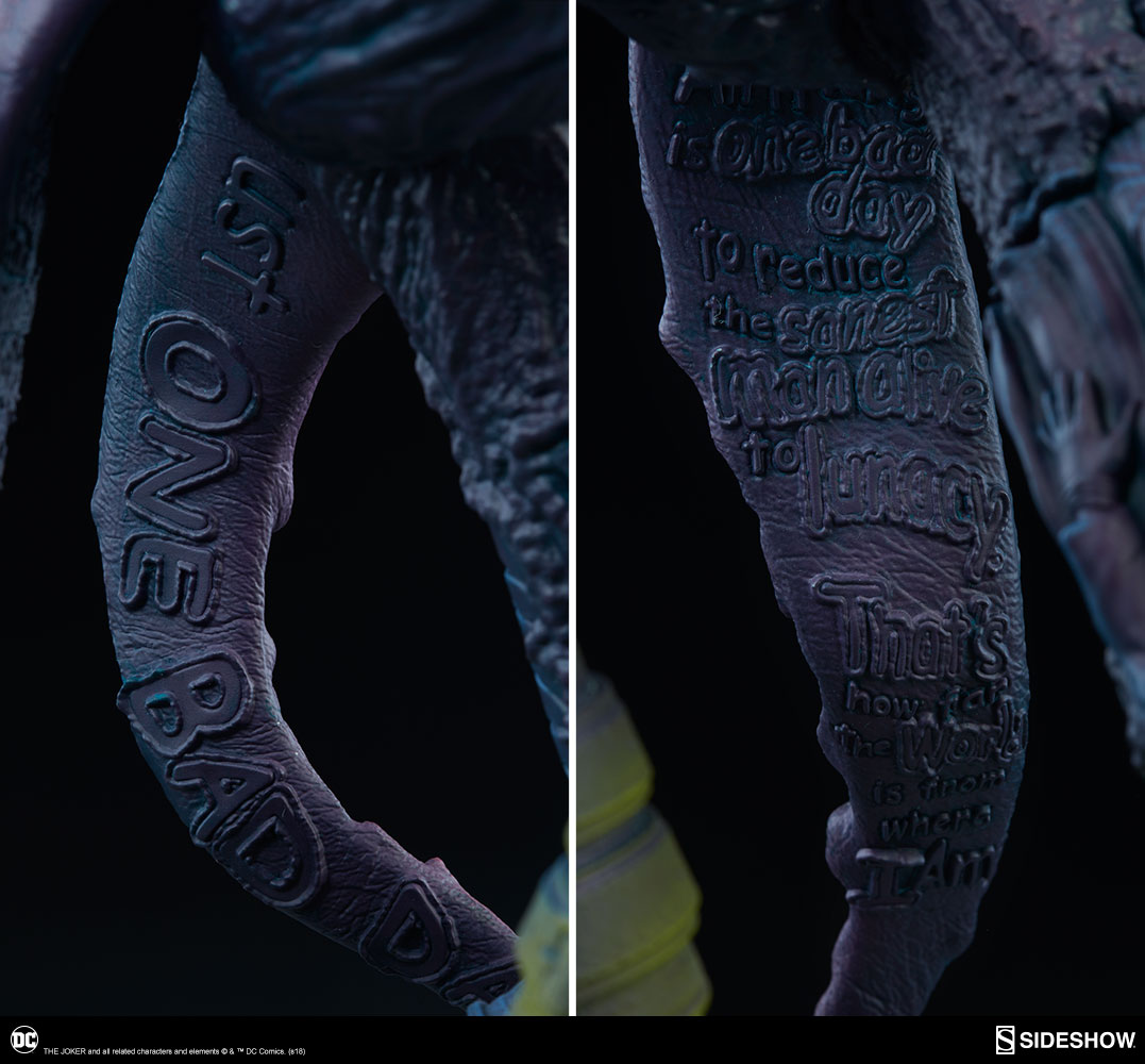 "All it takes is one bad day" to make this statue your most frightening nightmare yet! This intricate statue is bursting with brilliant details revealing just what makes The Joker who he is, sculpted in polystone with vinyl and PVC elements. From Ace Chemicals to the famed Arkham Asylum as his backbone, The Joker Statue will keep you captivated by the horror as you search for references to the some of the villain's most infamous moments.