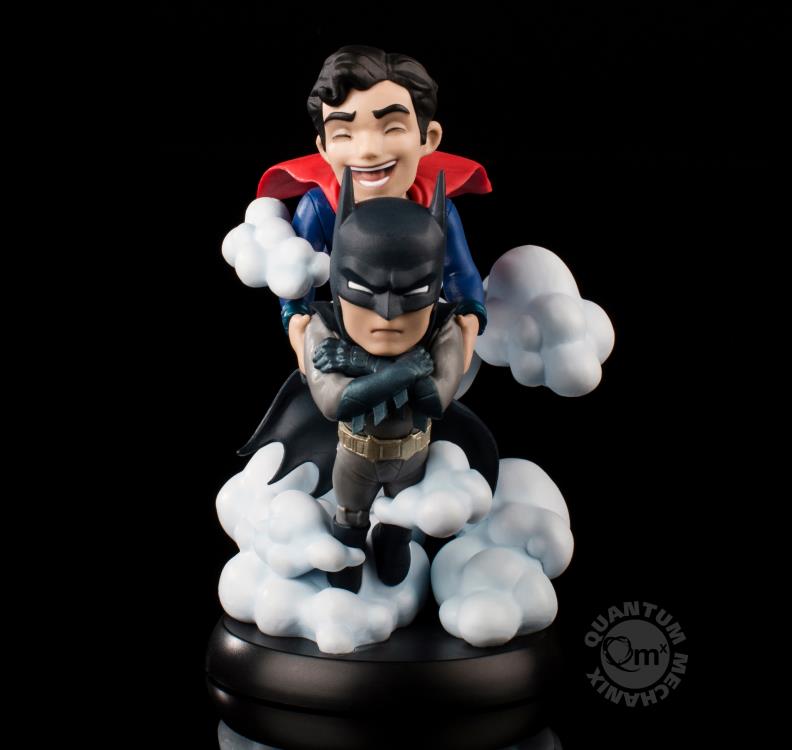 A smiling Superman carries the reluctant Batman through the clouds in the latest Q-Fig MAX from QMx.