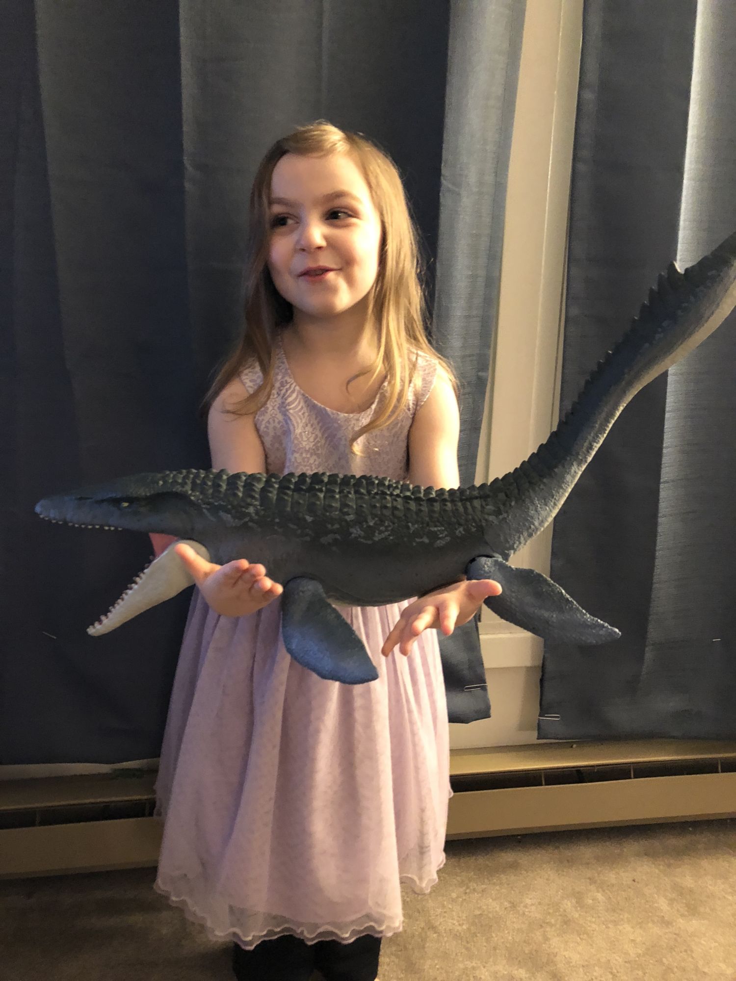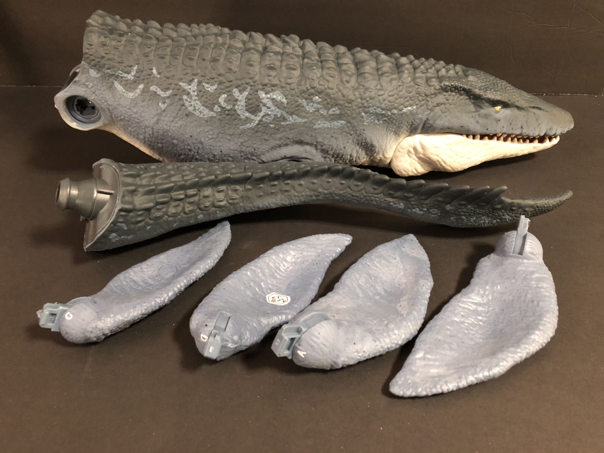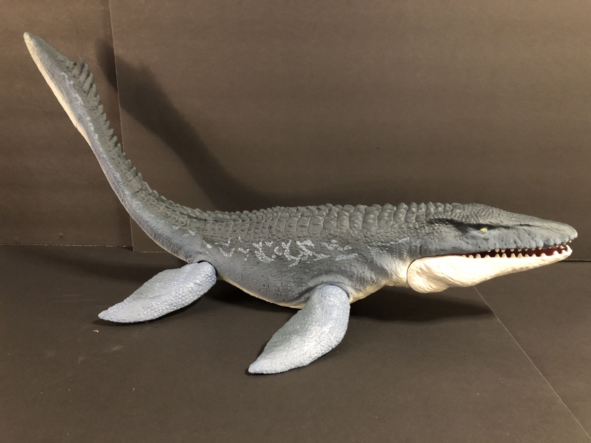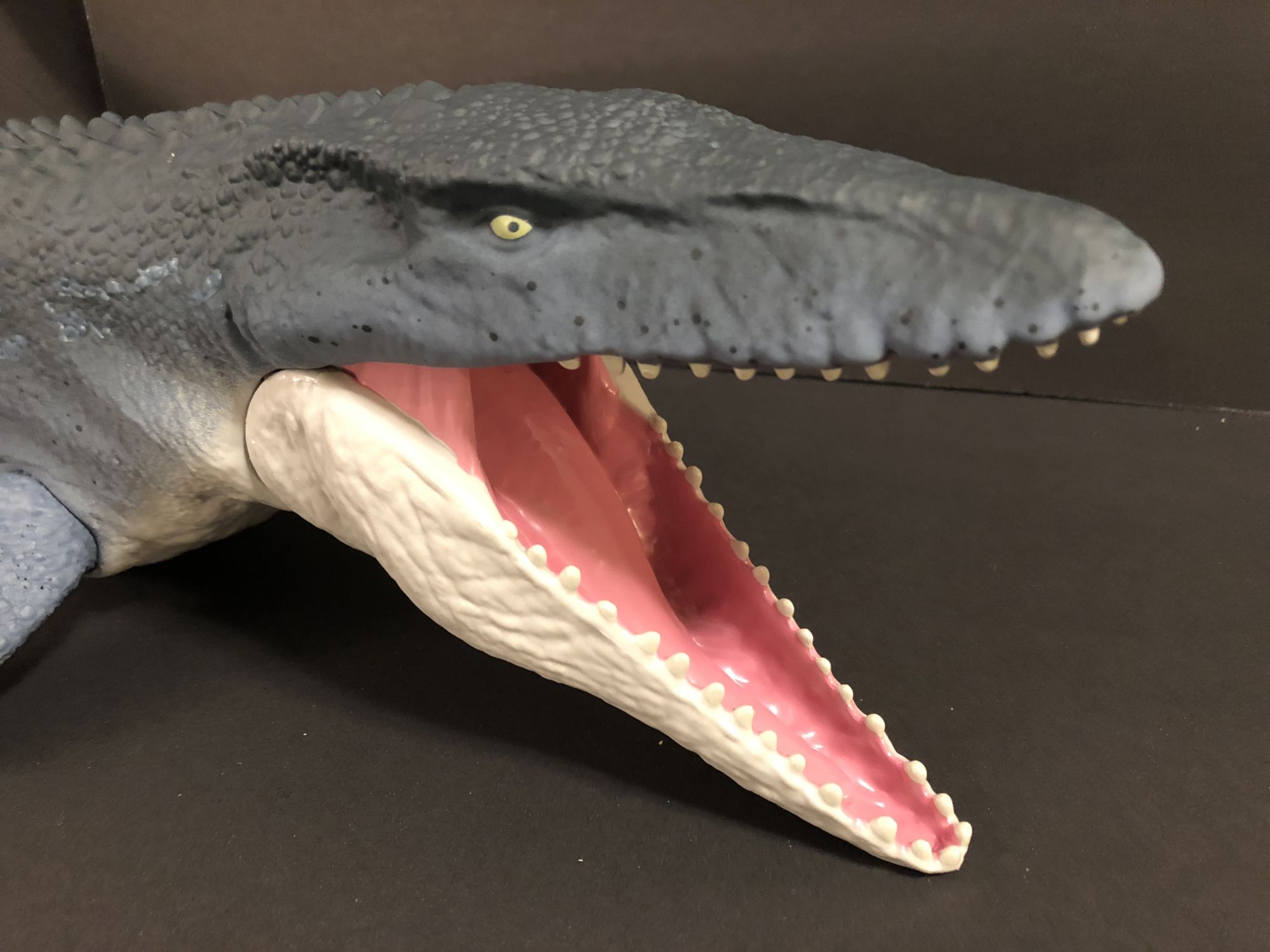 Next up was almost my favorite of the bunch here- the Mosasaurus. This thing is gigantic (as you can see from the picture of my five year old holding it). This dino is made of rubber, and is hollow on the inside. I was not expecting that. The fins and tail attach really easily. The fins move with ease, but sadly the tail stays in one position. A word to the wise- do not put this one in water. While it should have been made so that if would go in the water, it isn't. It has been days and we are still trying to get all of the water out. Even so however, this is a great figure, and at $30 you can't go wrong with this one.