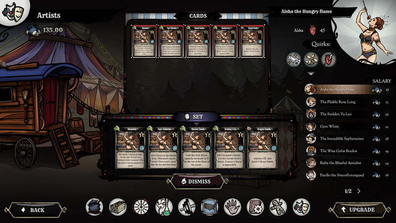 You take the role of an impoverished owner of a traveling Circus. Through your personal and multithreaded story, The Amazing American Circus reveals mysteries behind a uniquely American form of entertainment. Deliver a perfect show in a special card duel between you and the audience. Boredom is your enemy, and your performances and tricks are your best weapons. Choose your cards wisely and try to figure out the mood of the crowd. As a traveling Circus owner, you need to look for new troupe members. During your travels, you will try to gather an exotic crew of performers, but can you deliver the best shows, win the audience's approval, or will you fail?