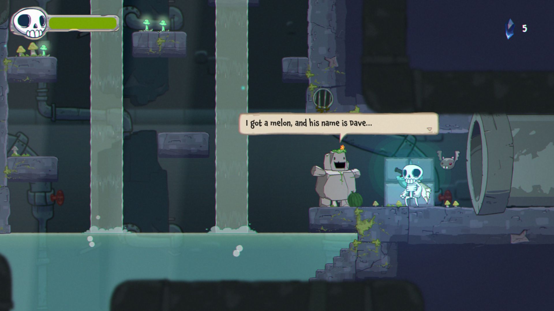 As a newly deceased member of the Underworld and resident in the happy hub of Aftervale, Skully is just getting the hang of being dead and coming to terms as a skeleton. As he prepares for his Remembrance to understand who he was in his past life, Skully finds himself in a fight to protect his home from plundering humans from above. In an attempt to steal the magic that kindles the spirits of the dead, the Blue Flame, the humans kidnap Aftervale's elder skeleton, Elzedon. Together with Imber, Skully's trusty bat friend, players will control both characters to jump, slash, and flap their way through the Underworld to stop the human threat, save the Elder, and protect the Blue Flame.