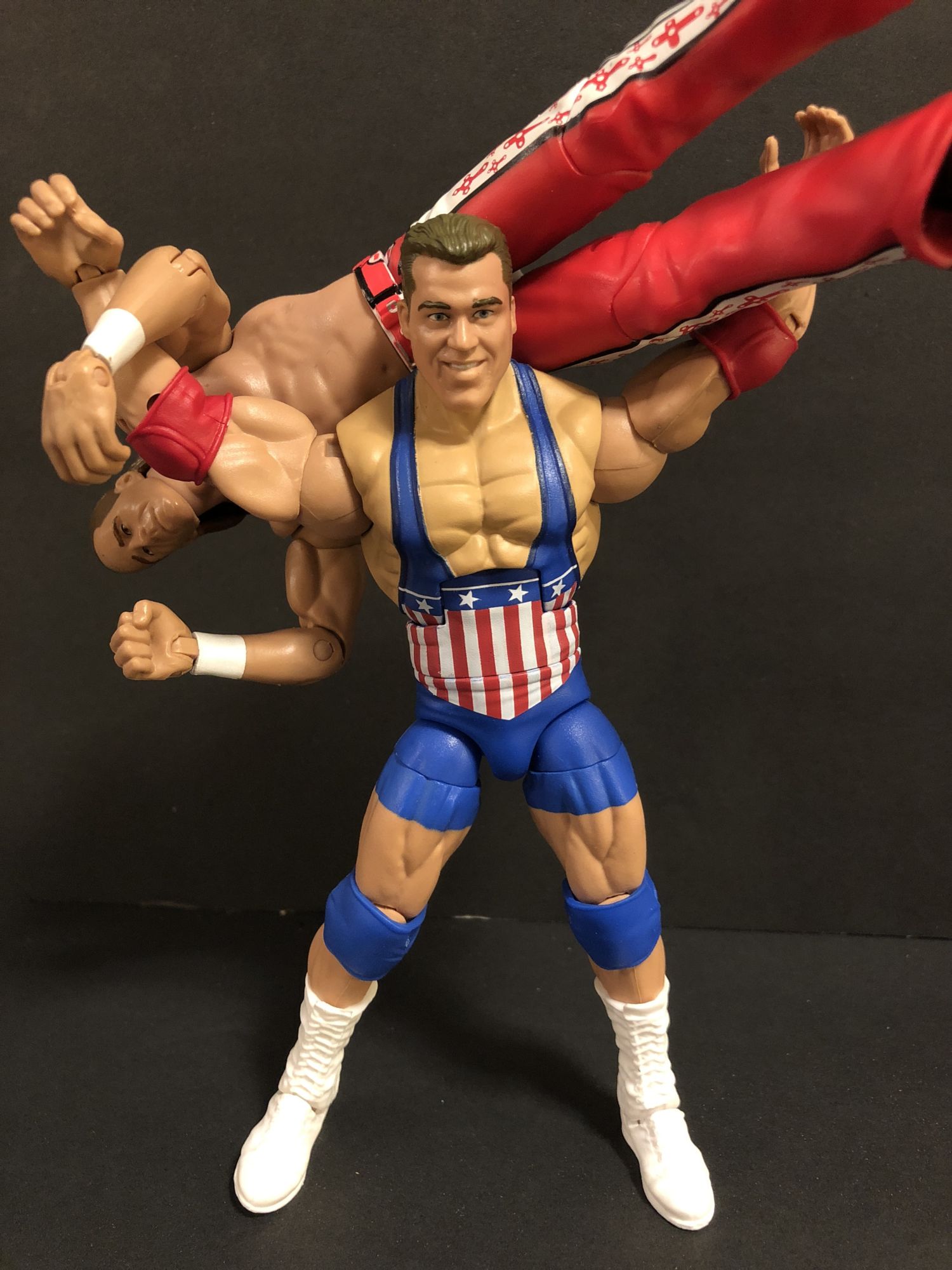 He comes with his two Gold Medals, which for obvious reasons do not have much detail on them. The likeness is great, they chose a good muscular buck for the body. I maybe would have gone with shorter arms, but thats ok. Be careful when choosing yours if in store, though — the paint aps are all over the place on his singlet. My store had four on the shelf and I lucked out getting one without paint bleed. There was a mark over his eye, but I got rid of it pretty easily.