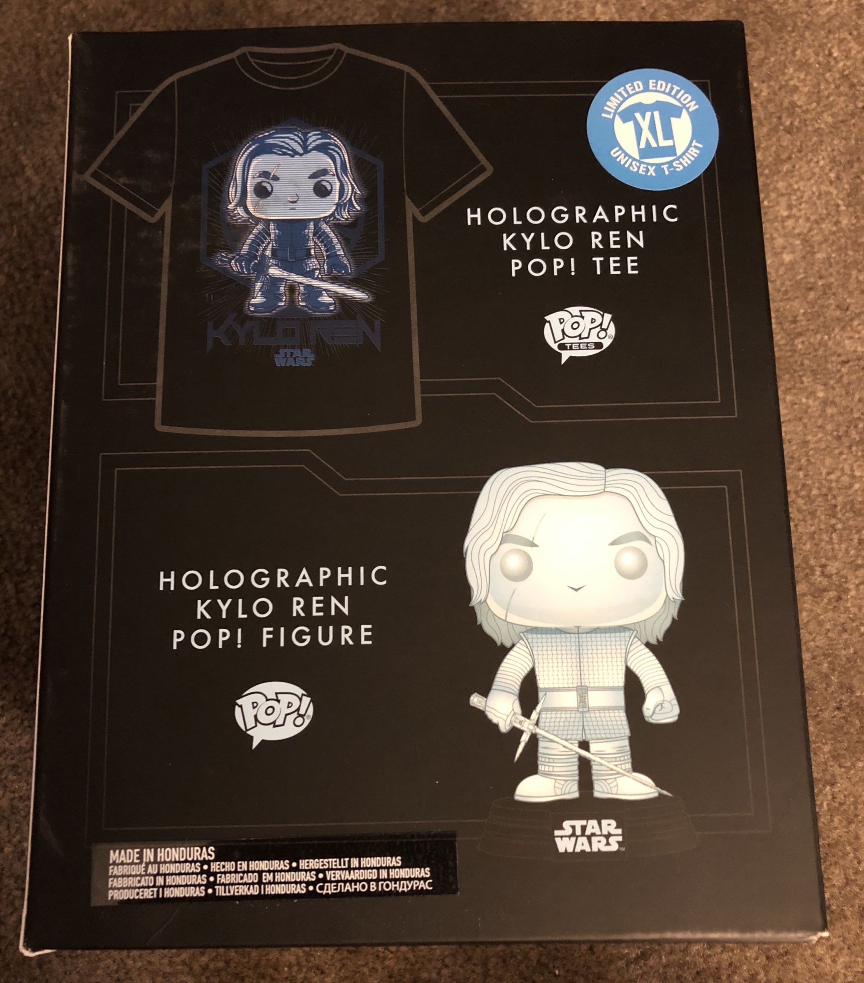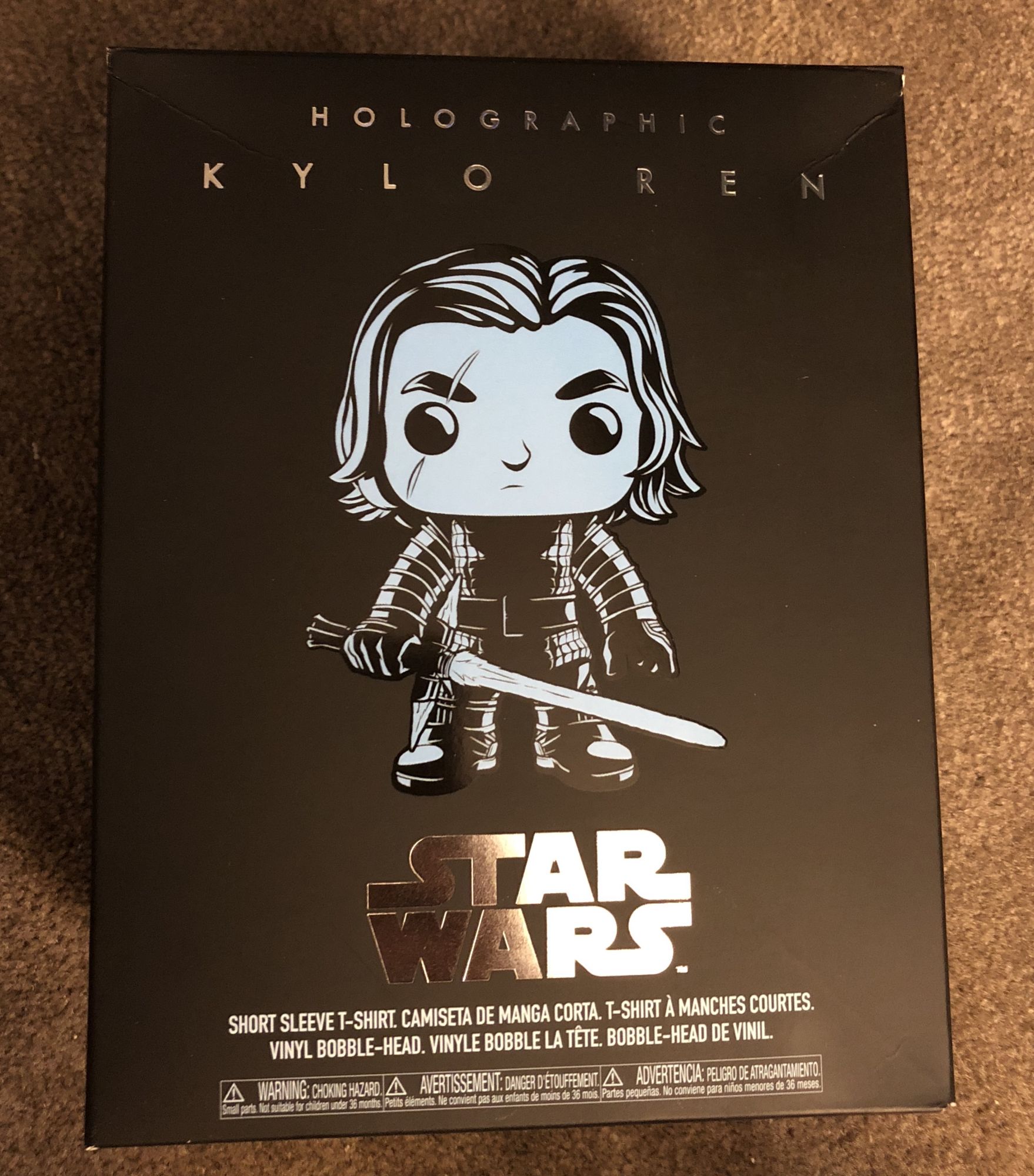 The shirt included is a standard Pop Tee. Basically just a picture of the Kylo Ren Pop inside with holographic blues and logos. It is a cool shirt, but I wish it was a blend instead of 100% cotton. Cotton tends to shrink and lose its shape faster. That drives me nuts, but they're mass producing these so fast that I guess I understand. Doesn't mean I have to like it, though.