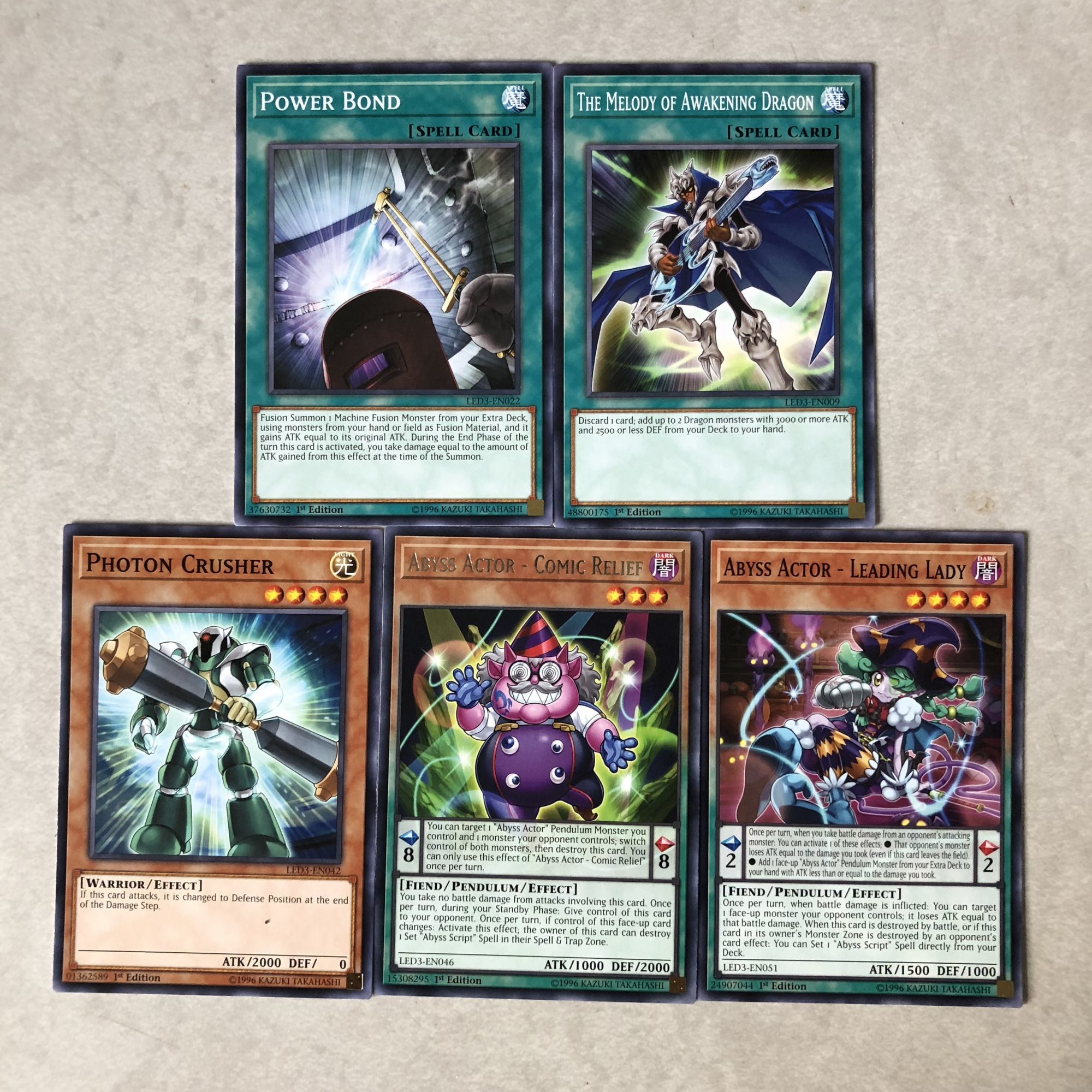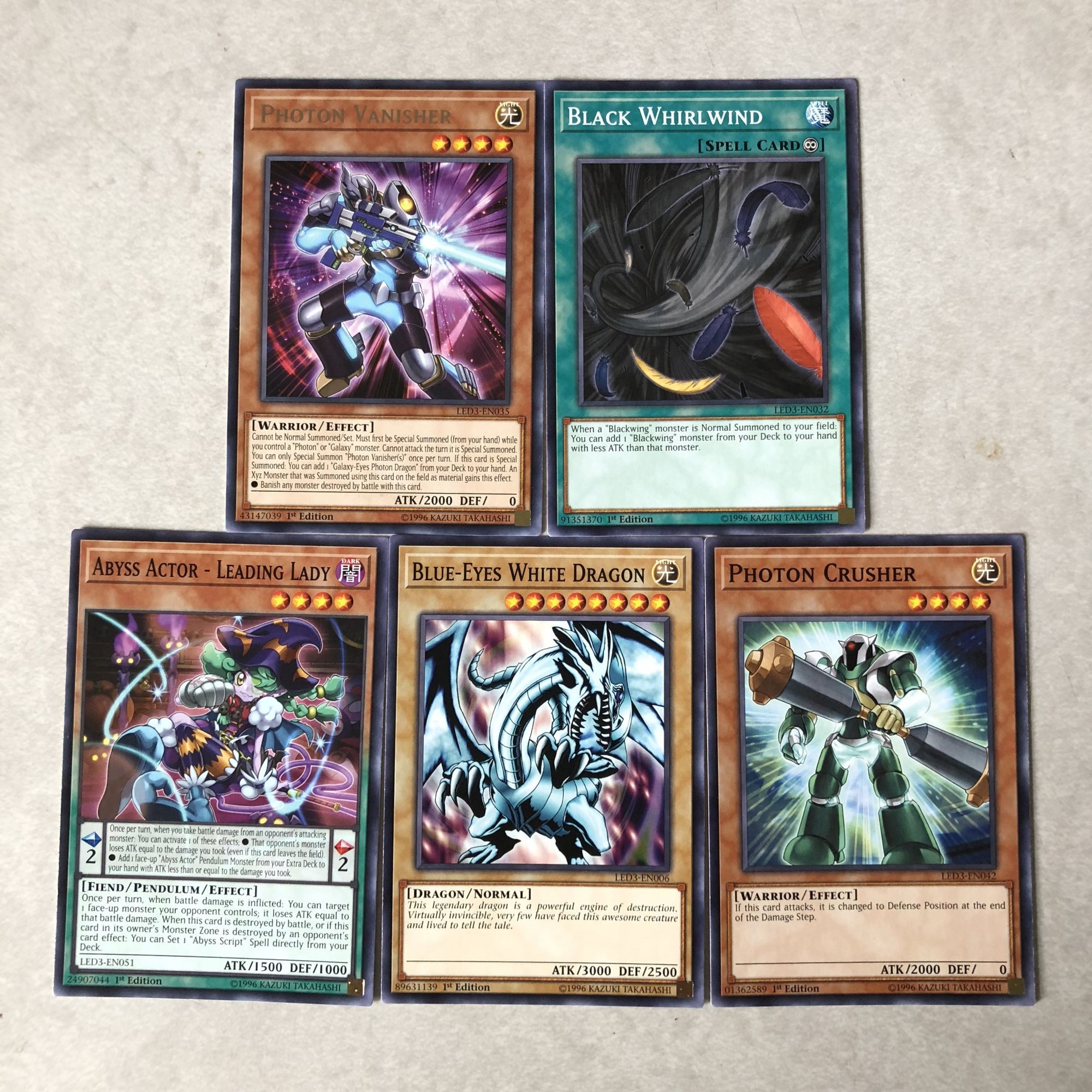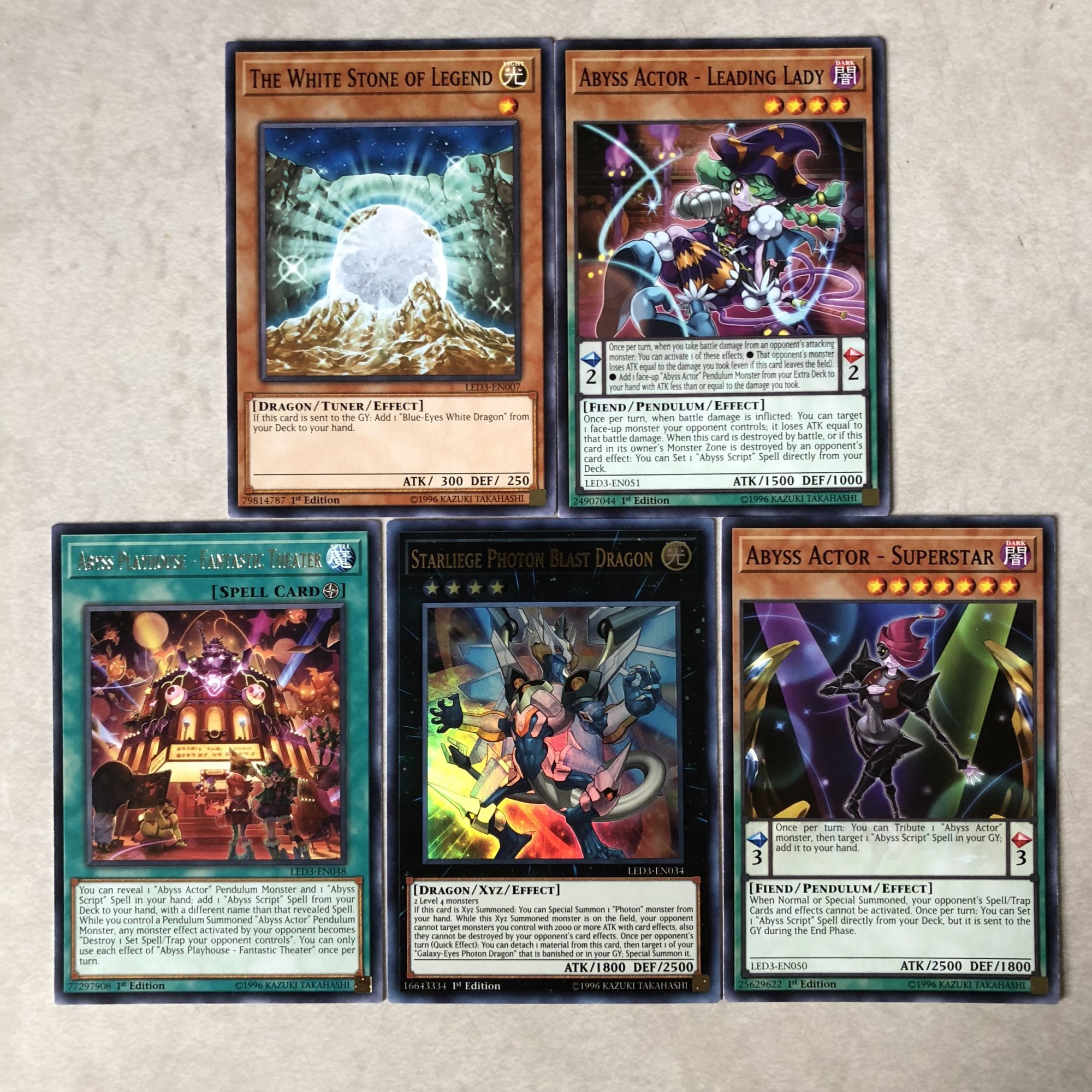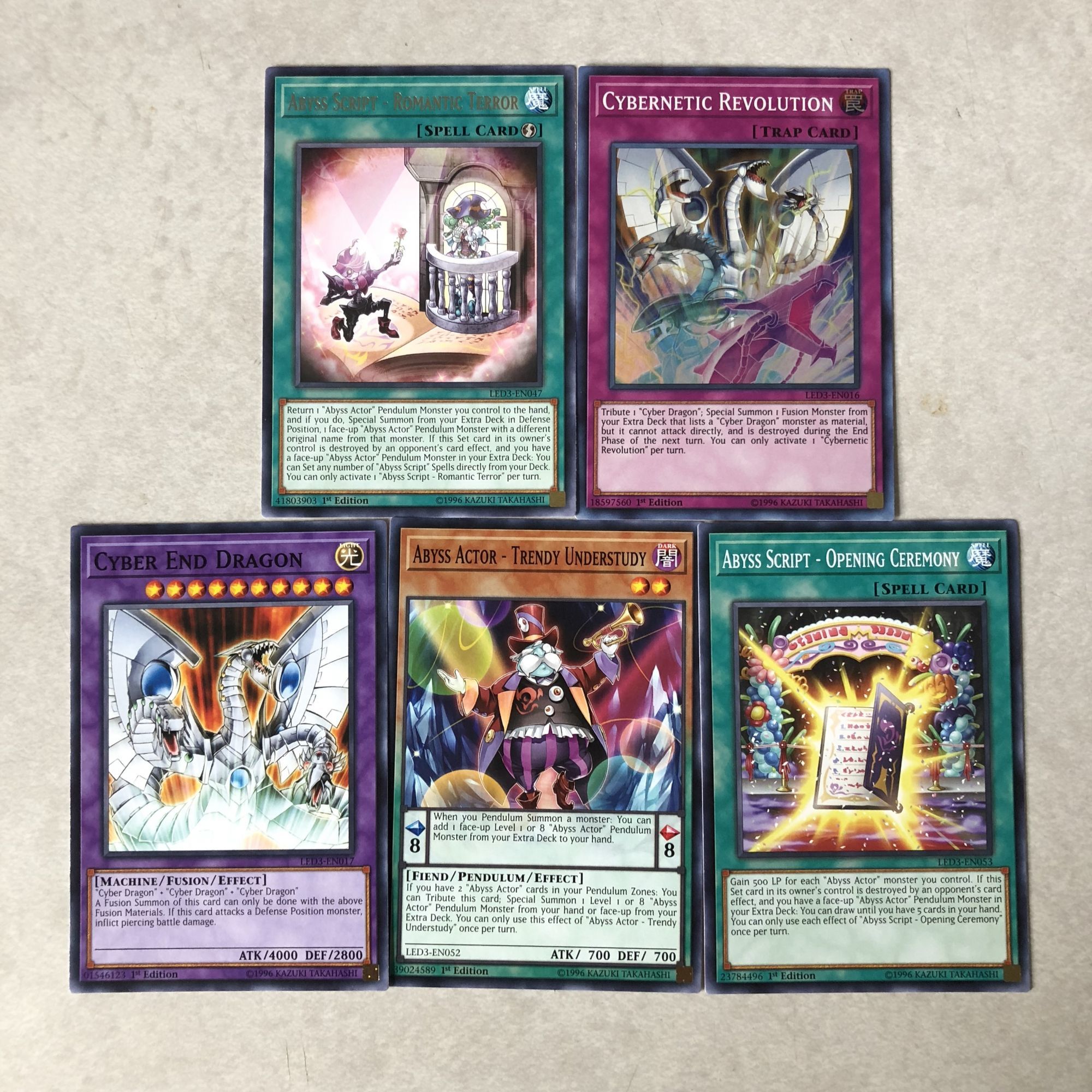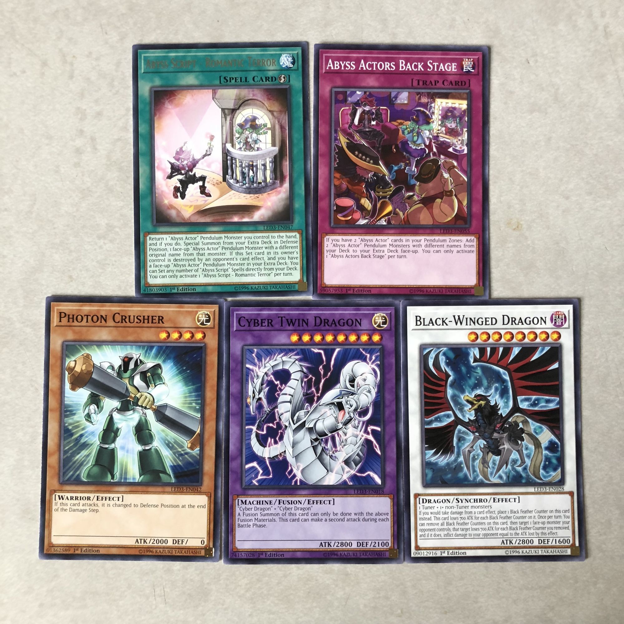 Just briefly going over what you see below, we got a pretty good sampling of material to play with. Most of it actually played into Abyss cards revolving around the theatre. A few Abyss Actor cards which produced some pretty decent creatures like Comic Relief and Leading Lady, as well as a couple Abyss Script cards. We got some pretty awesome dragons in the mix as well with a Black-Winged, a Cyber Twin, and a Starliege Photon Blast. Cybernetic Revolution was also a great find. Overall there was a lot to play with in here, but it definitely begs for more content beyond what you would need in a starter deck to build off of. It feels like I'd need to get a couple more boosters on top of these with a starter to get a really powerful deck rolling. So a good set of boosters, but you'd need to be really lucky to work with just five.