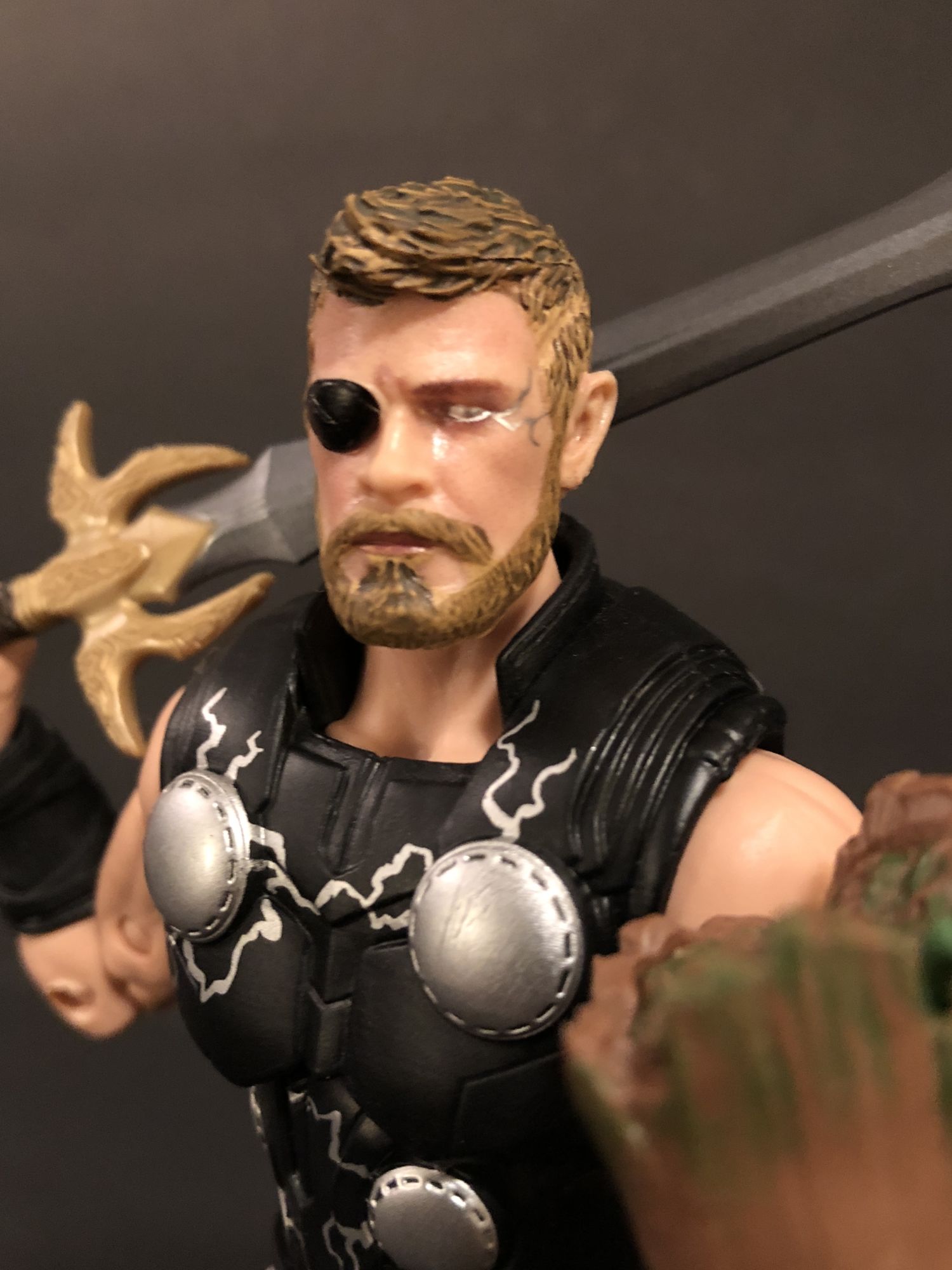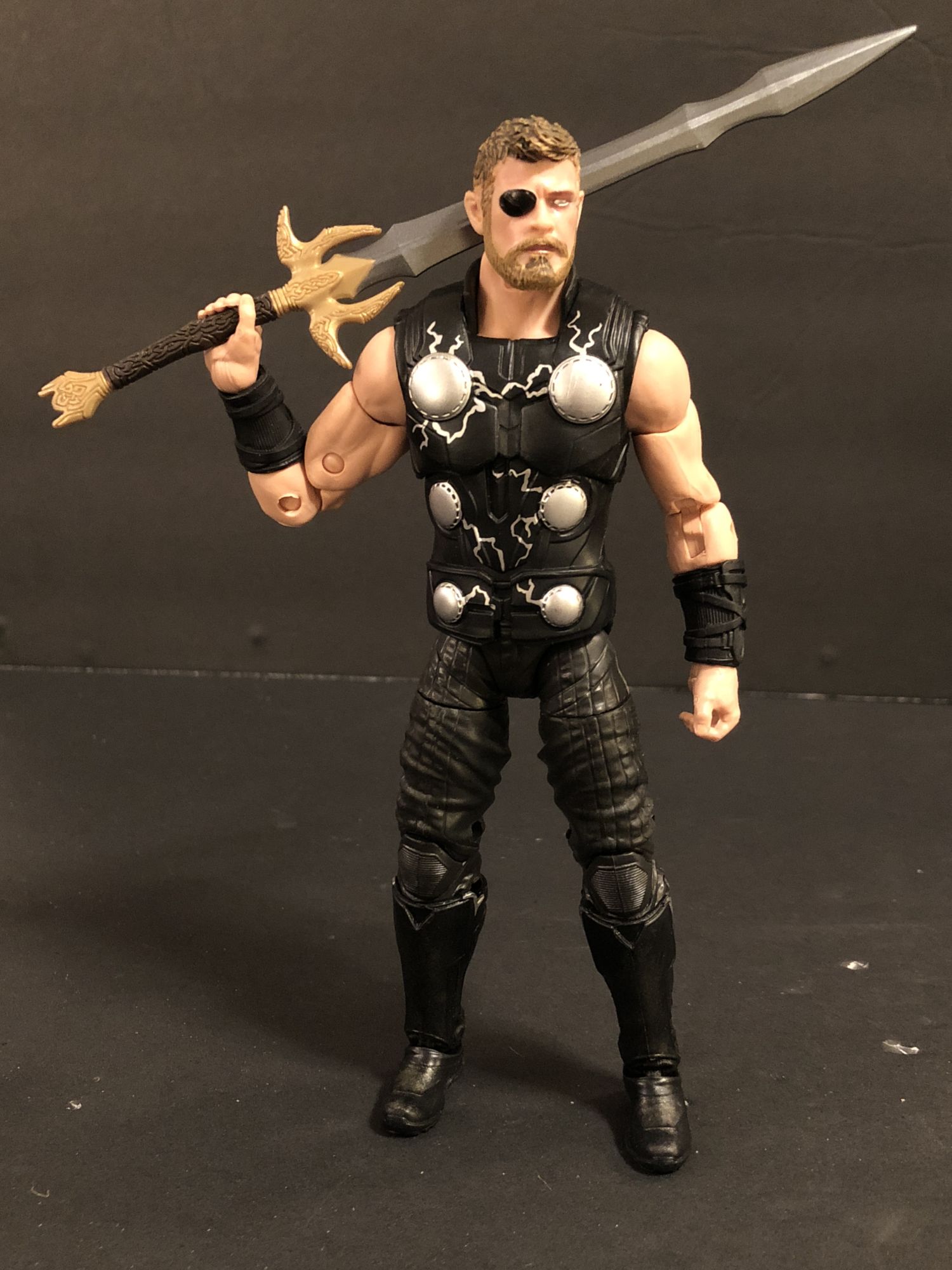 The standout is Thor. He comes with his giant sword for…reasons. I am guessing spoiler-type stuff, and that is why he doesn't have Stormbreaker (although the Avengers wave 2 figure does). Be that as it may, the lightning paint on his armor and around his eye is sweet, and painted extremely well. The body is a repaint of the Ragnarok Thor, and I loved that figure so no worries there. He stands really well and is quite flexible. I am glad to have this version from the film with the eye patch too, after this film I can't get enough Thors into my collection. With his poseability, excellent paint aps, and great Chris Hemsworth face portrait, this is my new favorite Thor Marvel Legends MCU figure.