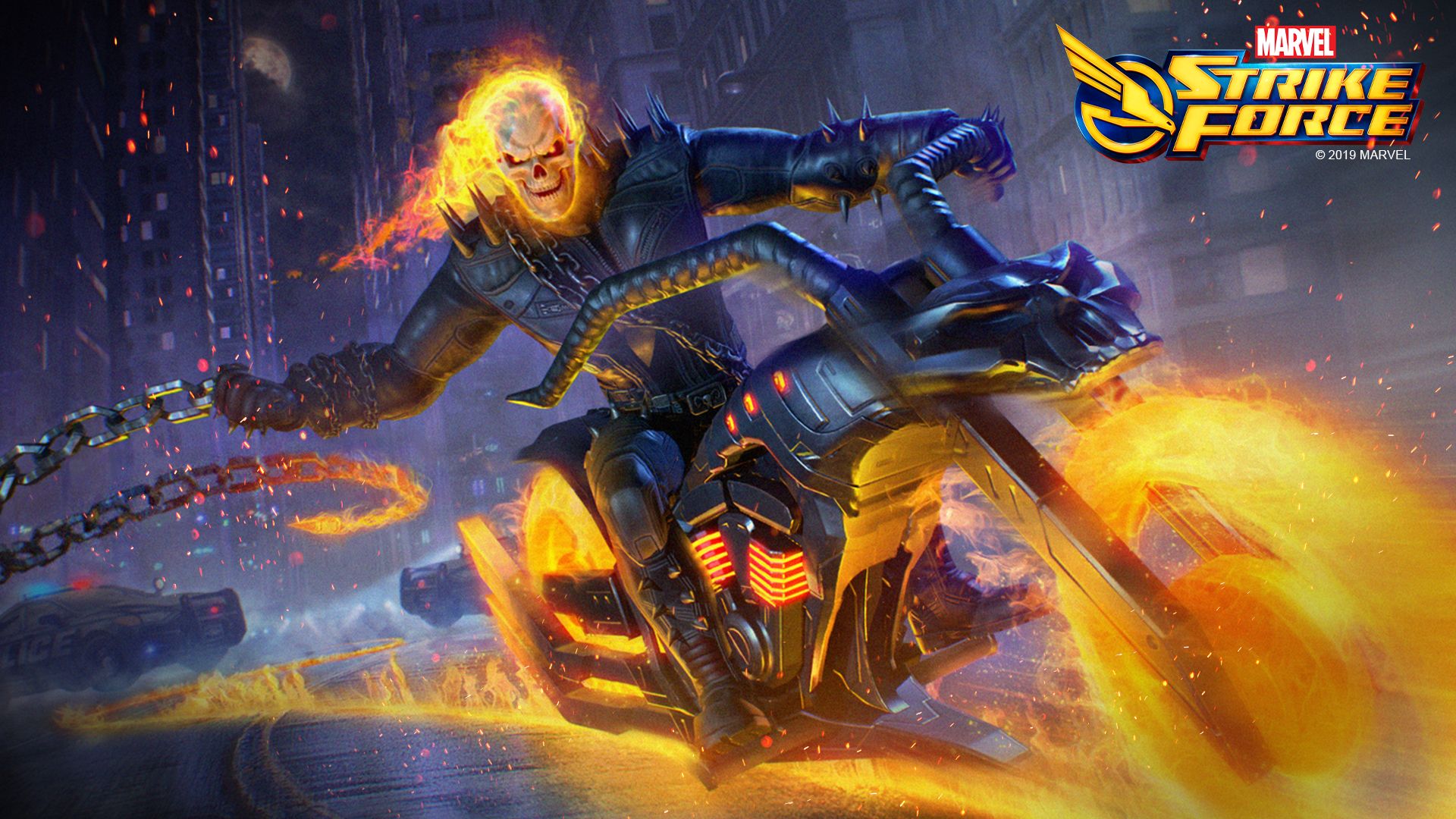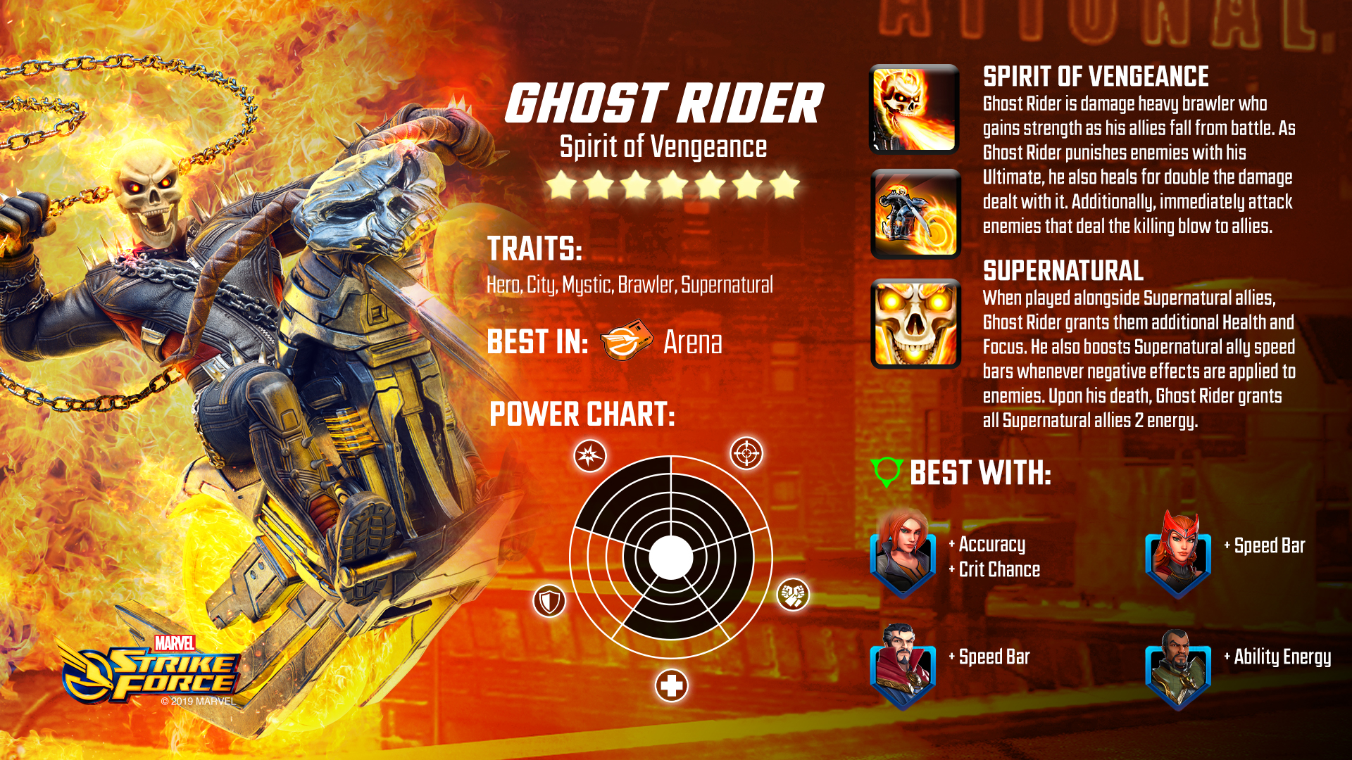 Ghost Rider blazes into Marvel Strike Force equipped with a hellfire chain whip to unleash justice on his enemies. As a member of the new Supernatural team, he punishes souls of the wicked with his iconic "Penance Stare" to drastically damage enemies and drain their health.