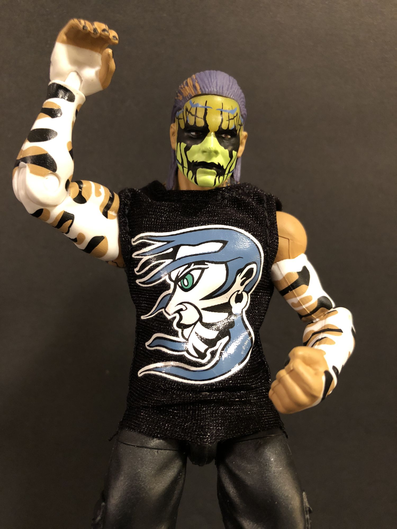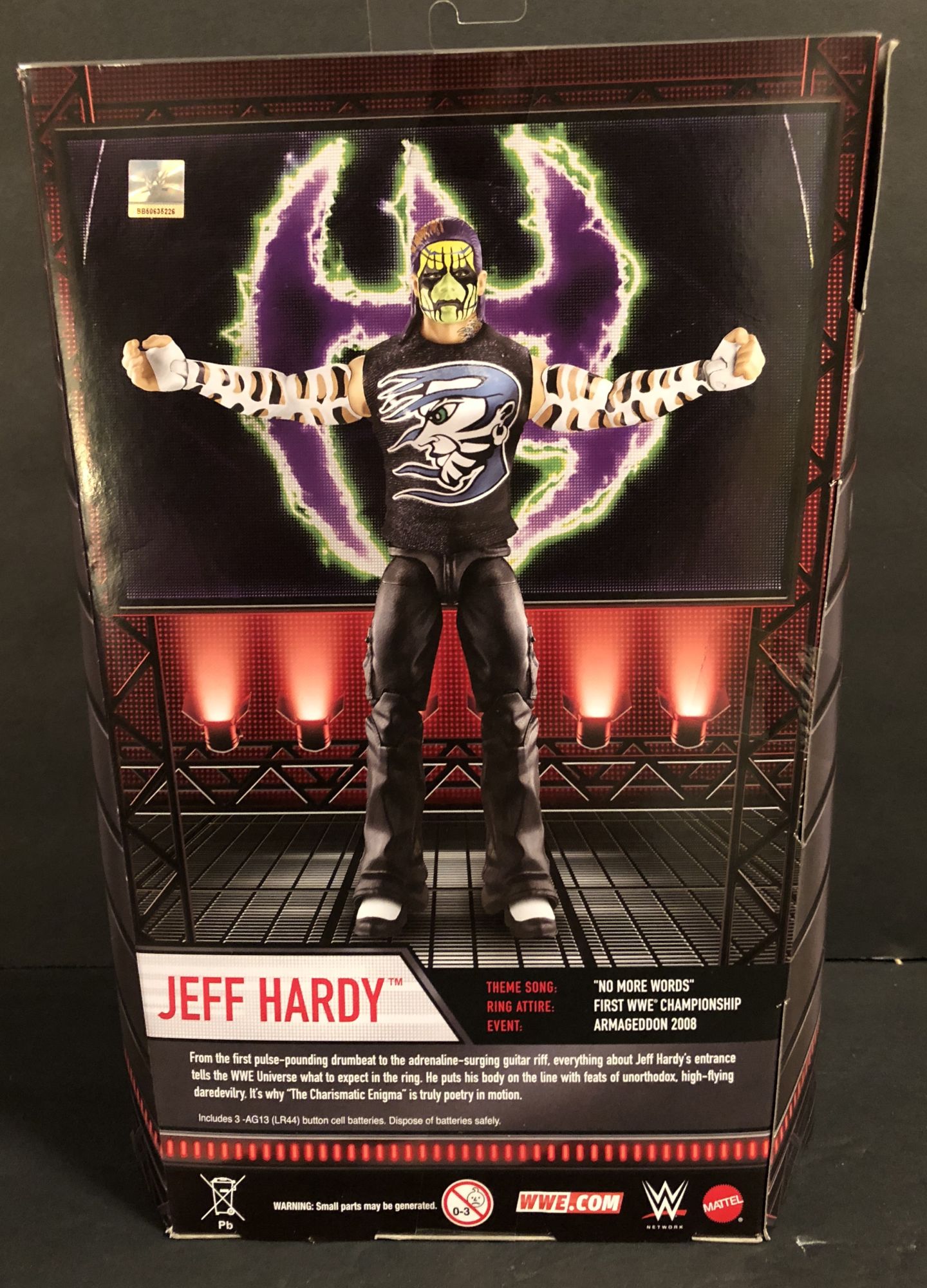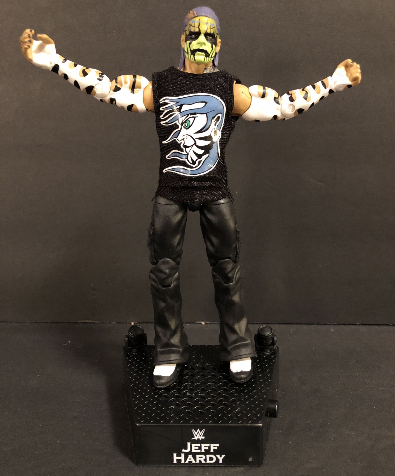 Jeff Hardy was supposed to come out waaaaayyyyy back when Mattel started their WWE line back in 2010. Done up with his painted face and gear from the time, he instead left the company and the figure was pulled, much to the dismay of collectors. Every now and again, a carded prototype would sneak out of somewhere and sell for stupid prices. But now that the House of Hardy has returned to the company, Mattel is wasting no time getting them into the line, with three different Jeff Hardy figures alone hitting stores now. Here we will take a look at the Entrance Greats figure, based off that original Elite 1 design.