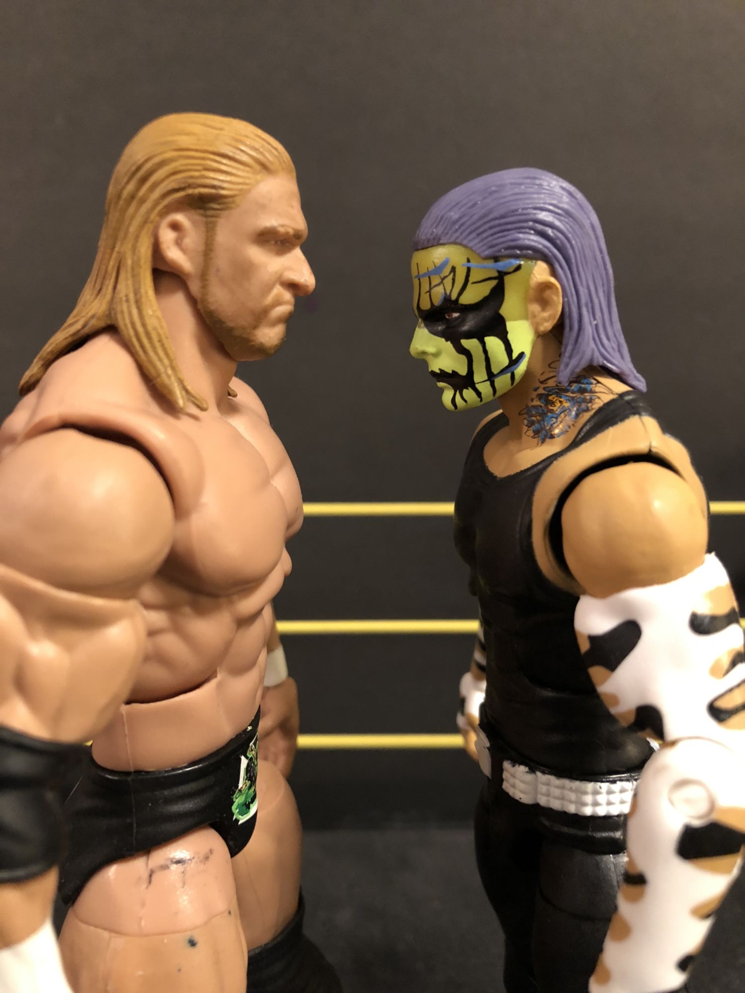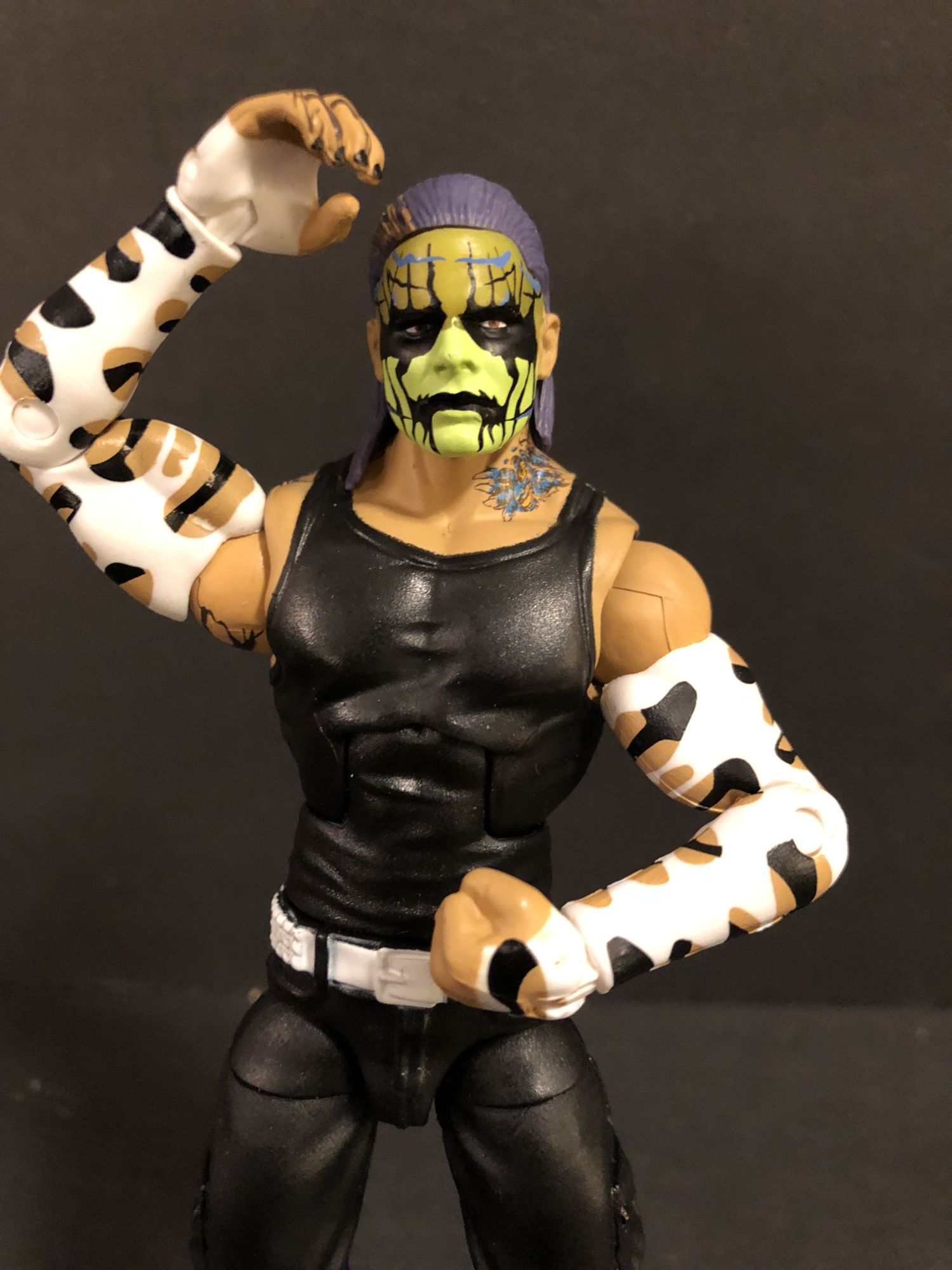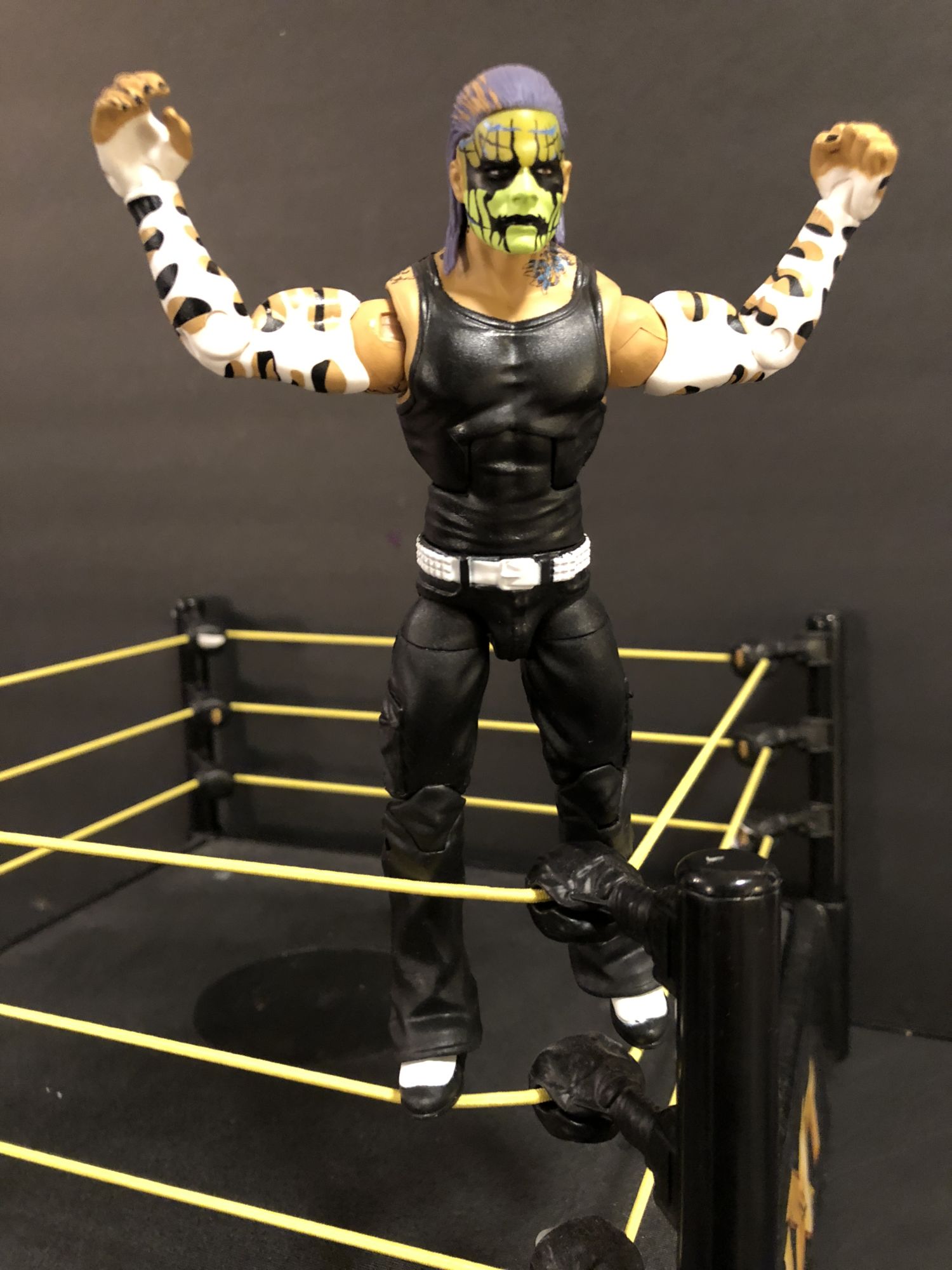 Jeff Hardy was supposed to come out waaaaayyyyy back when Mattel started their WWE line back in 2010. Done up with his painted face and gear from the time, he instead left the company and the figure was pulled, much to the dismay of collectors. Every now and again, a carded prototype would sneak out of somewhere and sell for stupid prices. But now that the House of Hardy has returned to the company, Mattel is wasting no time getting them into the line, with three different Jeff Hardy figures alone hitting stores now. Here we will take a look at the Entrance Greats figure, based off that original Elite 1 design.