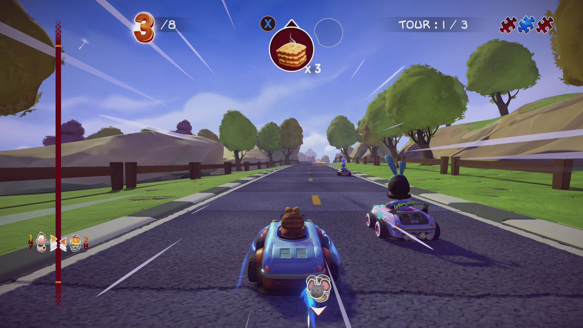 Fans of racing, cats and lasagne: get ready! Garfield, the world-famous cat, is back to take on Jon, Odie and their friends in this racing game where anything goes! Each of the available characters and karts (which can be customised with dozens of accessories) has its own characteristics and a unique driving style: make a strategic choice to match your playing style so that you can cross the finish line in first place! Get off to the best start on the starting line and master tough skids to save time and win the race.