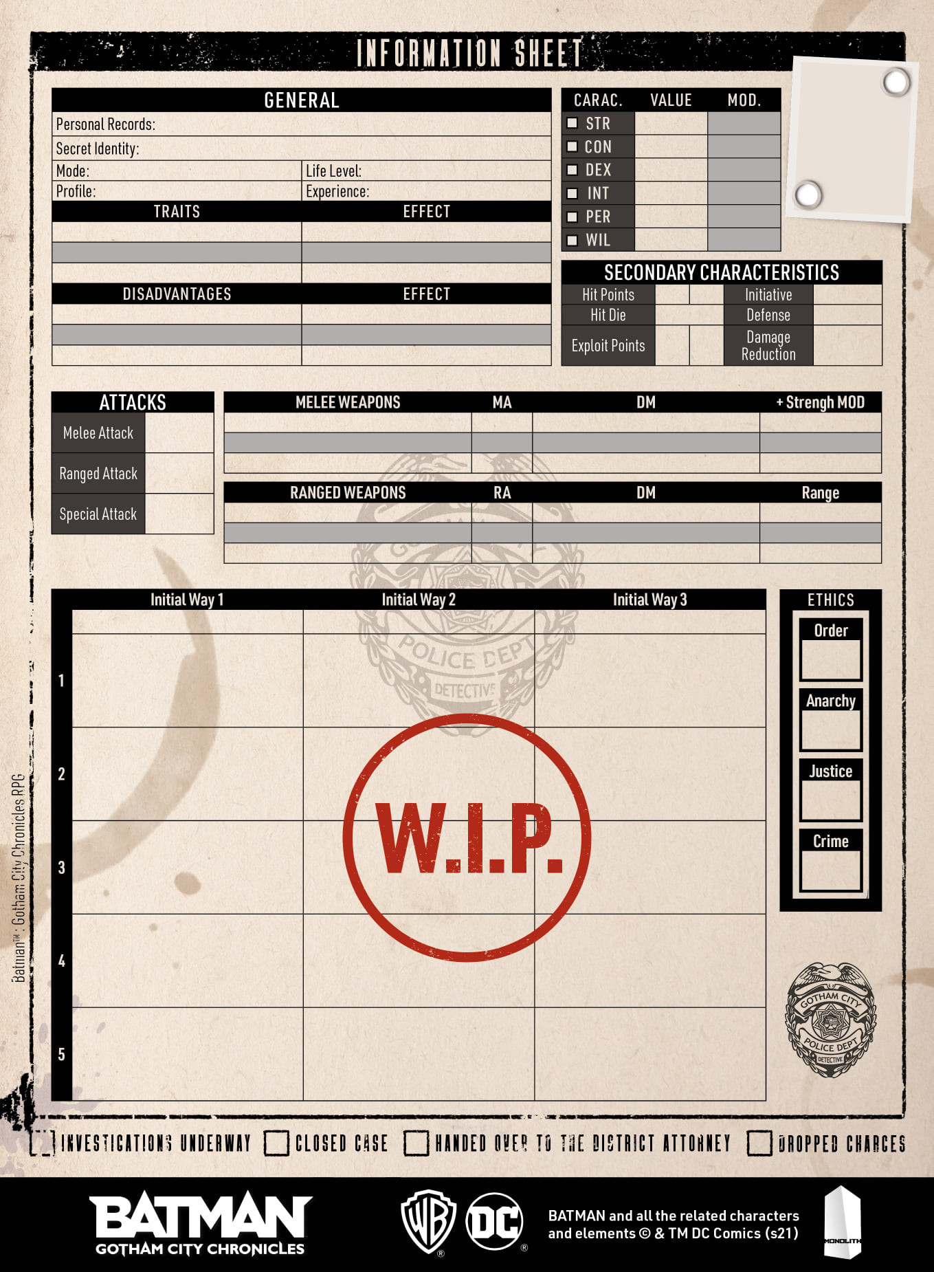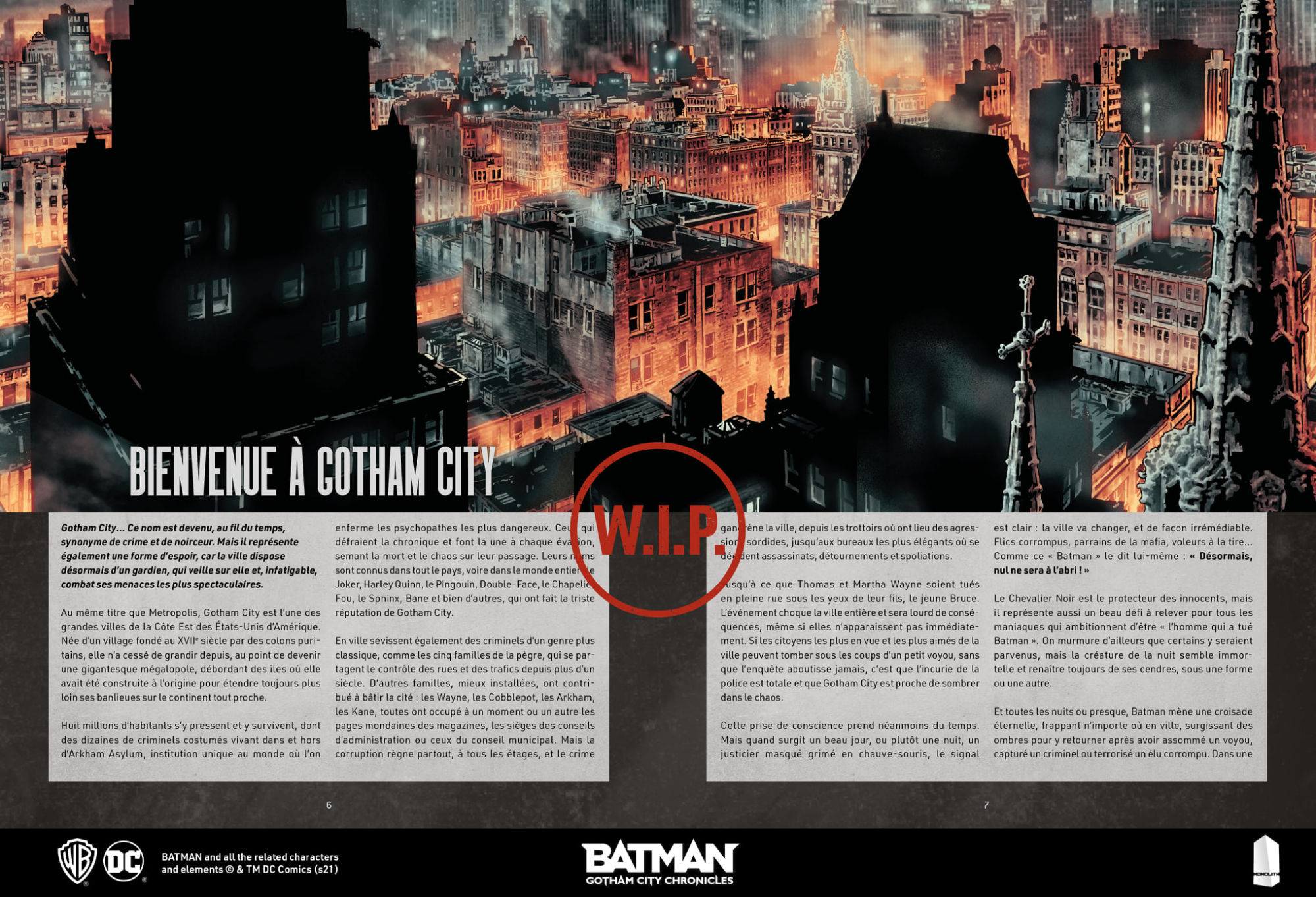 We've created several books to accompany you along this journey to Gotham City. Heroes of Gotham is an introduction to the universe, with all the rules and tips to create and bring to life the game's characters and scenarios. The Gotham Chronicles is a collection of a dozen turnkey scenarios that bring exciting and intense adventures to your table! The Gotham Guide is a love story to the city! It takes you deep into the heart of its neighborhoods and secrets, a must for those who want to dig deep and gather everything they'll need to immerse themselves in the atmosphere and make the story theirs. You will find here some excerpts/Work in Progress for each of the books, as well as a character sheet template used for the GCPD characters. They are not all available in English, as we are still in the intensive phase of translations and proofreading.