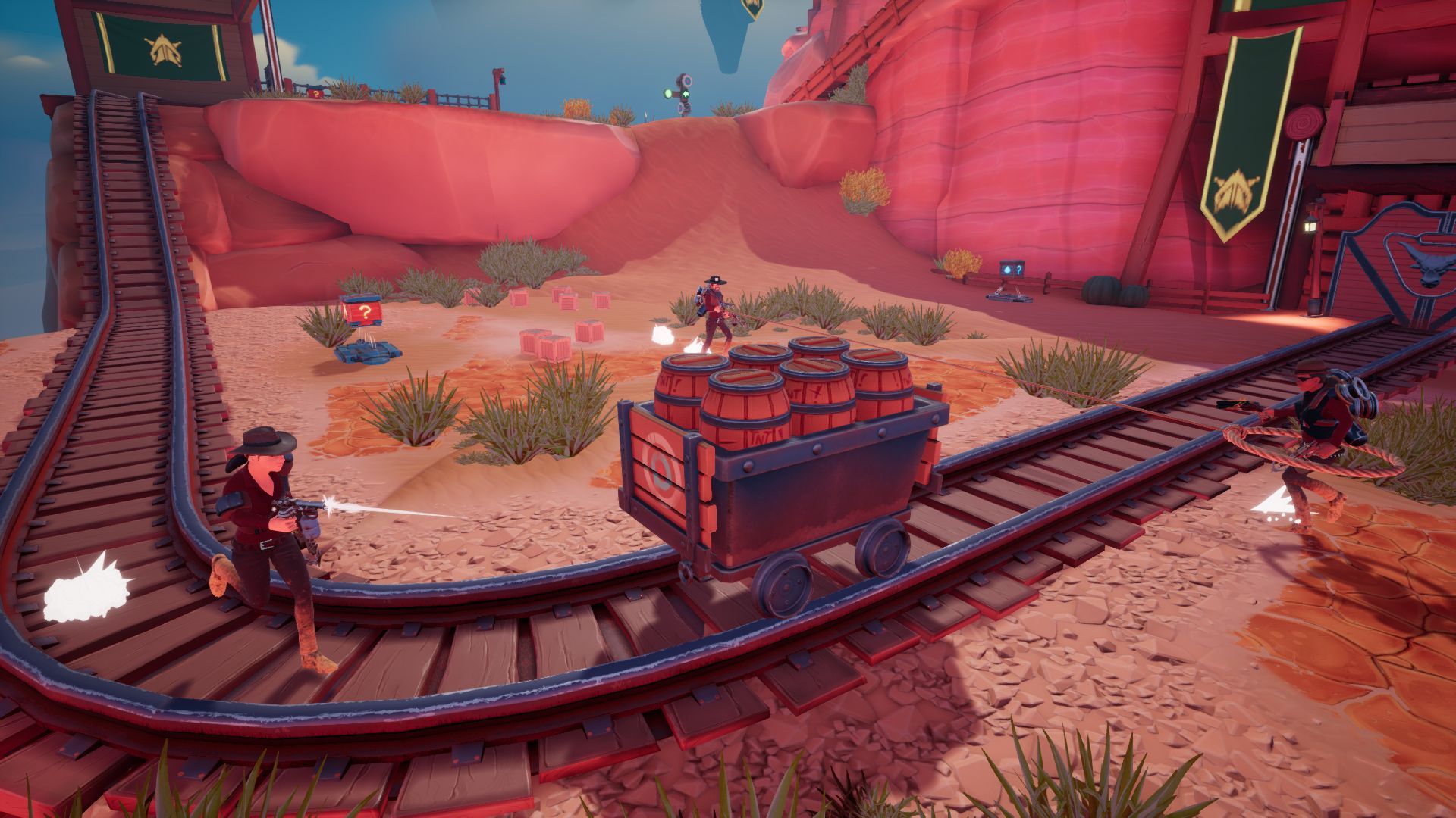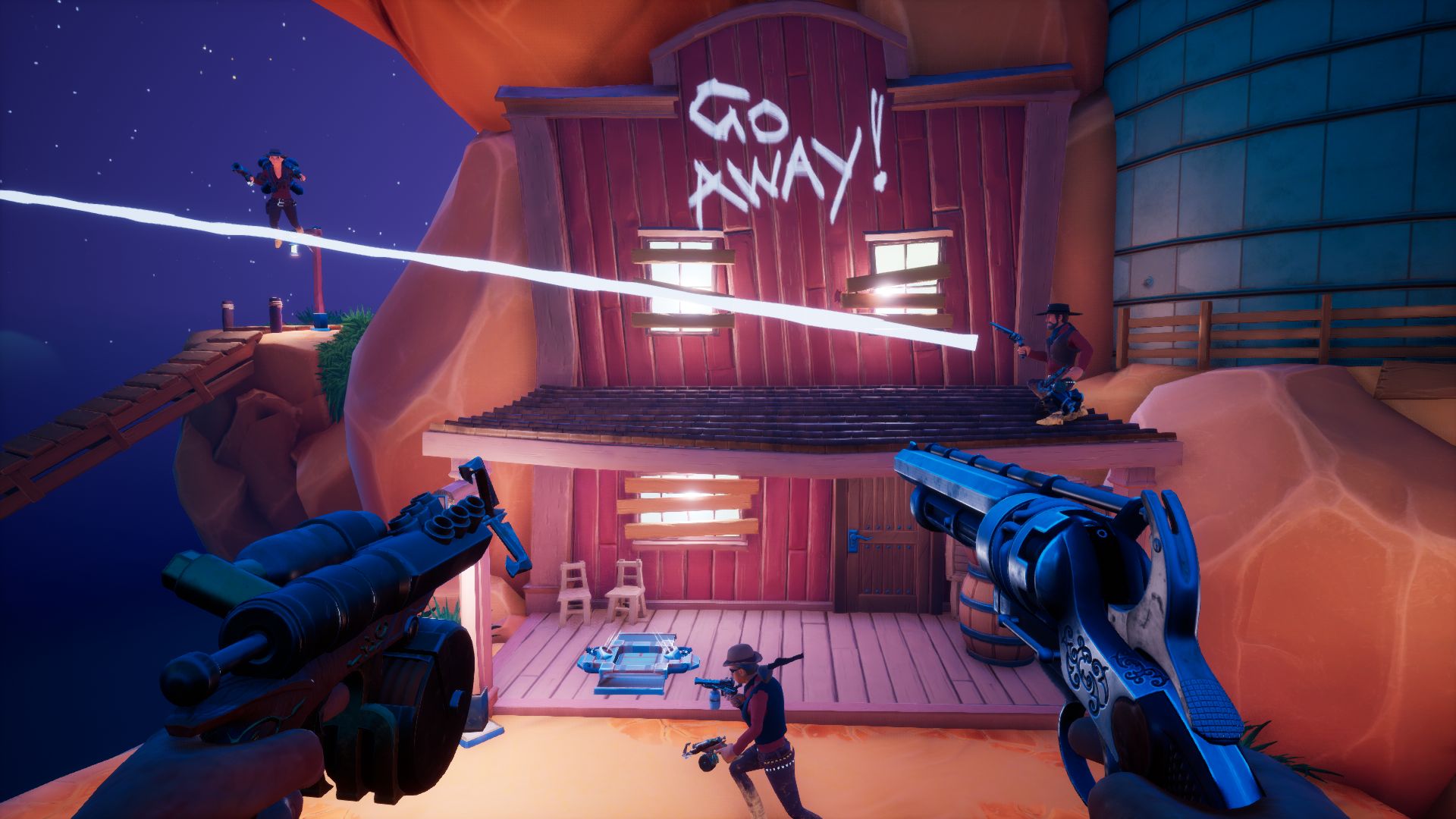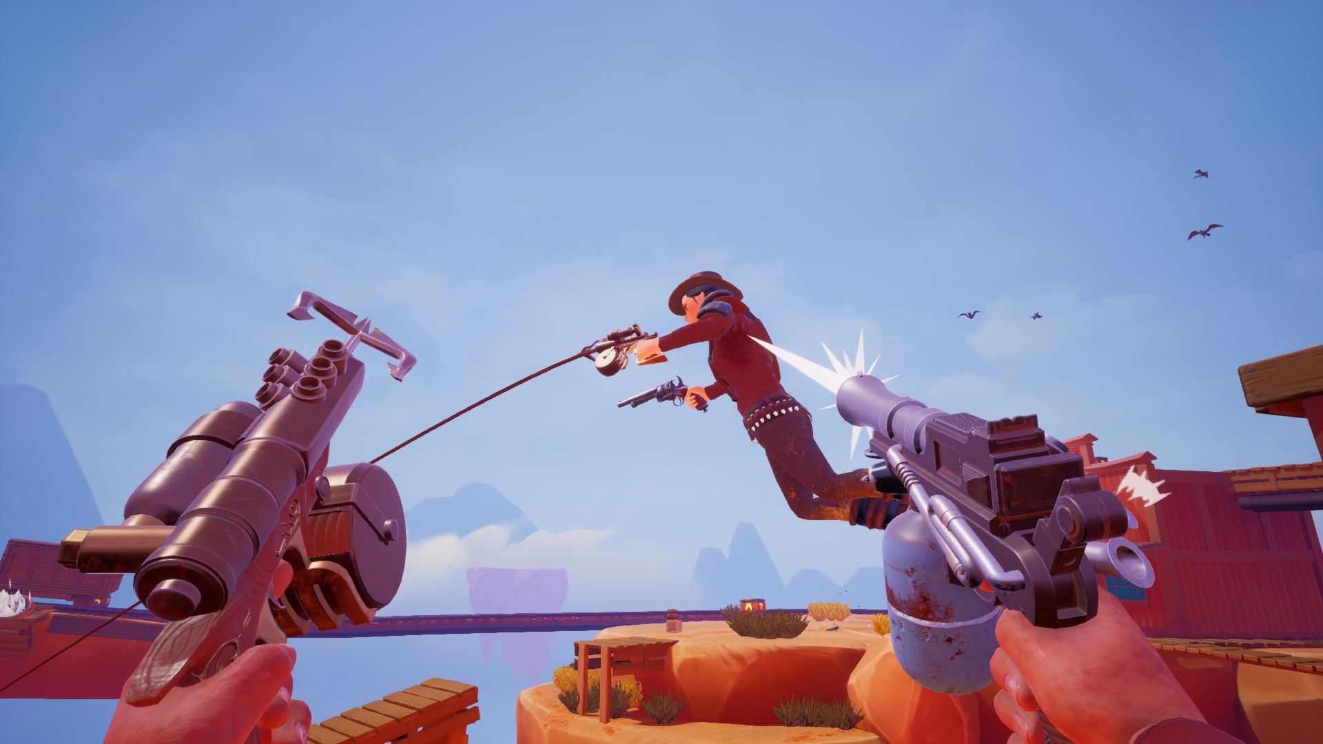 It isn't often you have a developer sit there and watch you play the game and ask "are you trying to break it?" That was the case for me when I tried out Sky Noon at PAX East, being developed by Lunar Rooster and published by Reverb Triple XP. The game is a first-person western brawler that comes with a few added mechanics that give the action a bit of a twist. One of the guns you have in your hand is a grappling hook, designed to act like a zipline that will shoot you across the map you up into the sky. You run around in teams of three in multiplayer battles trying to score the most amount of points in a certain amount of time. The action goes between having small moments of trying to find each other to complete chaos as you can blow people off the map with grenades and take them out in a single shot with a blunderbuss.