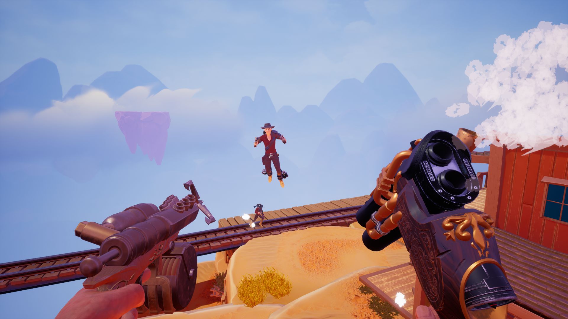 After playing a losing three-on-three match, I got to try some of the other mechanics they were messing with in a single-player mode, which included me shooting a hook at a floating box then using a rocket-type gun to shoot myself into the air, trying to gain double the air above my playing field. Messing around with what I could do made me want to jump back into the multiplayer rounds again. There's no confirmed release date for Sky Noon, I wasn't even given a firm year if it would be 2018 or 2019, but when it does it it will probably end up being one of the best multiplayer games you see Twitch streamers and YouTube gamers latch onto for fun.