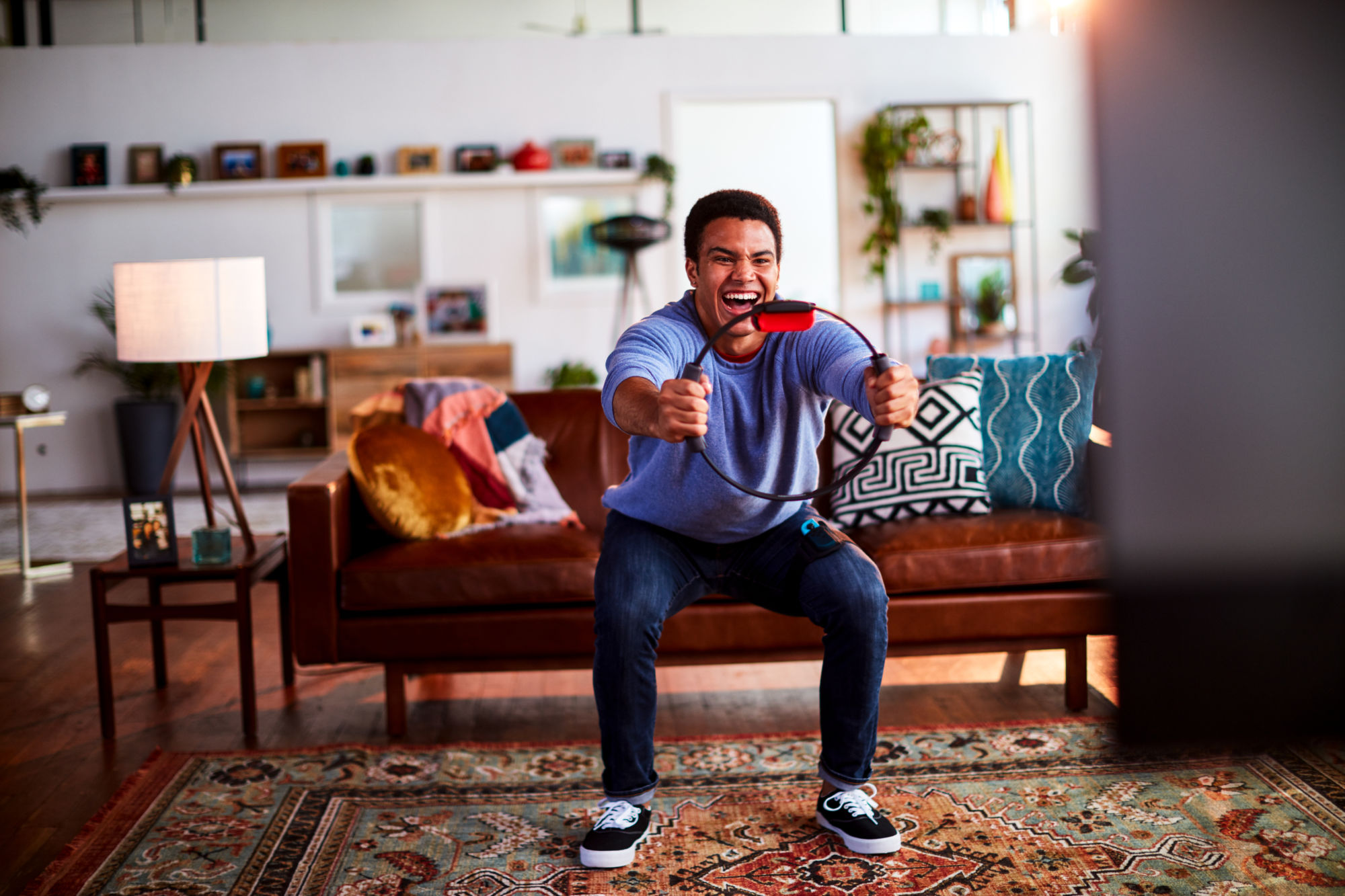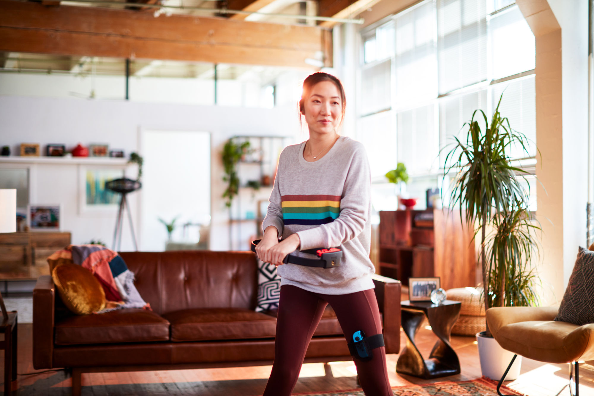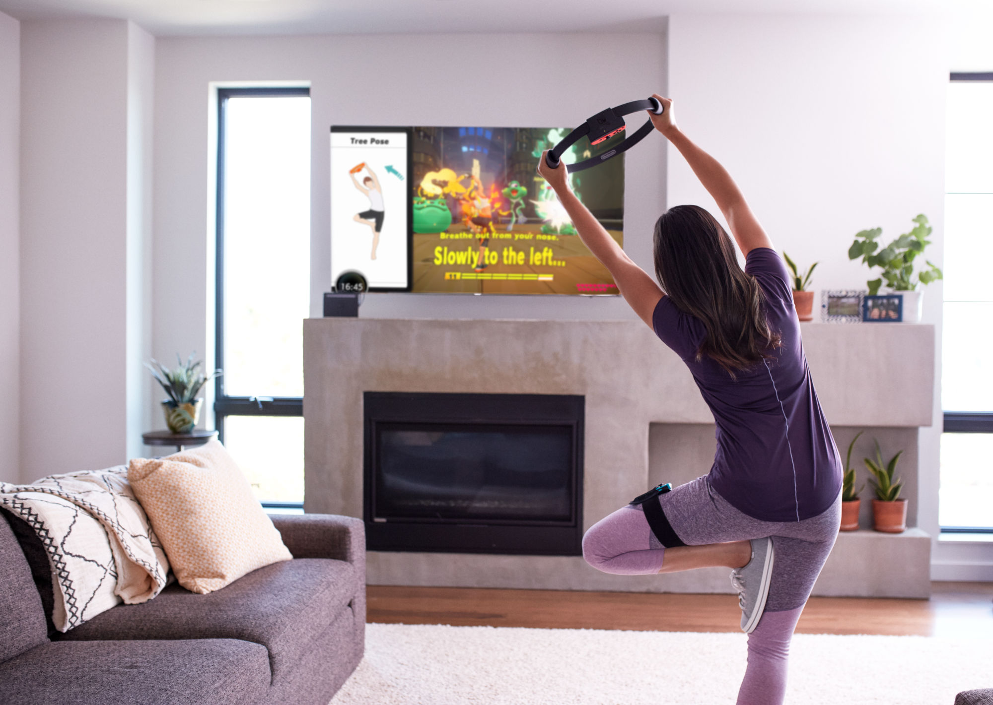 In the Ring Fit Adventure game, players explore an expansive world, battling enemies along the way using real-life exercises to perform in-game attacks. The new Ring-Con and Leg Strap accessories that are included with the game respond to the player's real-world movements, allowing the game to turn them into in-game actions, like jogging in place to move your character through the world using the attached Leg Strap, or squeezing the Ring-Con and turning that strength exercise into powerful attacks. By playing the game daily, players can regularly work out various parts of their bodies. With additional mini-games and workout routines, Ring Fit Adventure is a fun experience for players of various skill levels and lifestyles