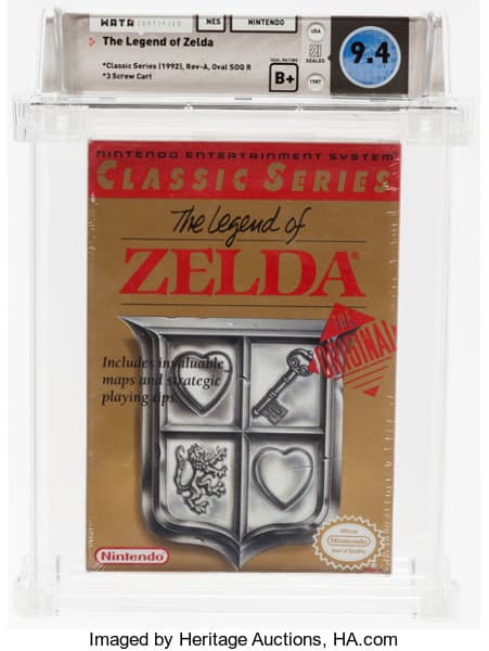 Heritage Auctions has hosted their first set of certified and graded collectible video games this past weekend, with the original The Legend of Zelda selling for over $3,000 USD after an intense bidding war. The initial set of video game auctions included 25 certified games, most from the 80s and early 90s. The games were graded, certified, and housed in protective cases by Wata Games as a way to offer consistency and objectivity through use of a third-party grader.