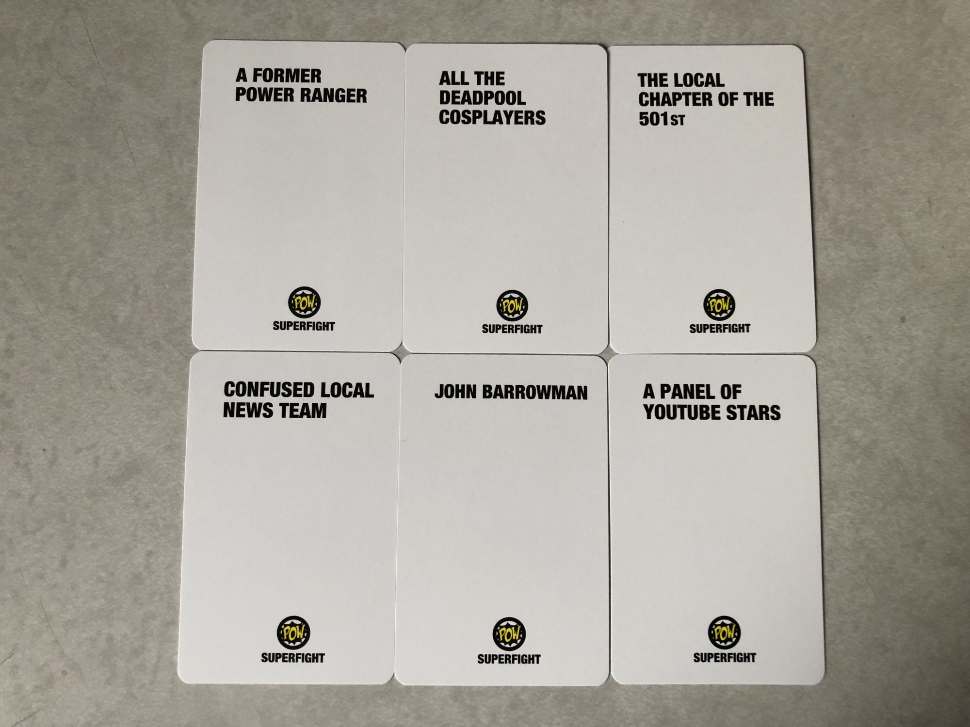The Superfight deck wasn't as funny, but the options are plentiful when mixed into other decks. Superfight has you pick a character, and a coupel of attributes to do battle with the winner being chosen by the other players. This deck isn't a straight shot of any one item in particular. You're getting characters, attributes, locations, and hazards. The characters are actually pretty dope compared to some other sets, where you get people such as a former Power Ranger, John Barrowman, or the Local Chapter of the 501st (which is a regiment of Storm Troopers for the uninitiated).