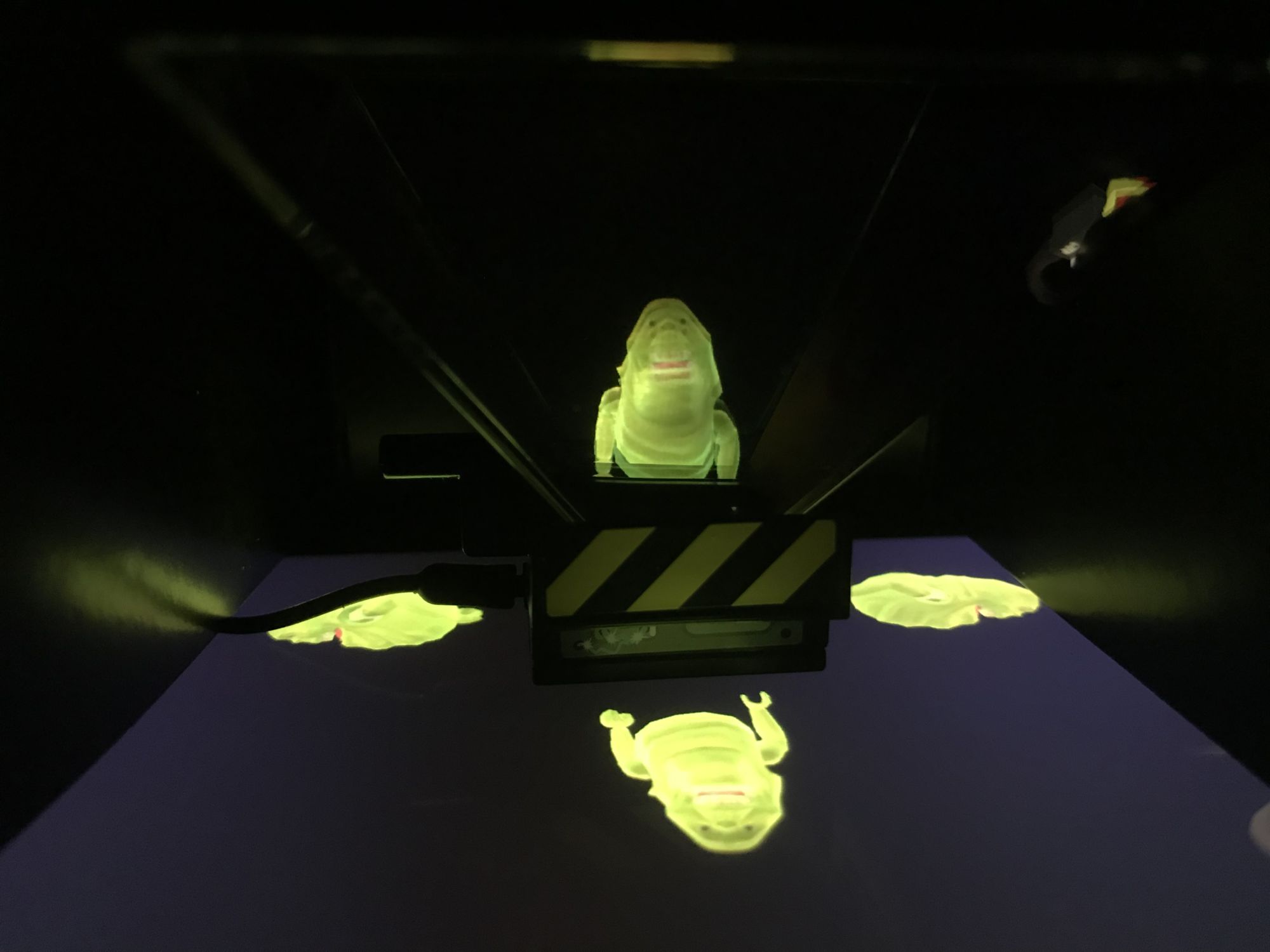 The main selling point on these would be the trapping of the ghosts using the app. The app itself is free to download and pretty straightforward. When you turn it on, make sure all the lights are out wherever you are. You can choose from four different ghosts to capture — naturally, I went with Slimer. When prompted, you need to place the trap on your mobile device is a specific spot and click the button. It took a minute for the app to detect the trap in the right spot, but once it did, the image of the ghost appears hovering above the trap itself! It is a pretty cool effect — I wish the projection were more powerful, but for a $16 toy, that may be asking a lot.