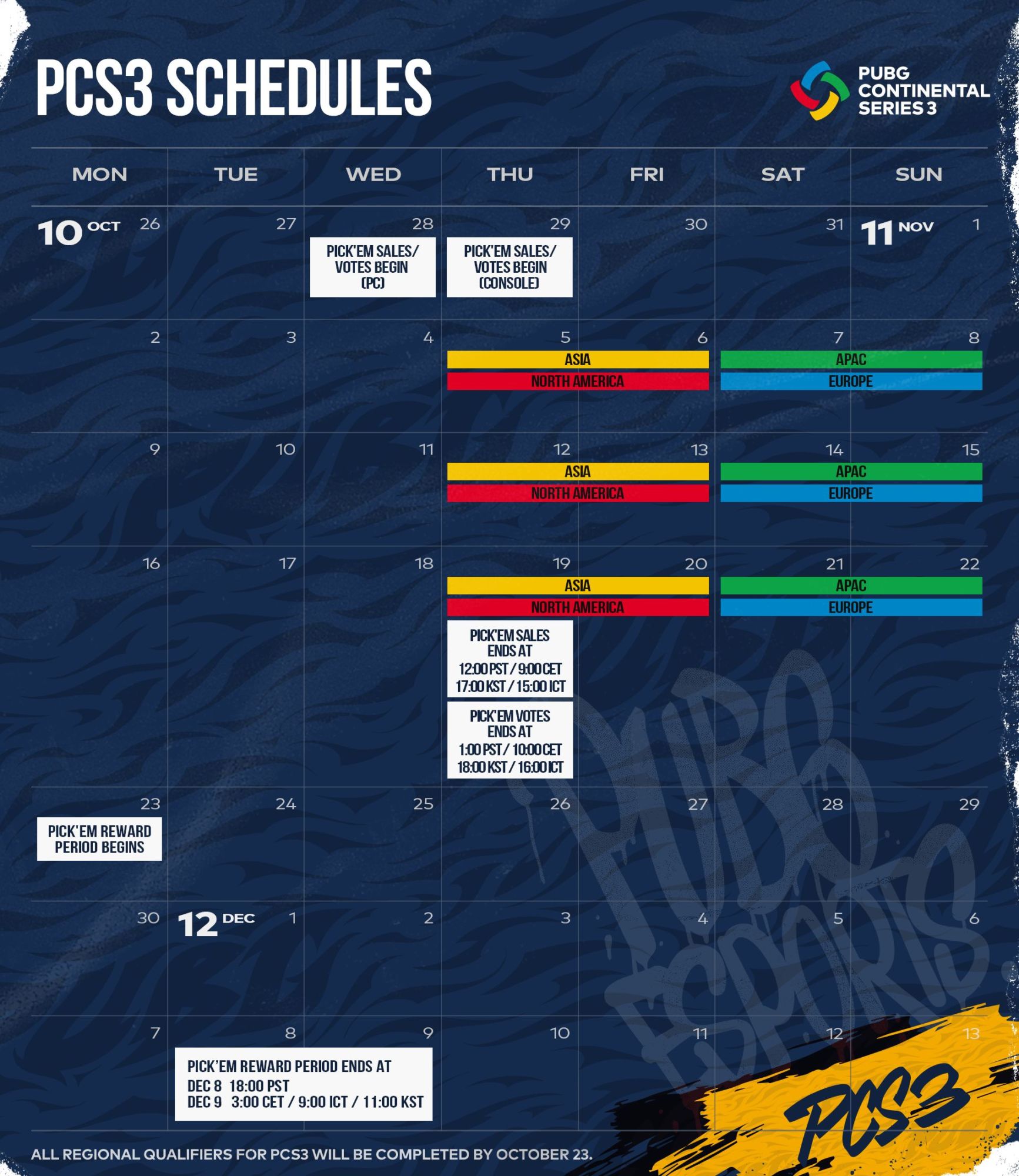 PUBG Corp. announced this week the full plans for the Continental Series 3, the latest global esports event for the game while still in quarantine. COVID-19 may be preventing players from competing in person, but the tournament is going to be rolling on. The PCS3 consists of four regional tournaments across North America, Europe, Asia, and APAC, with teams fighting for their region's Grand Champions and win a $200k regional prize pool. teams have already started competing in regional tournaments, which you can watch this weekend if you want to check out the action. You can find the details of the tournament below, which the main events will take place throughout November 2020.,