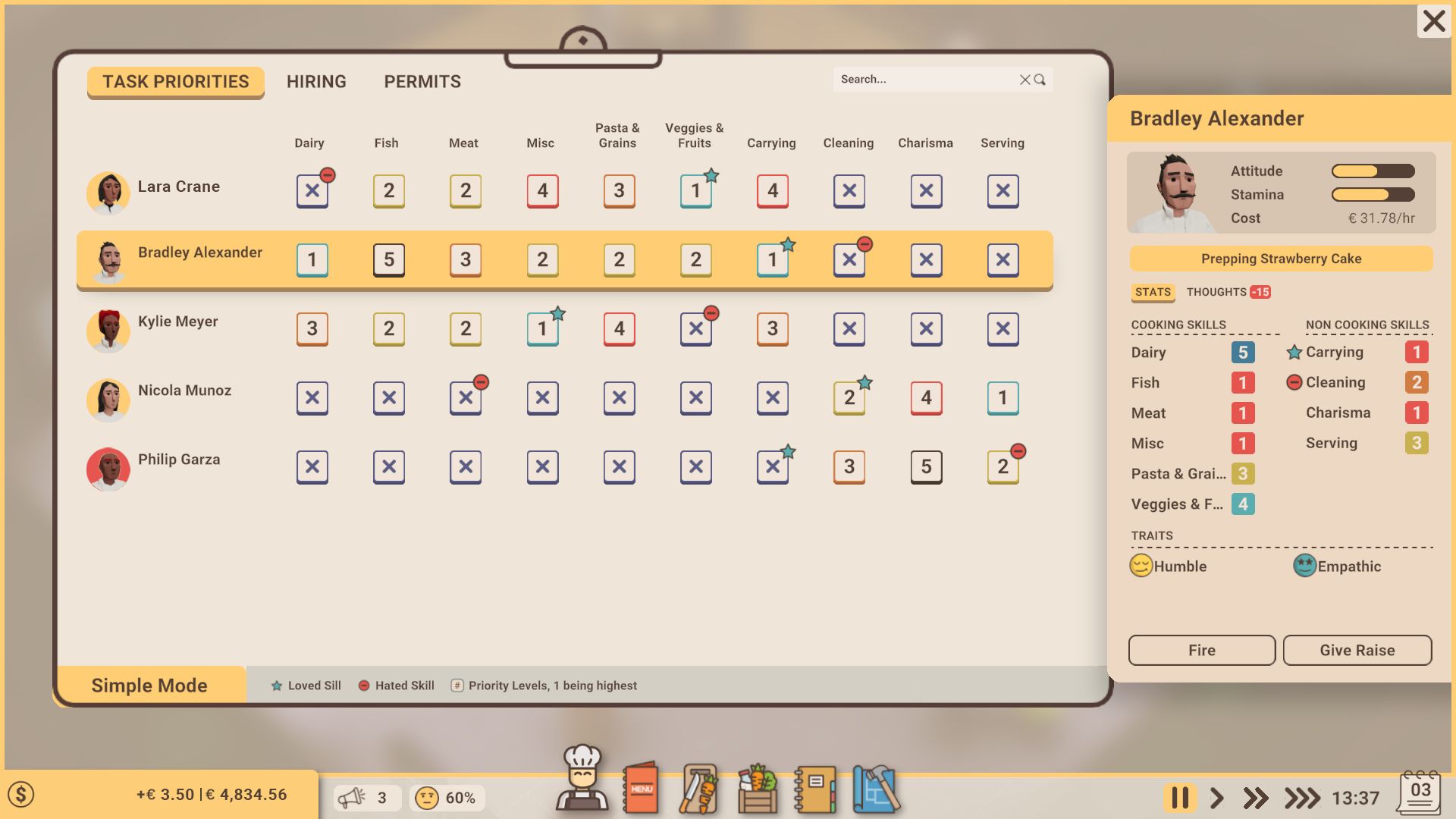 Assemble your dream team – Pick from a pool of procedurally generated hopefuls. Consider each individual's unique combination of traits and skill levels, and how these might affect their work efficiencies, relationships, and customer interactions. Will they fit in? Or will they prove to be more trouble than they're worth?