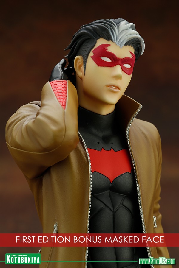 Man, that arm up pose is going to make collectors swoon. There is less butt emphasis than on the Dick Grayson figure, but that is to be expected, as Dick's butt is one of the most popular in comics. If you preorder the first edition of this one you get three different face sculpts to choose from as well. I love the non-helmet look, the white streak in his hair really makes that head sculpt pop.