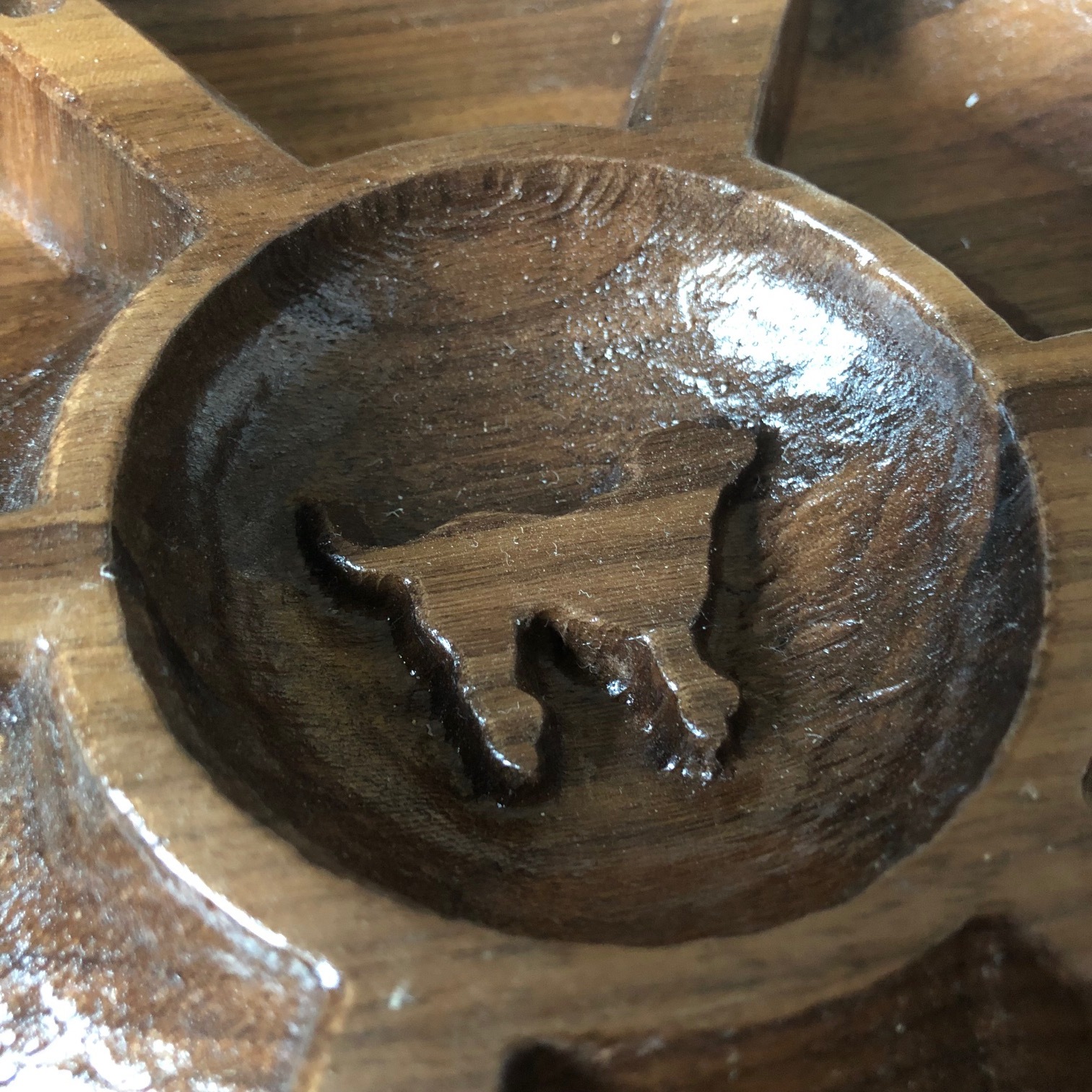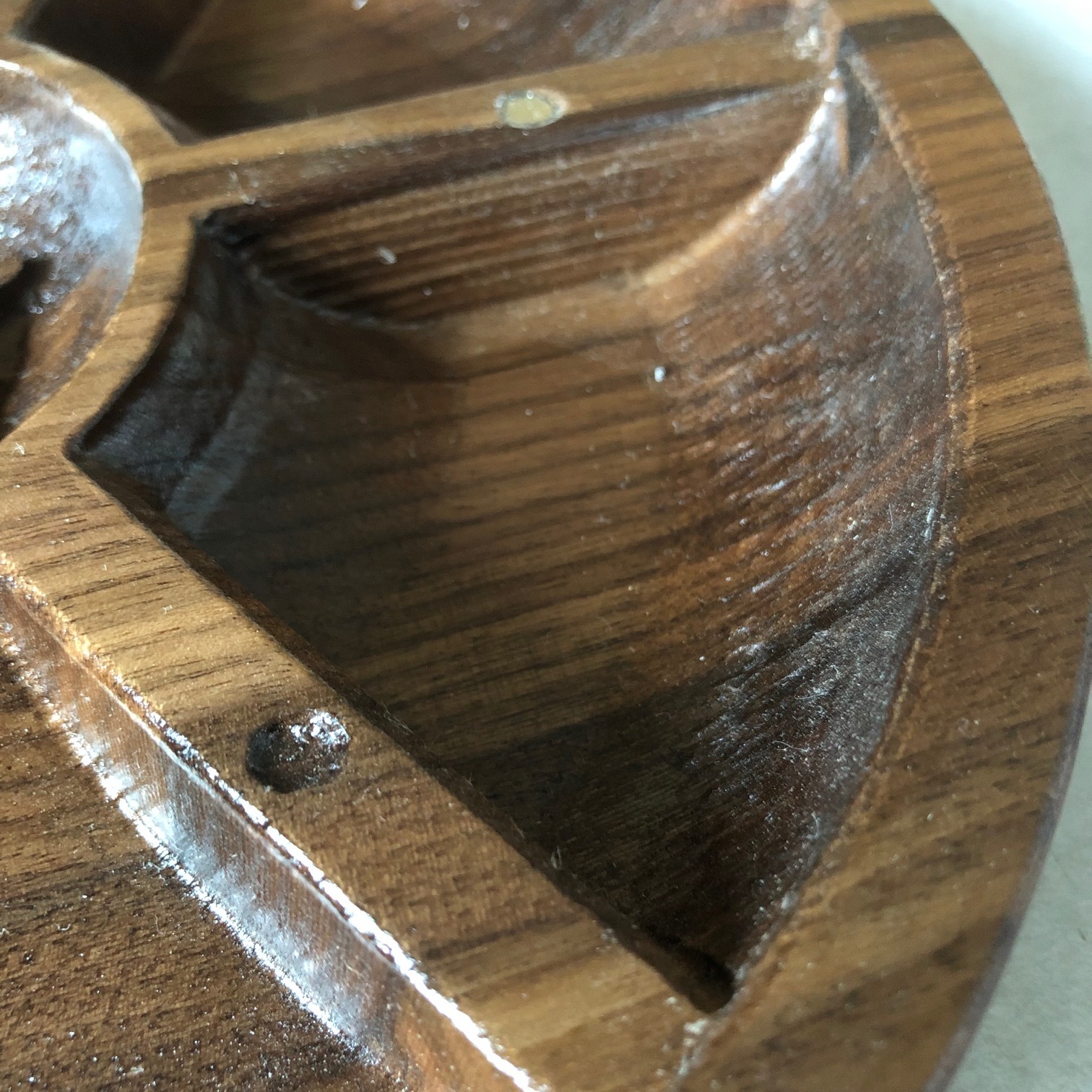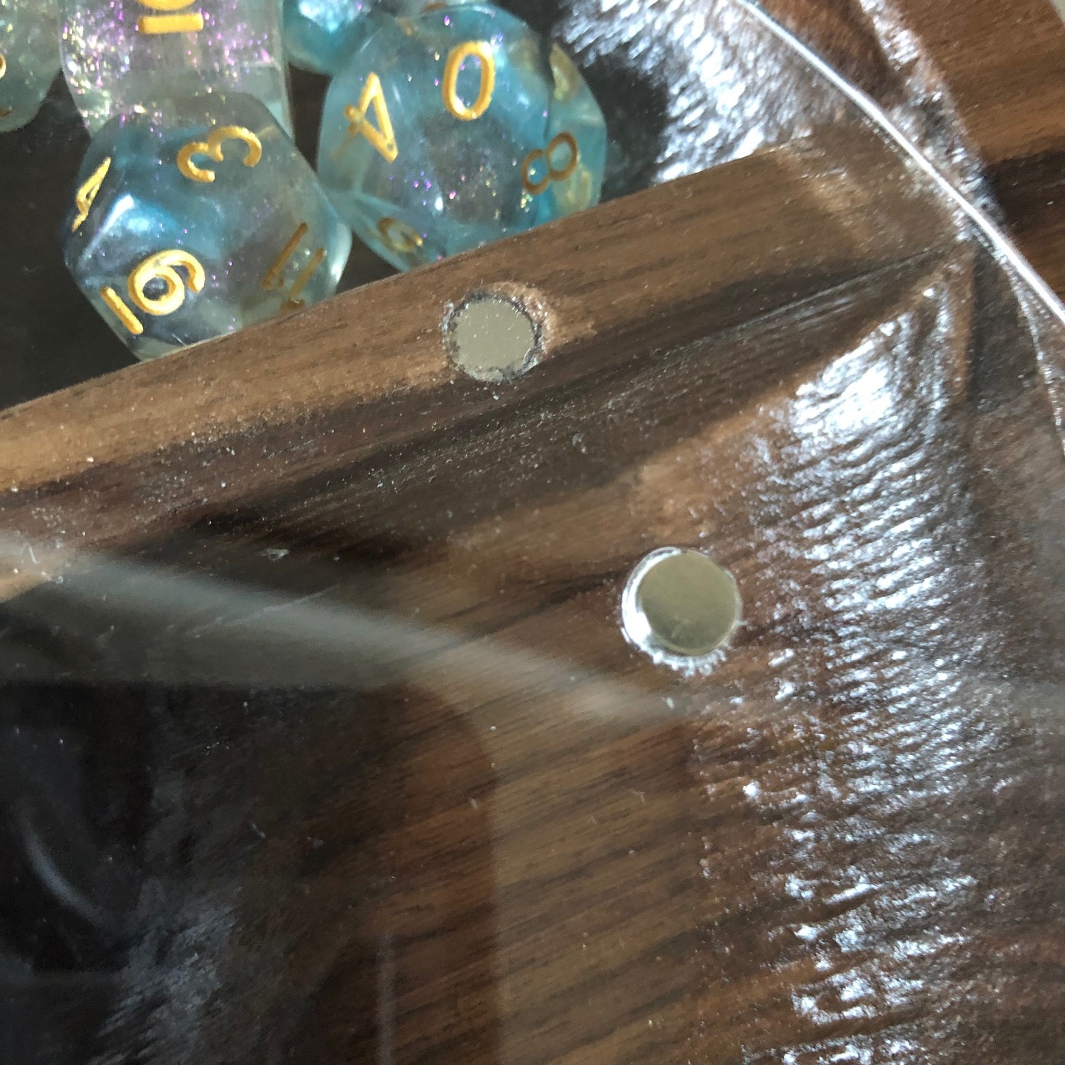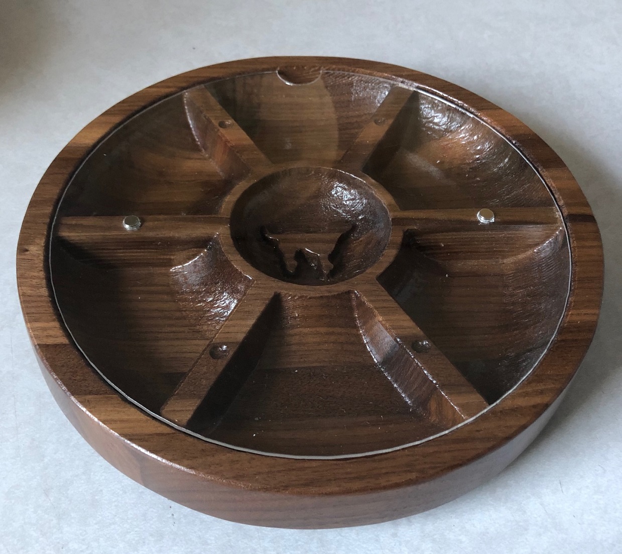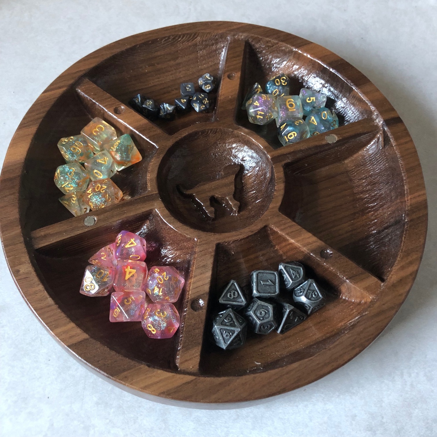 So first off, the design. This is a six compartment wheel that was crafted in black walnut wood. Aside from the middle piece that has the company logo on it, all the other compartments are empty. The shield is basically designed so that you can throw multiple items into them so people have access to them around a table. For the purposes of this review, I just used a few different sets of Die Hard Dice to put in each one.