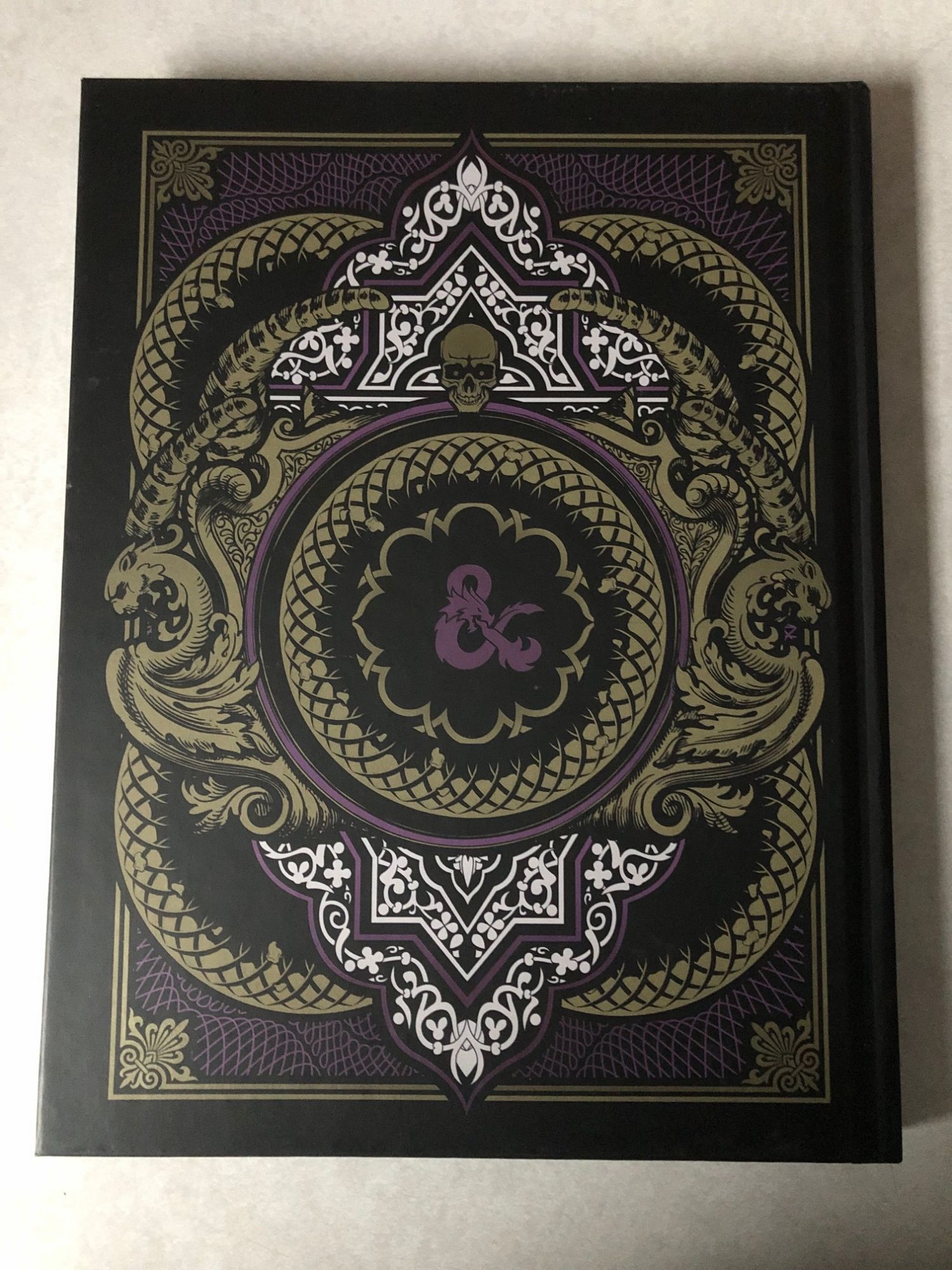 The third book is the Dungeon Master's Guide, and again we're treated to a character from the regular book as we see the lich Acererak, with his mighty crown dawned in purple. I got a kick out of the look from this one as the purple and gold trim compliment each other on both the front and back. The patterns and designs make this book pop and it feels like a crime getting my fingerprints all over it. It was also nice having some bright white on the face and as part of the patterns on the back.