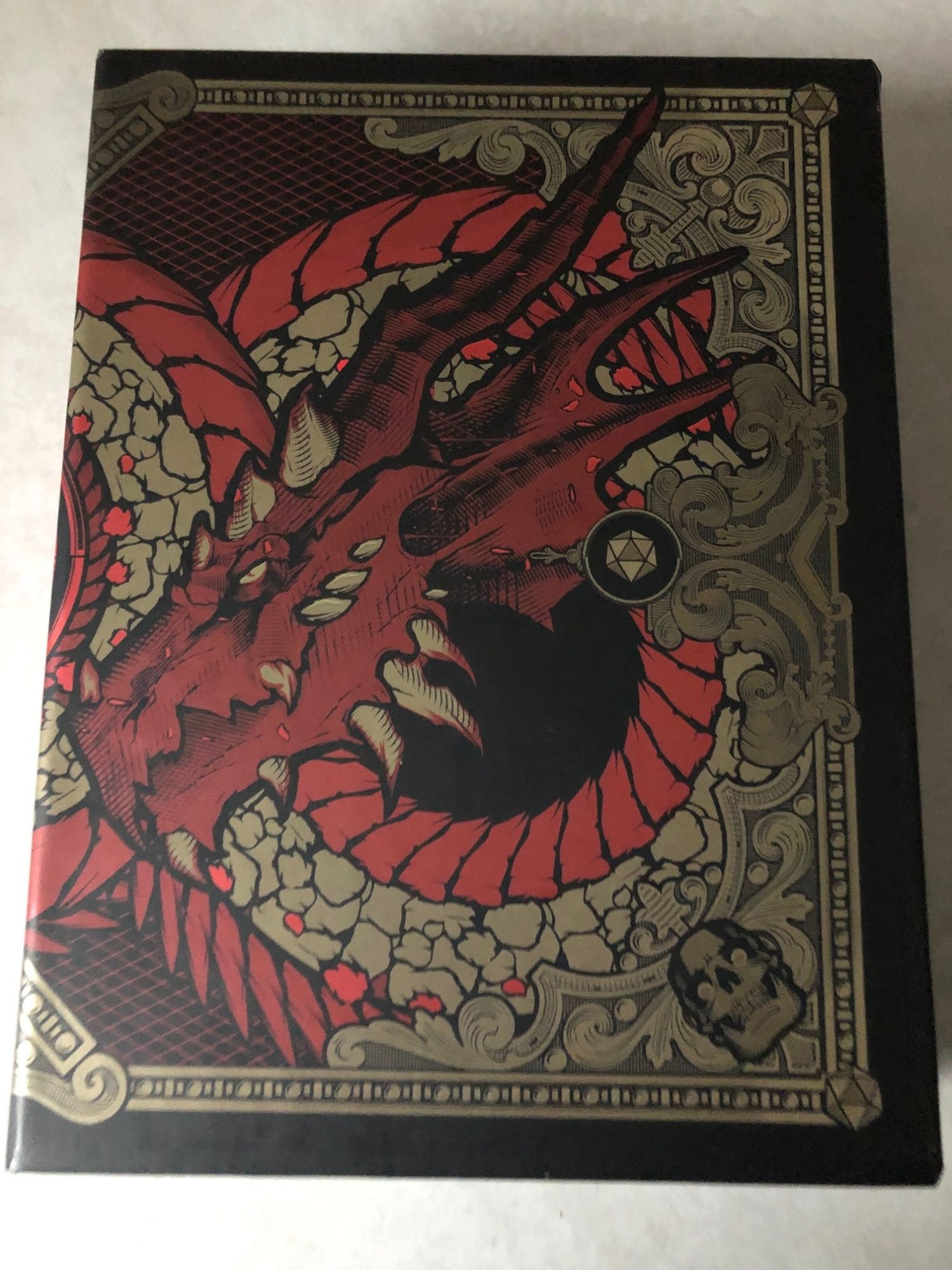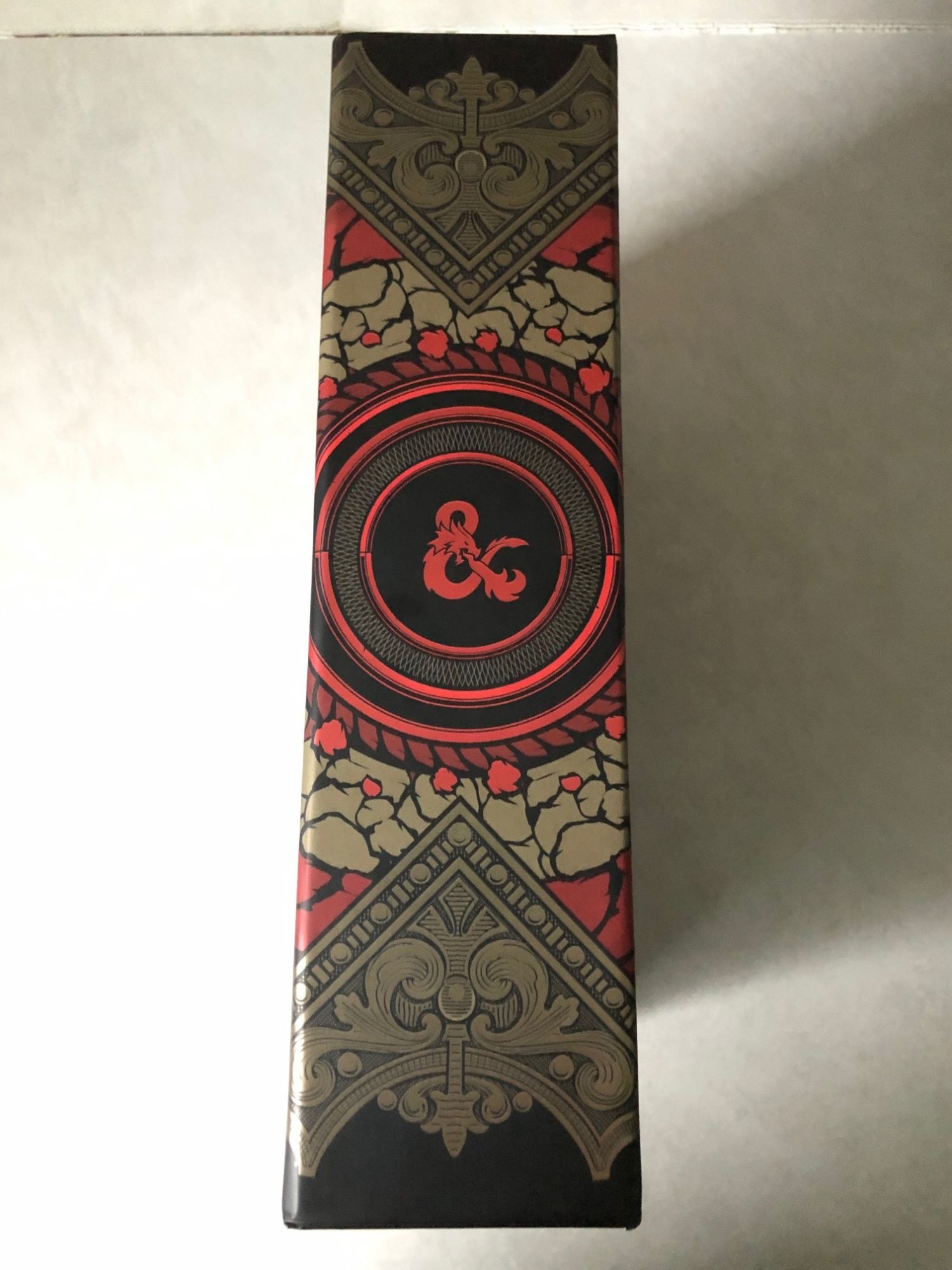 First off, let's look at this cool exterior box that everything comes in. The design team did an amazing job making this pop on the shelf and added in so many details it might make hardcore fans' heads spin. The choice of the gold, red, and black makes it look like an ancient tome waiting to be poured over in great detail. I love the additions of a D20 on the sides and the "&" symbol placed in a couple places. This is a gorgeous look that made me so happy to see it for the first time.
