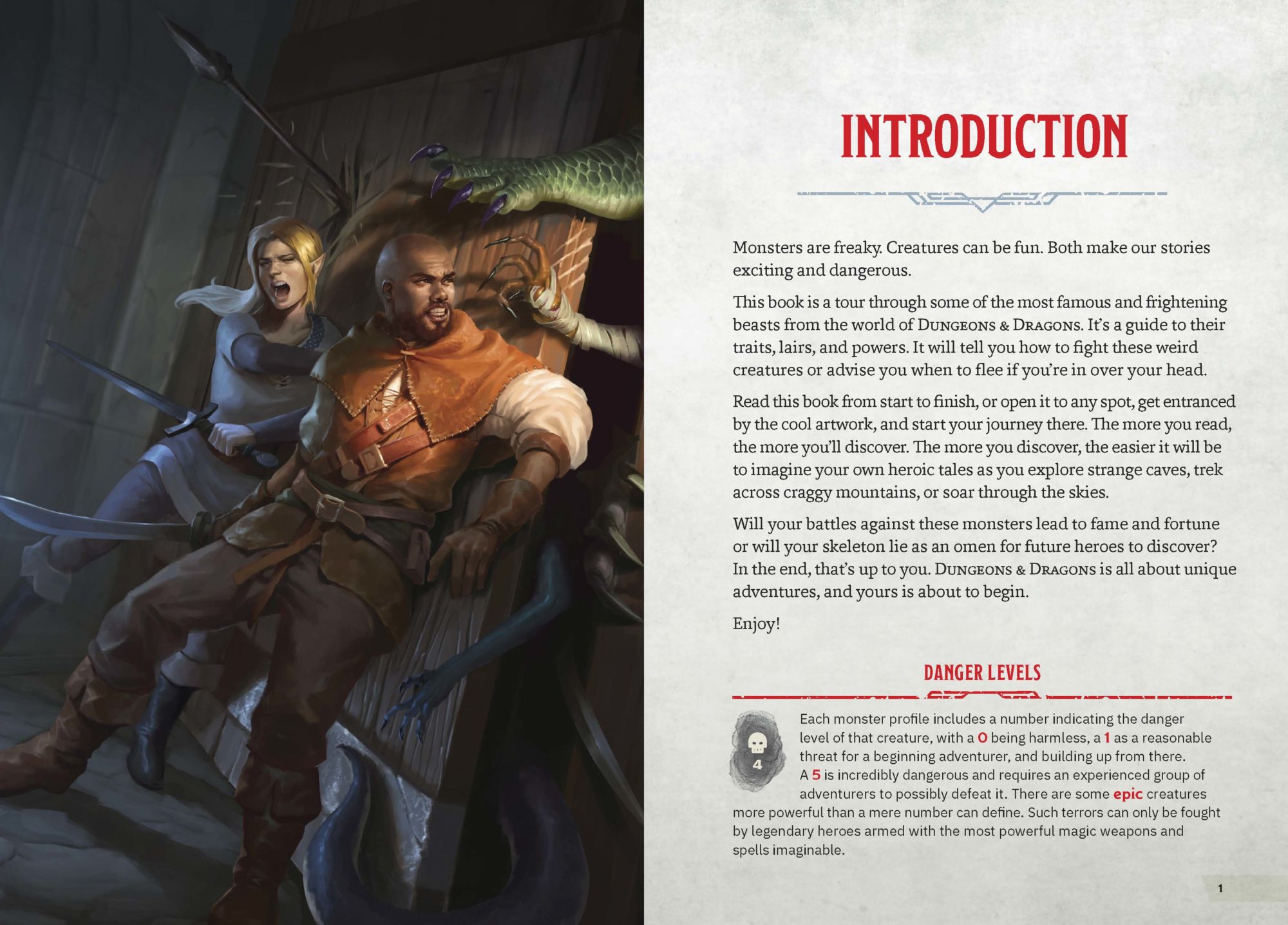 The third area goes over equipment. As you can see from the photo above, they go over everything you'll need in different forms of clothing, armor, and weaponry to help your character survive in a world where there are a lot of things that may kill your average adventurer. It's all basic equipment, no magical items or abilities as they're saving all of that fun stuff for another book on the way. One of the fun things about this is that there are character flowcharts to help you decide what kind of character you might like to play as, along with a small guide to helping develop your backstory within the D&D guidelines. Basically, by the time you're done reading this book, you'll have an idea of a character you'll like and may want to play as without having to scan over 200 pages in the Player's Handbook.