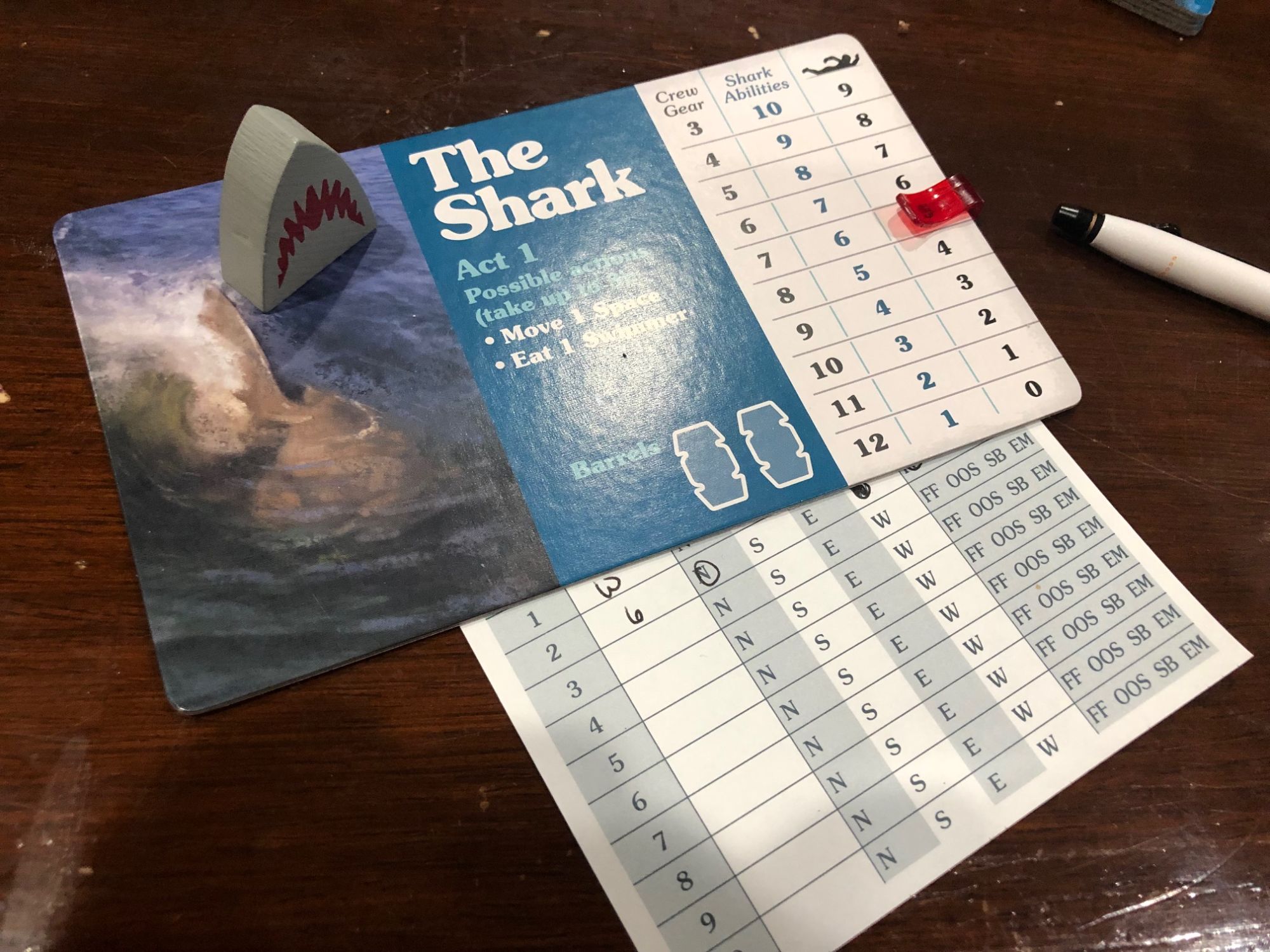 In Act 2, all bets are off as you're now directly fighting each other. As you can see from the card below, depending on how many people the shark ate, it gains abilities. Meanwhile, the more people eaten means the fewer resources the people have on The Orca. Essentially, each side is rewarded for what they manage to do. The shark gets abilities to use against the people on the Orca, as their objectives change and they try to sink the boat and east all three men. As for the people, they get random gear which includes guns, ammo, and chum, and some other surprises. All of which are used to attract the shark and eventually kill it. If you got the shark tracked early, you'll get extra gear. But if you let them eat all the people, you're left with the bare essentials.