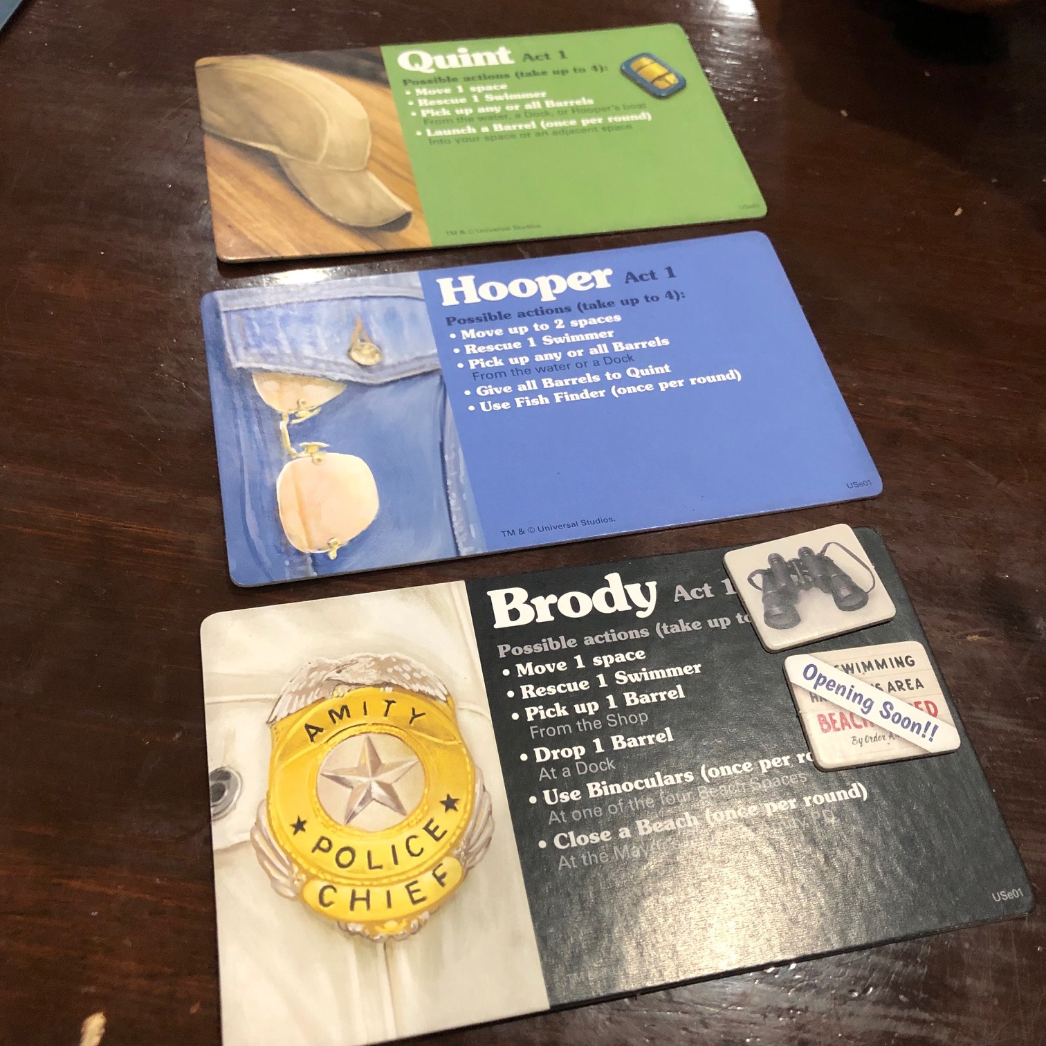 Coordinating the three characters is a lot harder than you might suspect, as Hooper and Quint have boats to get around and deploy barrels, as well as save swimmers and use tracking equipment to find the shark. Brody does all of his movement on the island, picking up new barrels for Hooper, using binoculars, and closing down different beaches. I found that when the three of them are coordinated and manage to work the beaches well, they can limit the shark's ability to do anything. However, if things are a mess or they slip up for a round, it's a buffet for the shark.