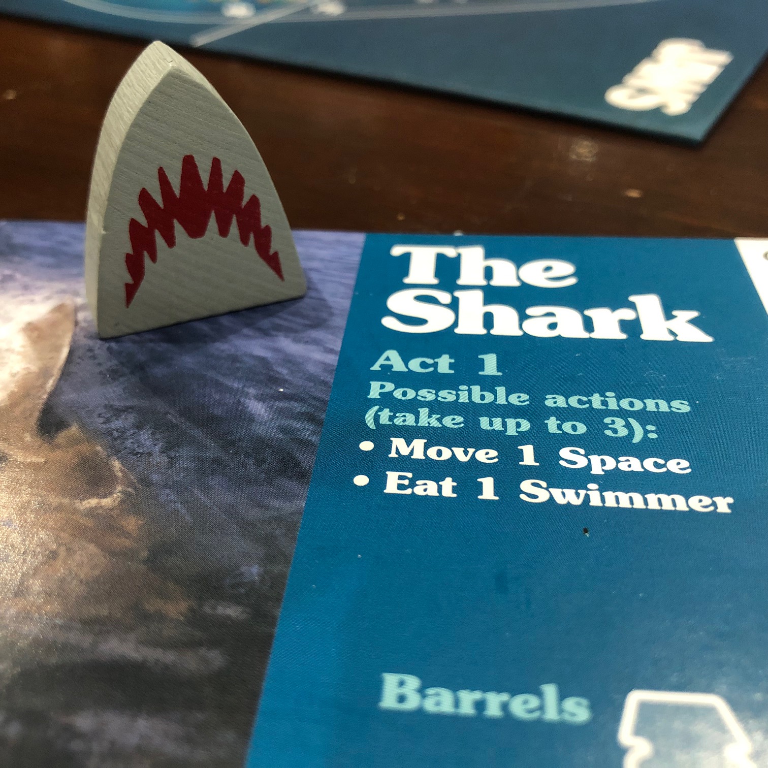 The Second Act, as you can see below, puts all three men on the boat and the shark in the water. Using the cards along the base, the shark can choose which of the three options it wants to take a bite out of the ship. Each section basically has two health to it. If it gets hit once, it turns to floating wreckage. If it gets hit twice, it's now gone and is simply water. Meanwhile, the men on the top can move to almost any space and have bullseyes to point where they plan to attack if they think the shark is coming to that area. If they're correct, they can try to damage the shark until it dies. If they fail, they risk losing resources.