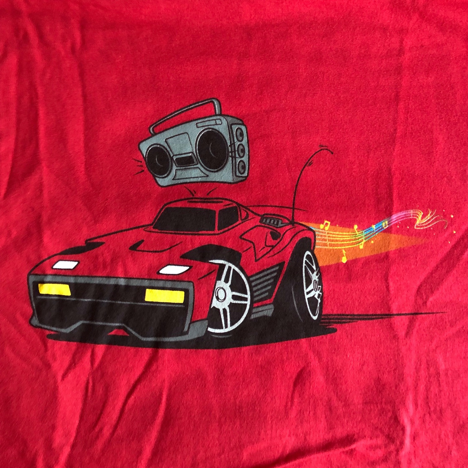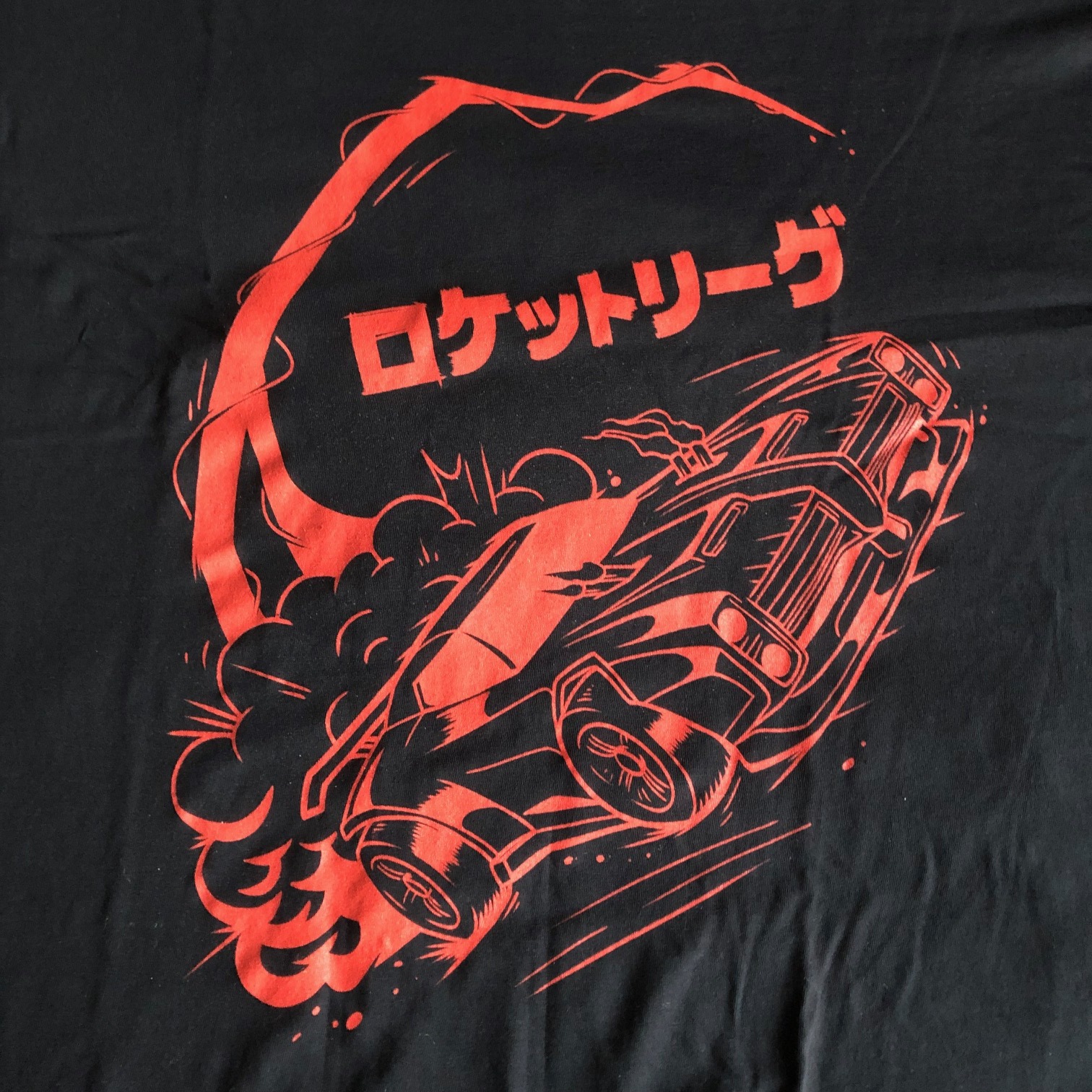 Moving onto the shirts, the first is this awesome red Chibi Drift shirt. Here you have a classic car associated with Rocket League complete with a stereo on top and streaming a music note trail behind it. This kinda had a throwback feeling for me because the design reminds me of old Tonka Truck shirts I used to own as a toddler. This is very well done and choosing to make the shirt the same color as the car was a wise choice. This is definitely a winner in the set.