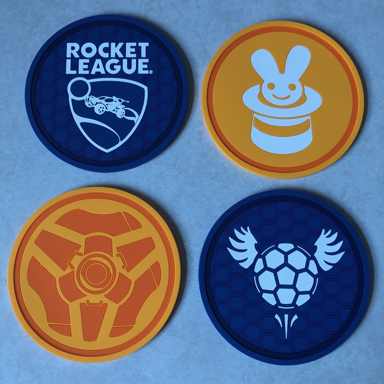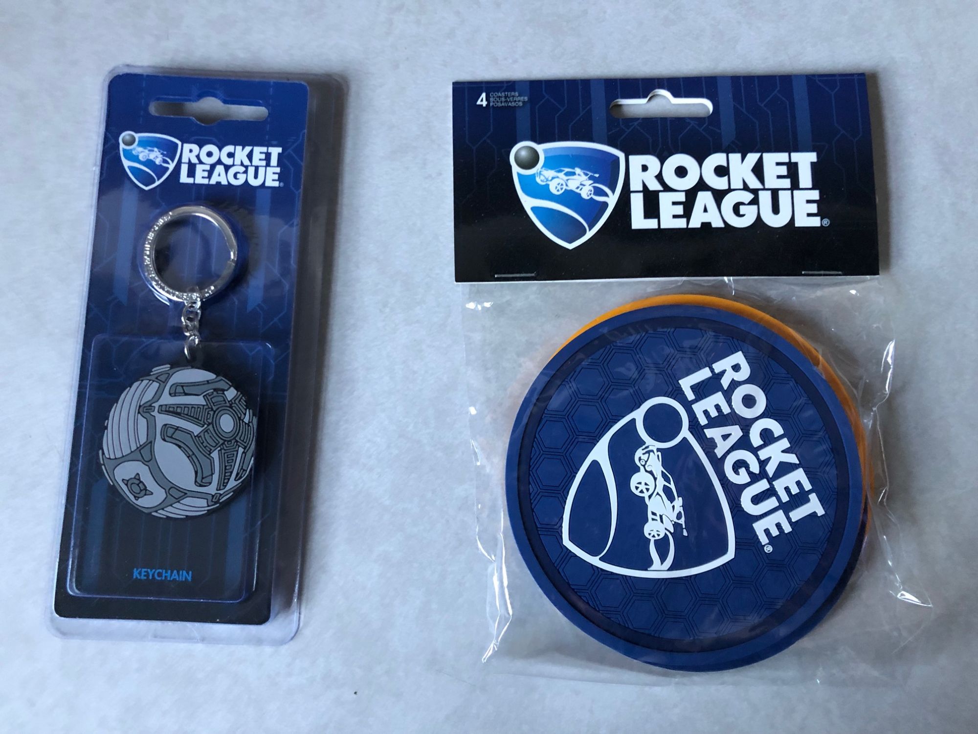 The other non-clothing item we received was a set of four Rocket League coasters. These are pretty simple as they represent symbols and art you see in the game (like the Sky High and Hat Trick symbols), along with a logo of the game. You get two yellow and two blue to represent both sides, all of them a soft and bendable rubber with a texture on the glass side and a smooth coating on the back that makes it easy to sit down on a table and not slide around. These are pretty good as coasters, the only issue we had is that they smelled weird out of the package. If you buy these, we recommend washing them first.