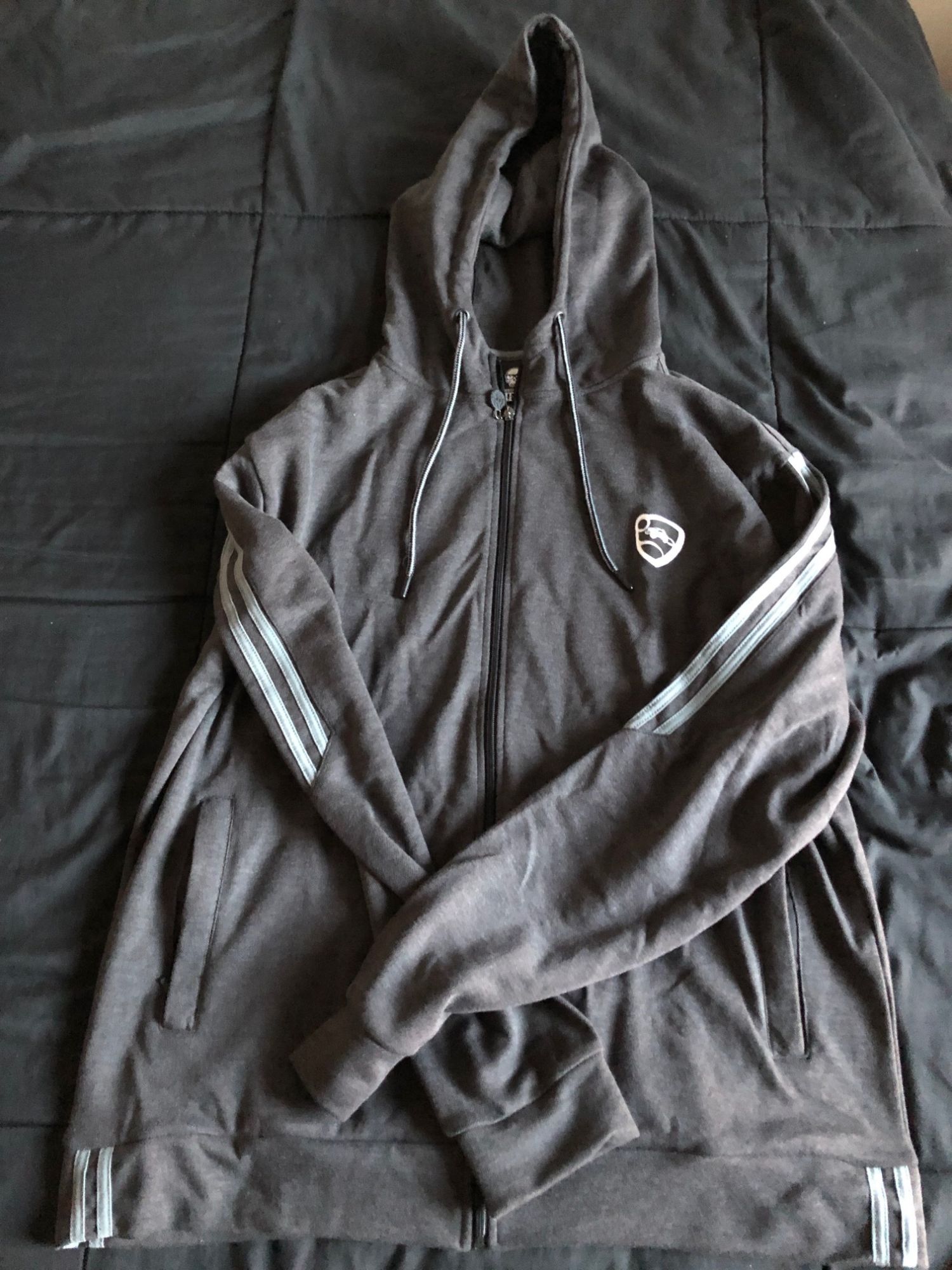 Finally, one of the best items we've gotten in a while for clothing is this official Rocket League Futsal zip-up hoodie. This is basically a workout hoodie that gets some of the design choices from Europe fashion, while still keeping the look and feel of a track jacket. Like having a pair of racing stripes go up the biceps. You get two front pockets that zip up, a front zipper in the shape of a Rocket League ball, and an emblem on the front left chest. This hoodie makes you look liek you're training on an official Rocket League team! And yeah, they don't exist. But who cares? This looks awesome!
