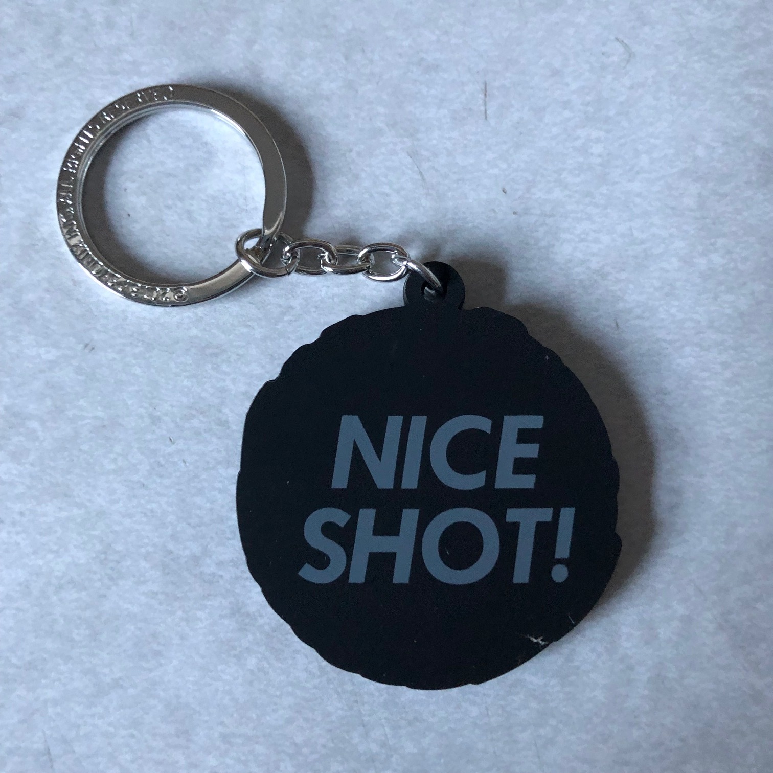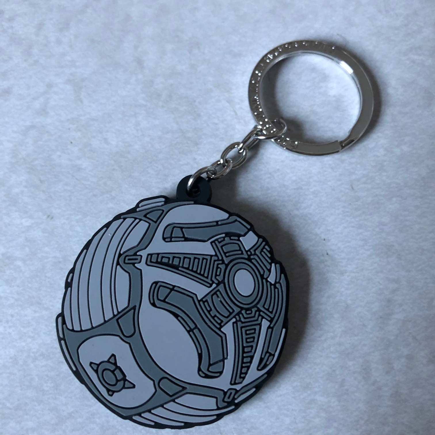 We'll start small with the Rocket League keychain. This is pretty simple as it's the ball you play with in the game, made to be a flat rubber ball that hangs off your keys. On one side it looks like the standard soccer ball while the other says "Nice Shot!" It's a pretty decent item to throw on your keys if this is what you're looking for.
