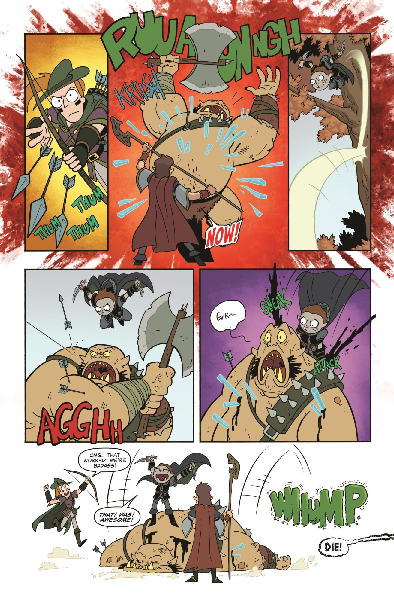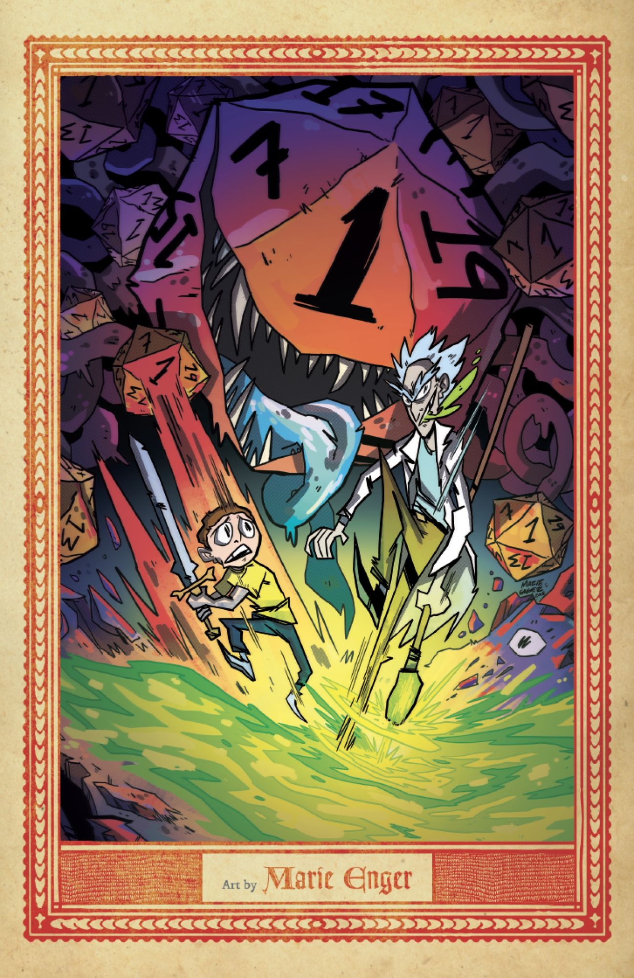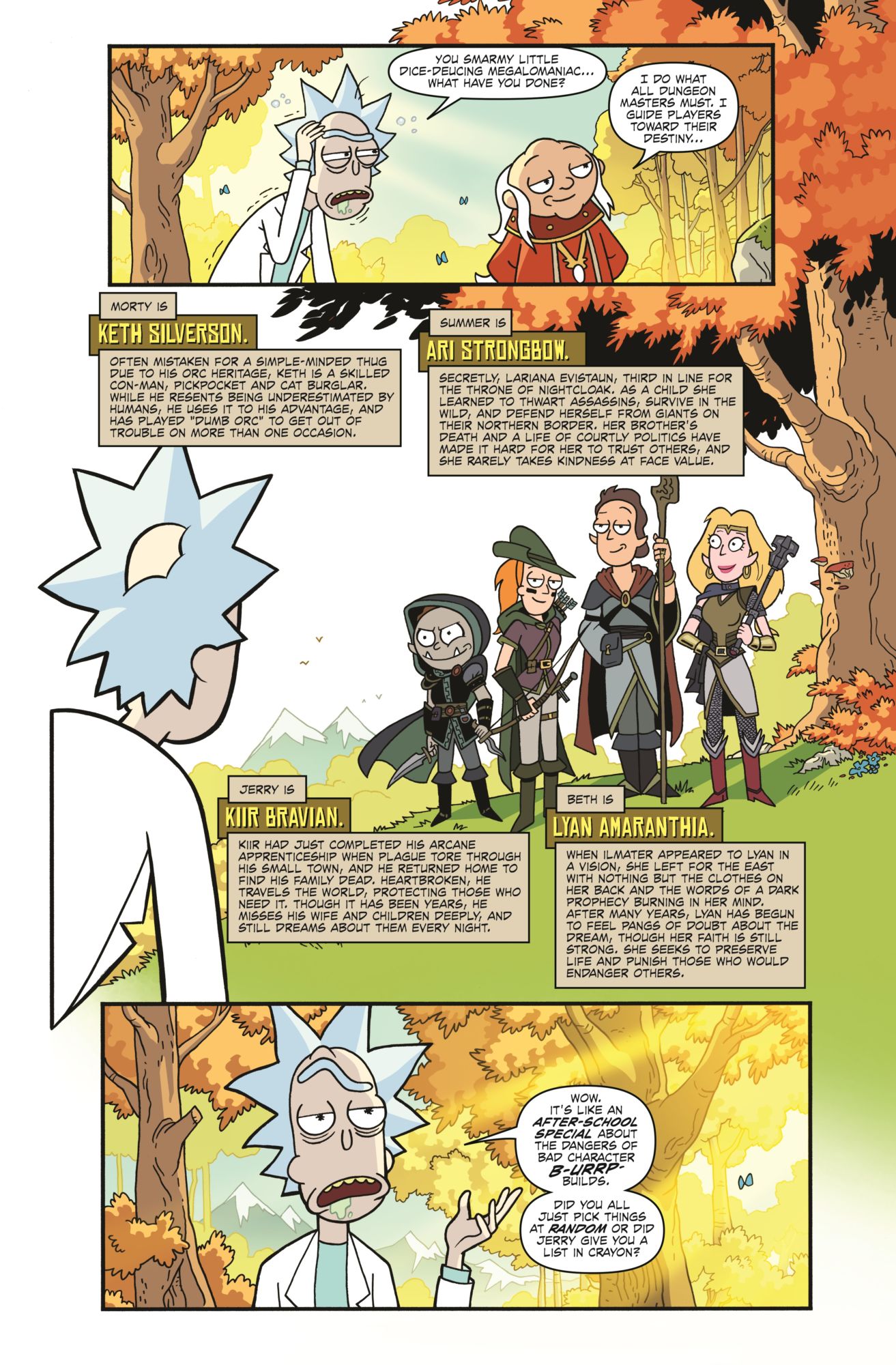 So let's start with the main portion of this book, which is the four-issue run of the original Rick and Morty vs. Dungeons & Dragons comic. If you thought R&M was meta before you picked up this comic, you have no idea how meta the meta can get. This is fourth-wall breaking through multiple dimensions as the story examines what happens when Morty sees that D&D is being played by students at his school and he thinks maybe jumping in on the adventure might get him laid. When Rick gets wind of the sudden interest, instead of calling it lame, he is overjoyed that his grandson has taken interest in something he once played and decides to show him the ropes as only Rick Sanchez can. Of course, nothing goes as planned and everything about their adventure through the realms both virtual and real become a twisted look at the various ways the game is played and the personalities who come to roll a few dice.