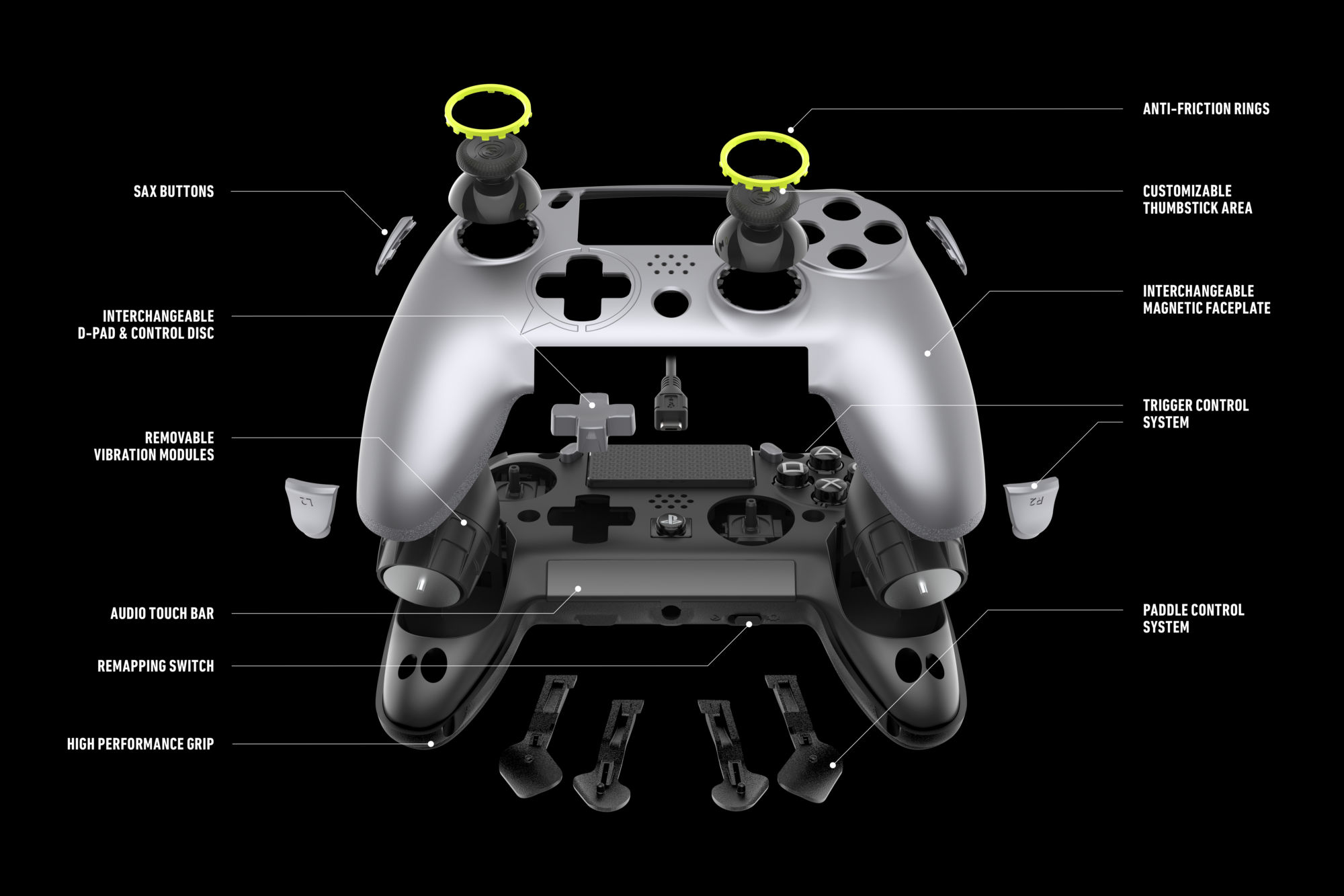 As we mentioned before, the SCUF controllers tend to be customizable, and this is no exception. As you can see from the diagram below, you can change out pretty much everything as you need to, from the faceplate to the height of the buttons, to the color around the analog sticks. This has always been a big deal for me, as certain buttons don't feel the same on every controller. Sometimes they need to be more prominent and easier to find in a pinch, other times your finger needs to glide over it as to not hit the wrong button. Having the ability to swap out has always been a feature I treasure in these controllers.