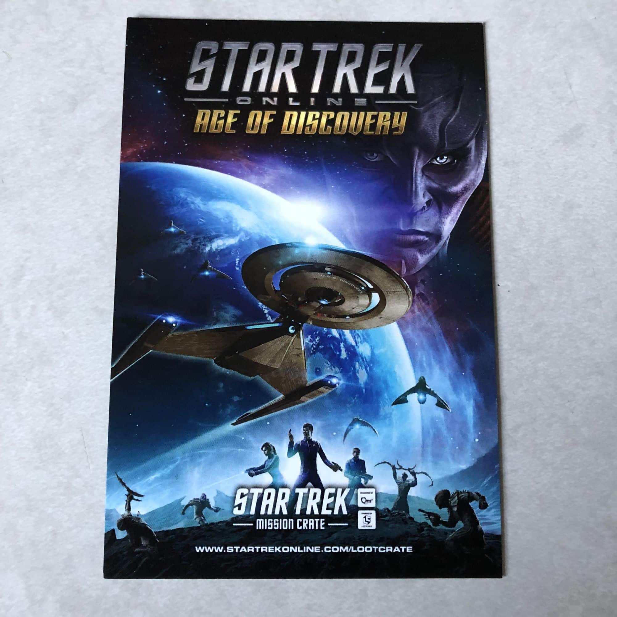 We'll start with the smaller items first, beginning with another code for Star Trek Online during the Age of Discovery event. We can't show the back of the card, but essentially it's a code to get some bonus content for the game and add to your collection of things for your profile. It's a nice little incentive in case you happen to be playing the game.