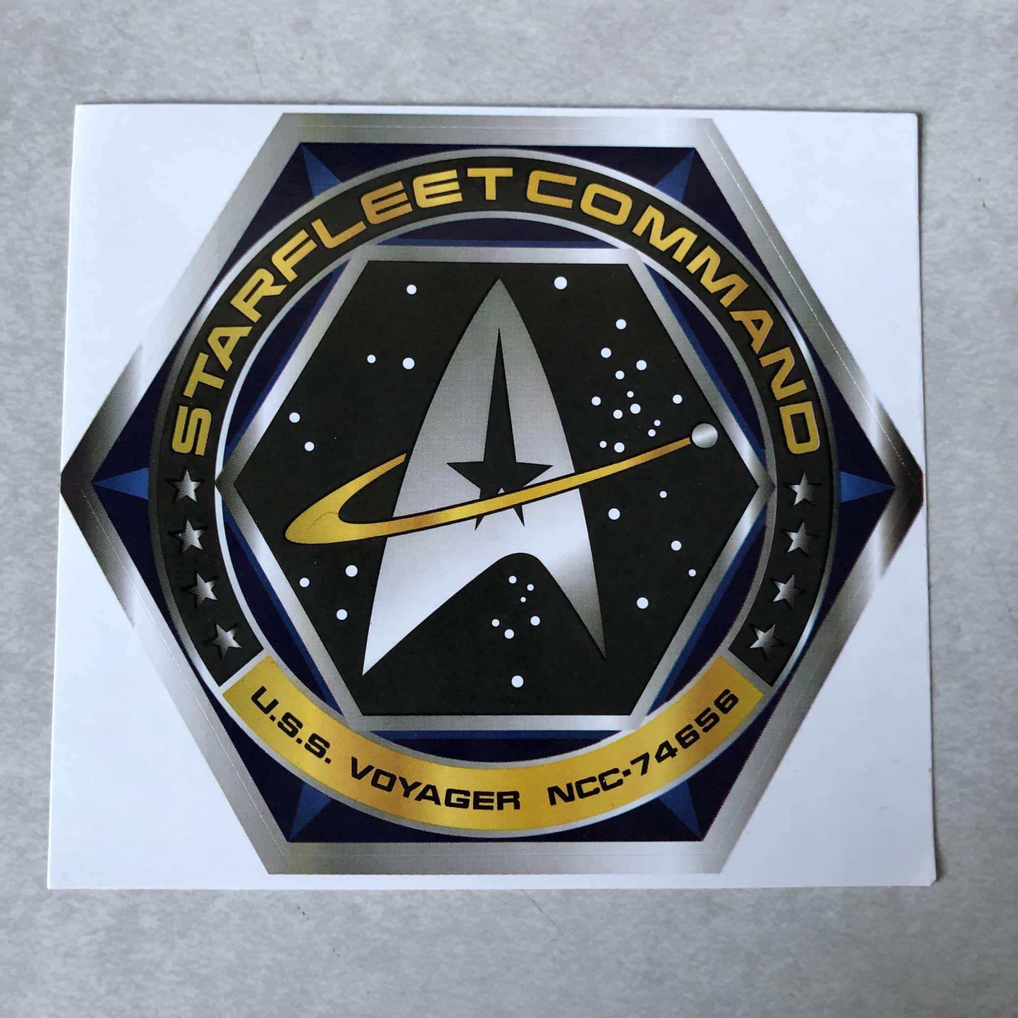 Next up, we got a sticker for the U.S.S. Voyager from Starfleet Command. I always find the branding the minds behind Star Trek choose for certain things to make it feel like a futuristic military operation, as this is the kind of thing that might be a patch on someone's uniform in the modern day. It's a nice little sticker but isn't what I would call super creative with just a small dot circling around the insignia.