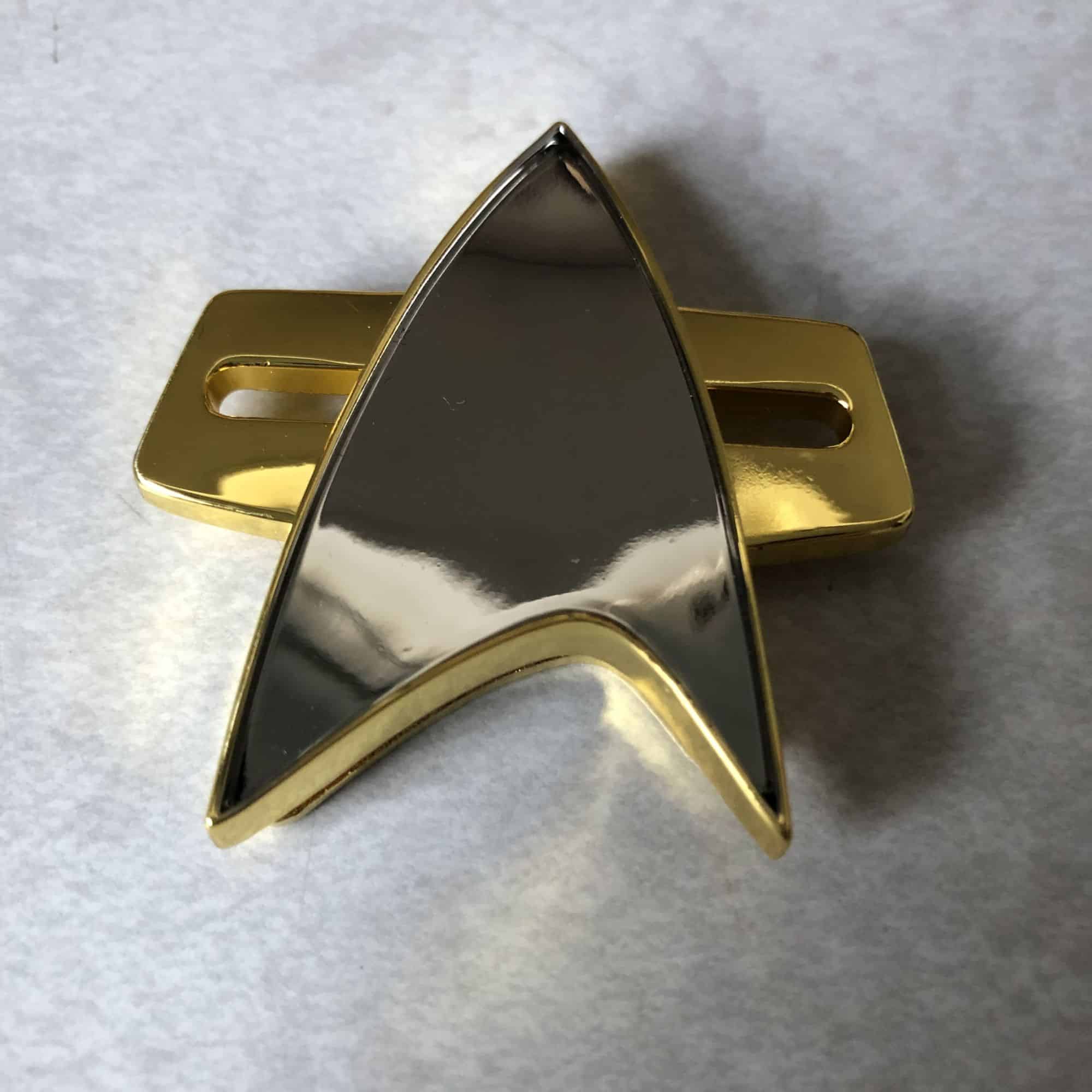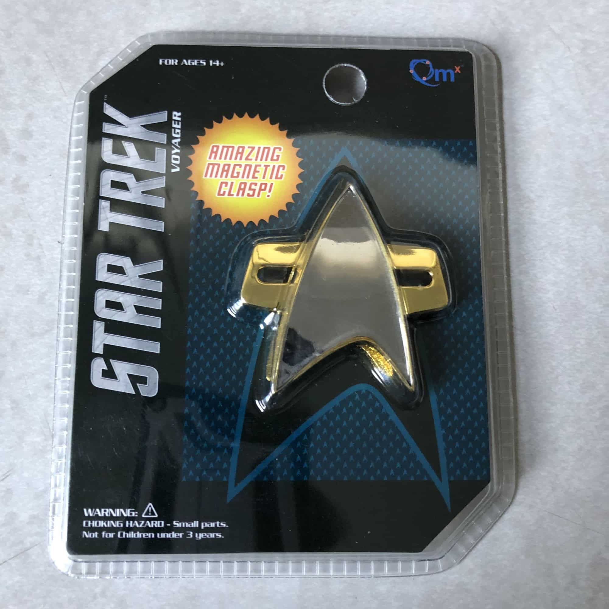 Moving to the badge in this one, we have the final look of the badges used in both Voyager and DS9 with the bars behind the Starfleet insignia. Like previous Qm badges in other boxes, this is a magnetized one where you put the back behind the clothing and then a pretty strong magnet keeps the front attached to you. The only issue I have with this badge is that it's slightly smaller than the traditional version, which I actually have a replica of for cosplay and fan purposes. It's a couple centimeters, but its a noticeable difference, especially to hardcore fans. Beyond that, I love it.