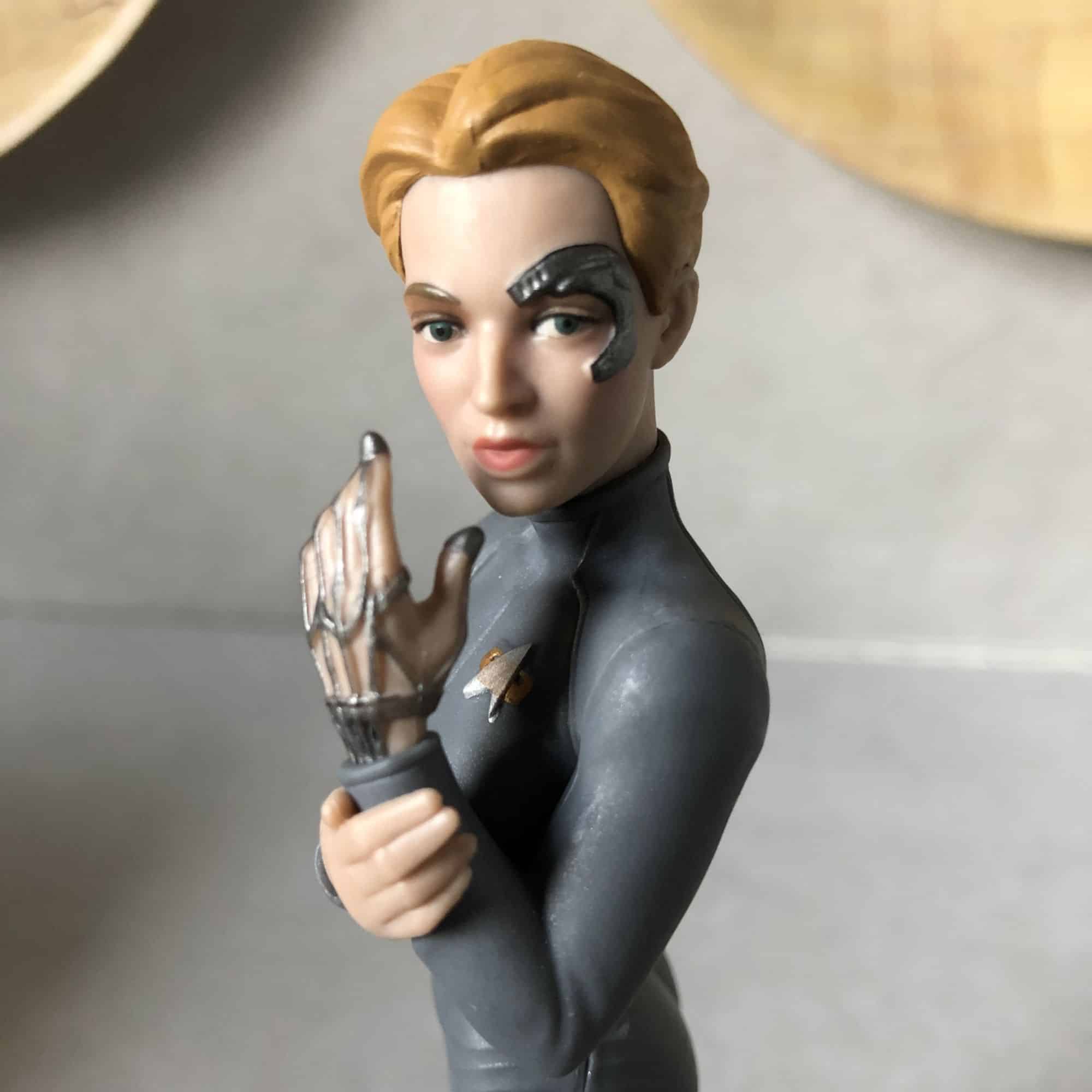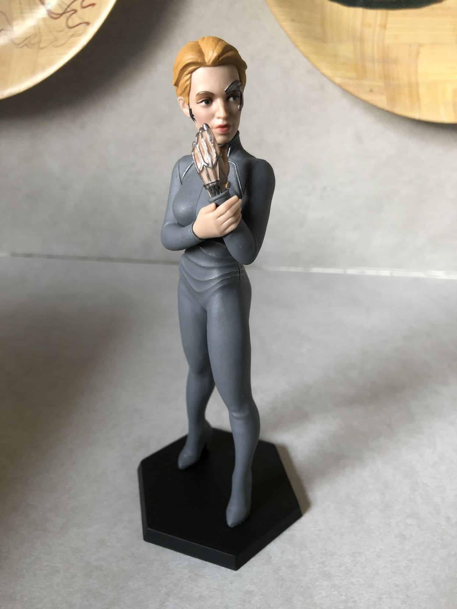 We got another item from Qm in the form of a figure, this one of Seven Of Nine as well. Previous figures have been of Locutus of Borg and Commander Worf that looked pretty well done, but this one is a bit quirky. First off, while the previous two characters looked dead on to their real-life counterparts, the head of Seven Of Nine looks slightly bigger than it should be compared to the body. Keep in mind, this is supposed to be a true-to-form like model, not a caricature. They went out of their way to get her body right, including detailed work on the hands, but then made other parts bigger that didn't need to be like the communicator and her head. This is just… awkward looking, and needs a redesign to match previous versions of what they've created.