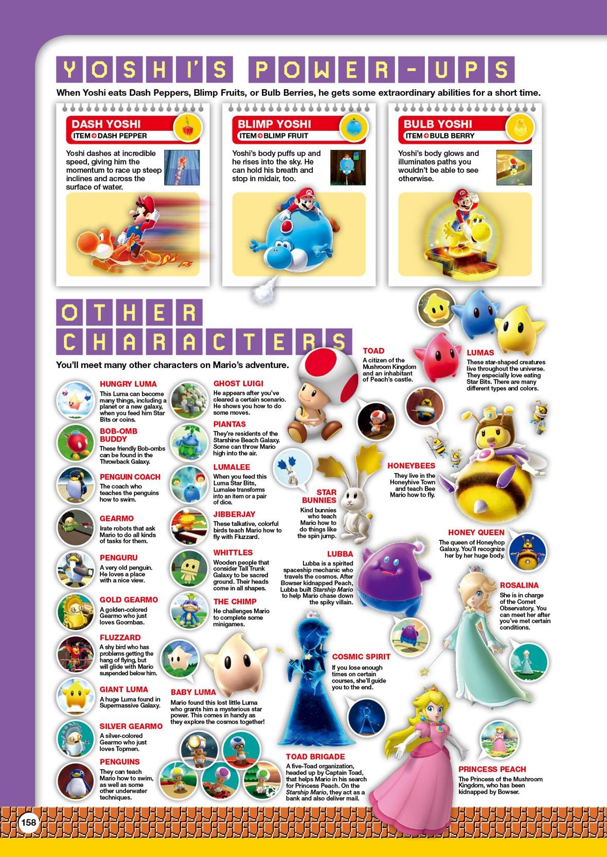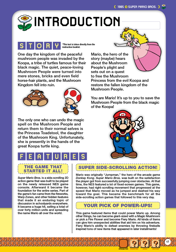 The book is pretty concise in letting you know what the story is for each game and why it's so important that our plumber friend makes his way through the pipes and around every level in order to defeat the enemies Bowser has thrown in our way and rescue Princess Peach. So even those of us who have played these games for years who have questions about why things are the way they are, get definitive answers. That being said, the information you're given does not go into great depth. You're getting a single paragraph, at best, describing pieces of the game and no real commentary from the creators or developers at the time. So the info is there, but it scratches the surface.