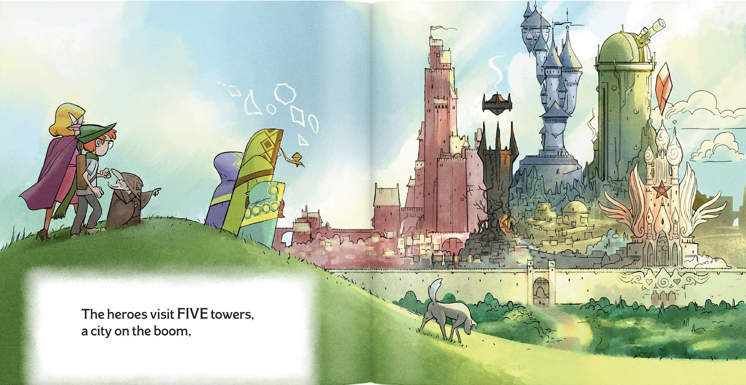 Caleb Cleveland does a wonderful job of putting illustrations in the book that parents can show their kids and help paint a vivid picture of what the worlds of D&D can be. Which, as we all know, is whatever your imagination can create. He's done a lovely job here, as you can see from the picture below, of painting various types of castles and buildings and townships that kids will look at with wonder. It's an awesome way to get them involved with the story and teaching them basic skills at the same time