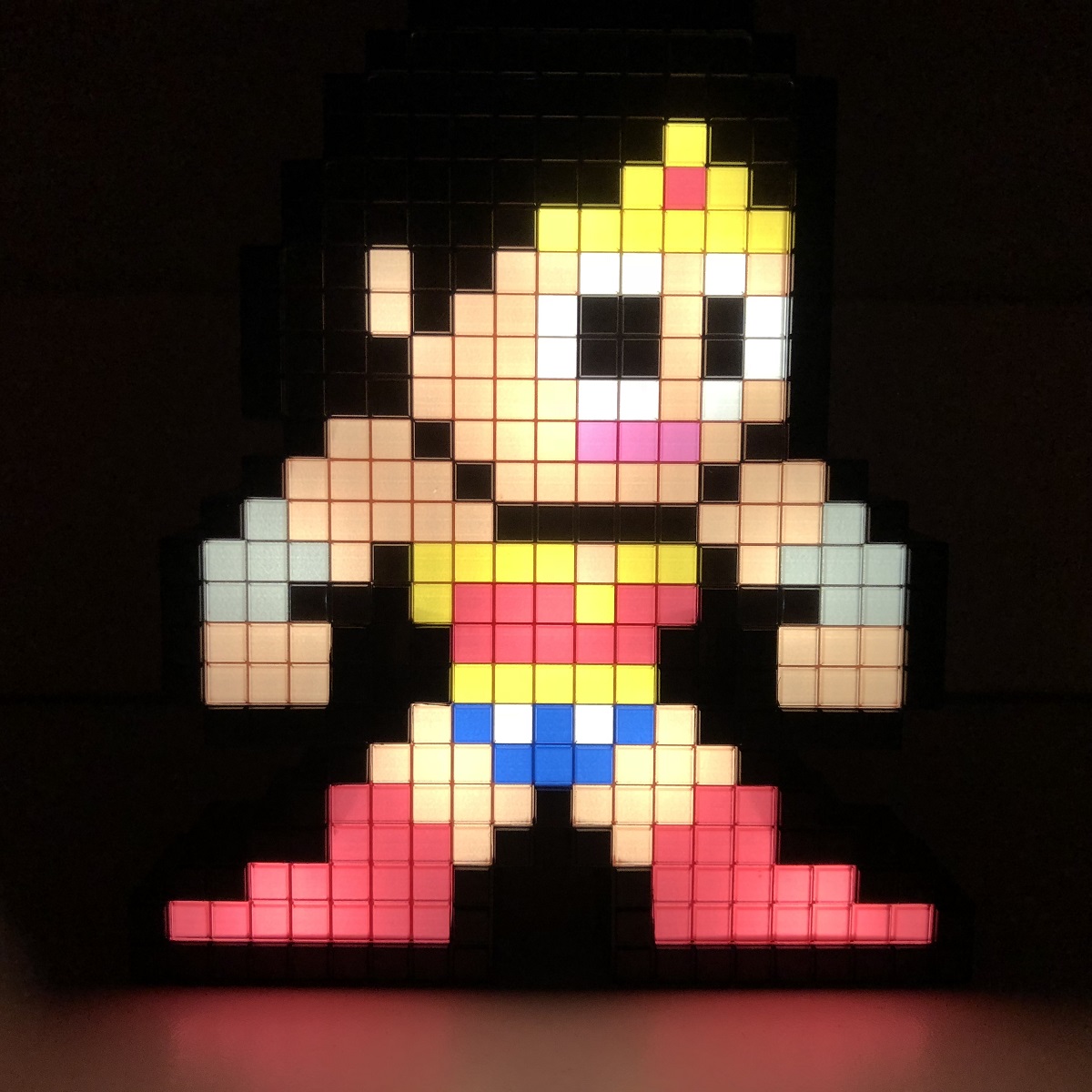 Wonder Woman is a mix of good and bad pieces, primarily because her design is based more on the classic version than the modern versions. The one-piece tights are defined as best they can be for a pixel design, with a pair of white dots to represent the stars on the lower half. Some grey was added to the arms to show off her gauntlets, and the crown is a solid yellow to match the armor with a red dot for the star. Another downside, which you can see in the dark, is that there's no way to light up a person's hair if they're brunette. So from a distance, it kind of looks weird. It isn't bad, but it could use an improvement.