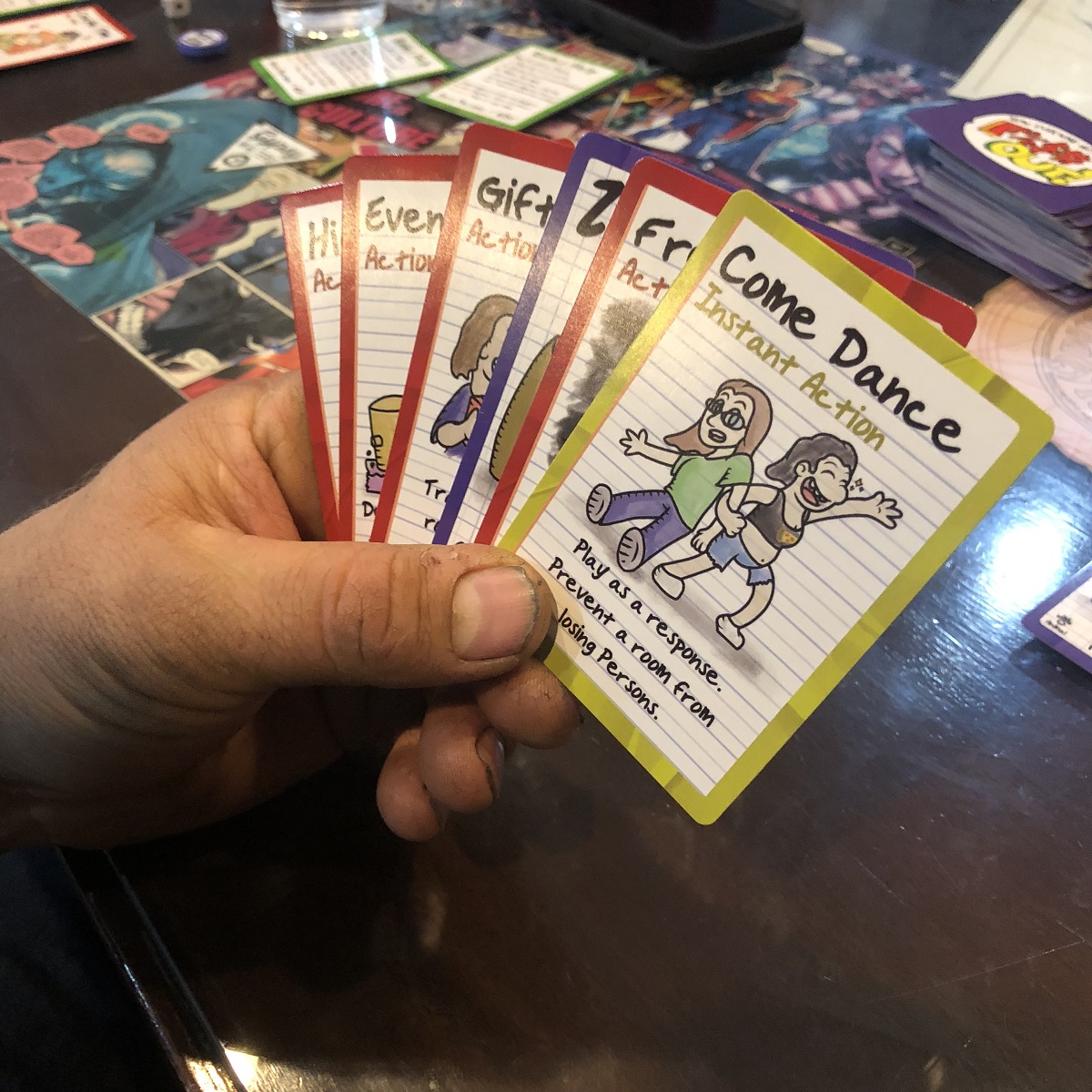 Every player is given a D6 and start with four people in their room (six if two people). The goal of the game is to get down to zero people, which wins you the game. Through different actions on all of the cards, you'll find ways to knock people out of your room or end up with more people joining. However, because dorm rooms are small, you can never have more than six at a time. You'll go clockwise playing different cards from your hand with the ultimate goal of trying to pass on or eliminate as many people as possible, which is a feat much harder than you might expect.